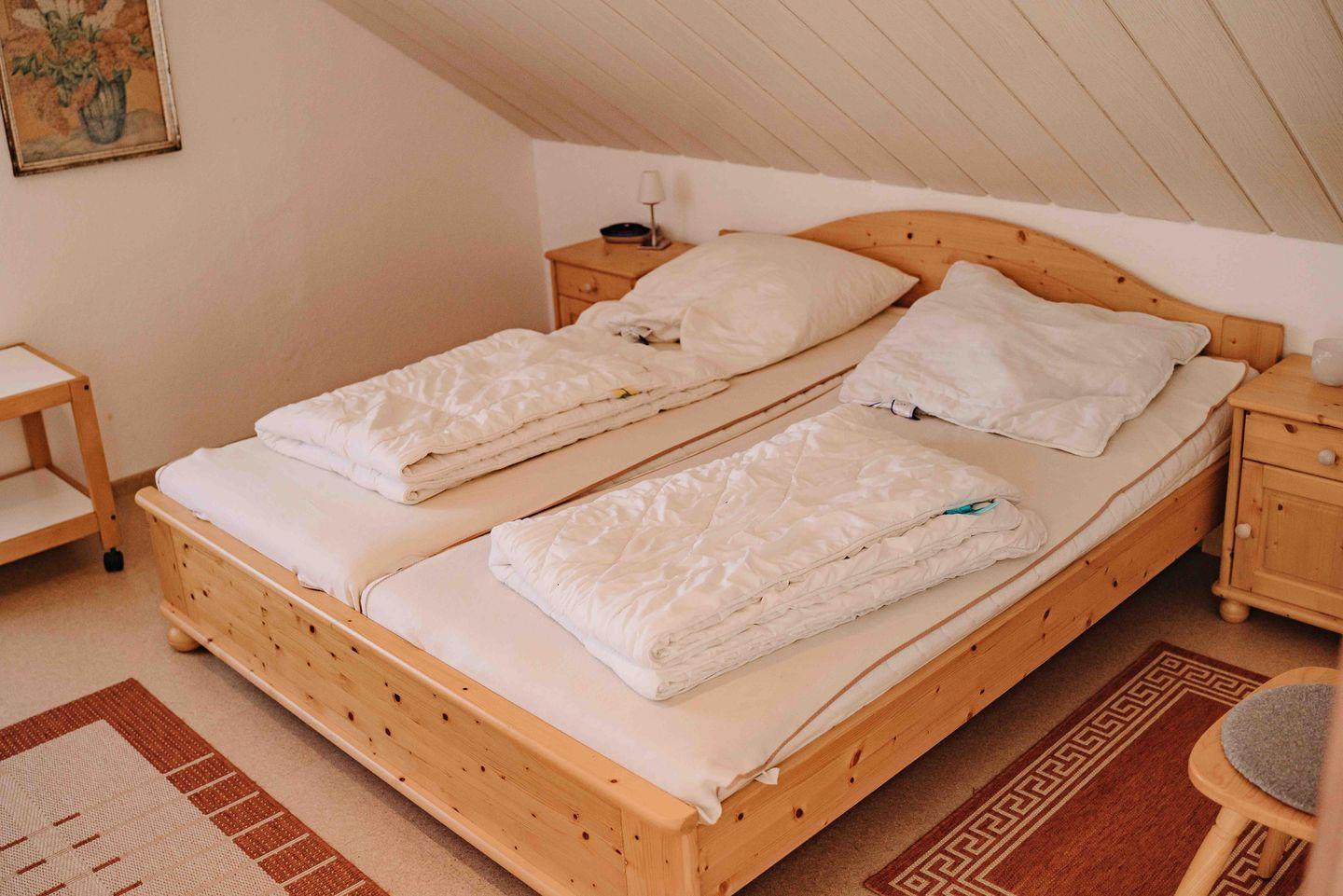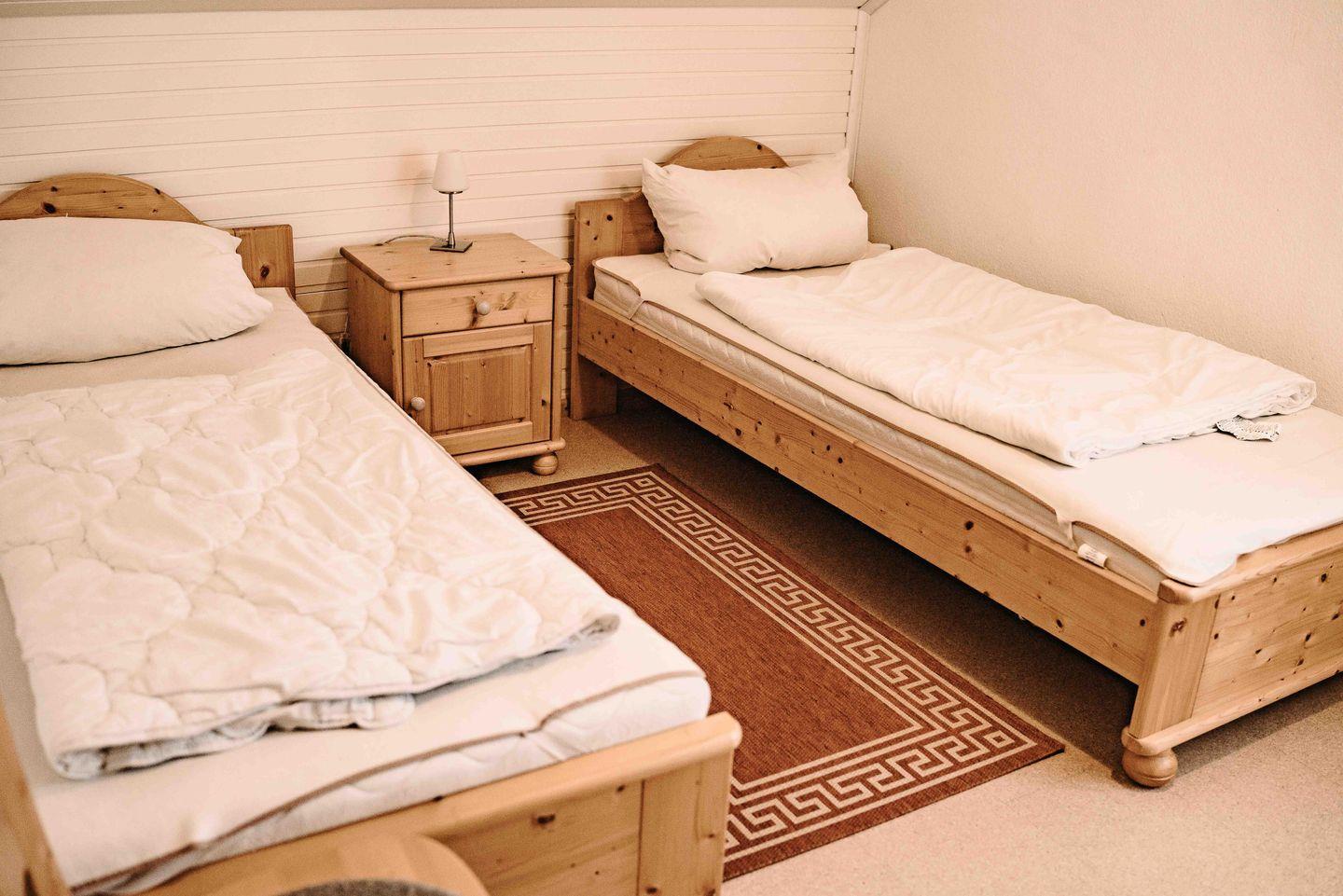 Das kleinere Schlafzimmer ist mit 2 Einzelbetten und ebenfalls einem geräumigen Schrank sowie einem Wandspiegel ausgestattet.