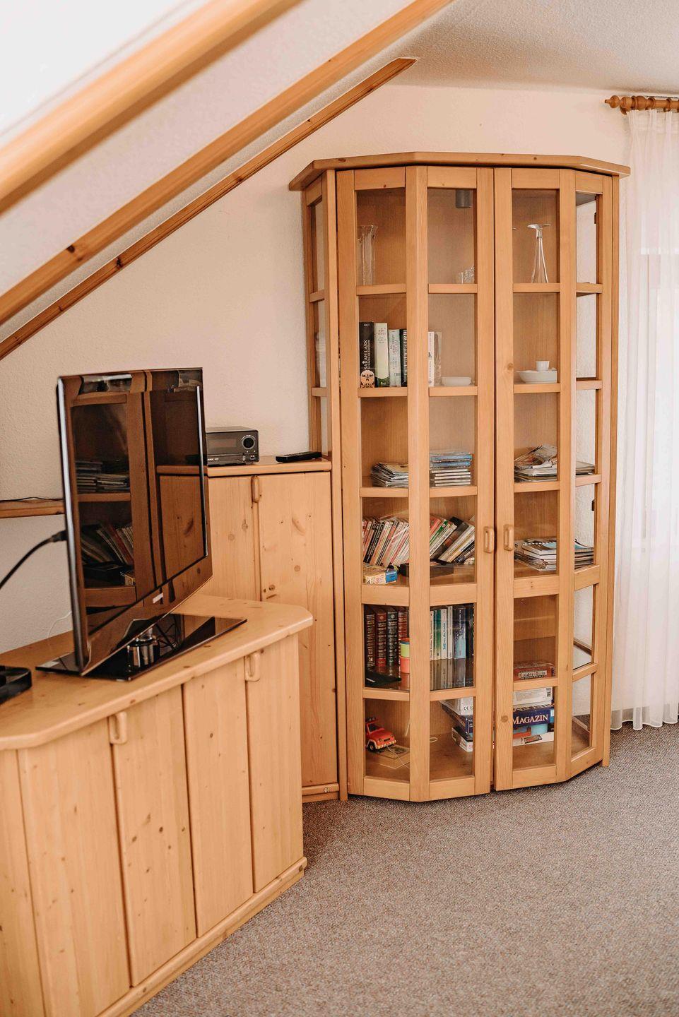 Im Wohnzimmer befinden sich eine Sitzgruppe mit Fernseher (Kabelfernsehen) und eine gemütliche Lese- oder Schlafecke, die zum Entspannen einladen.