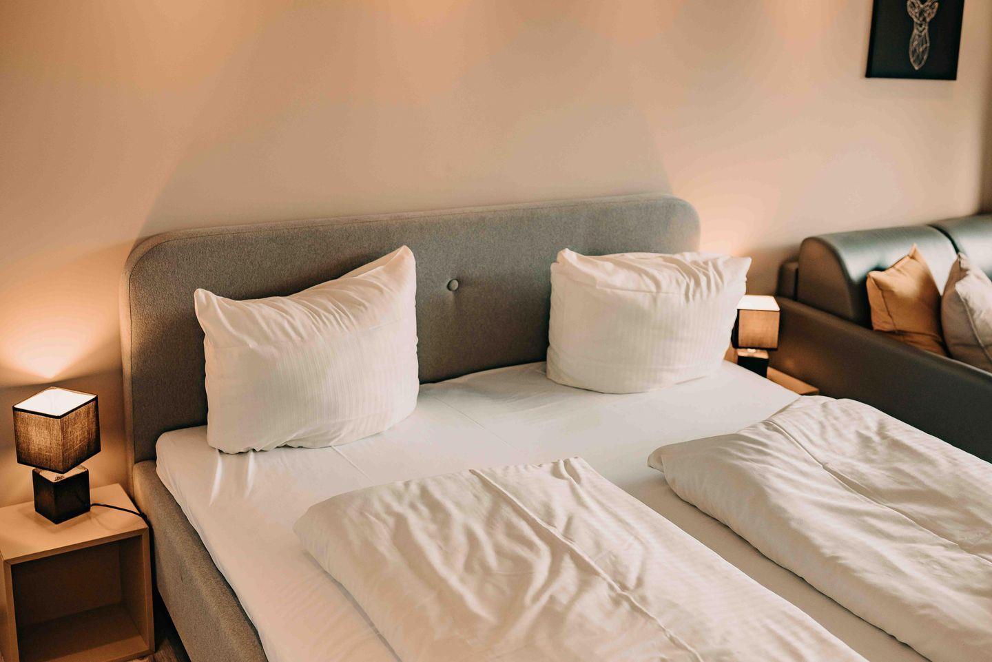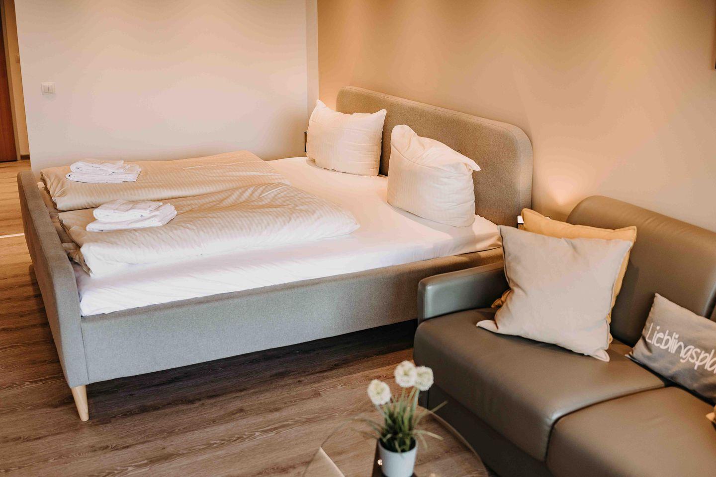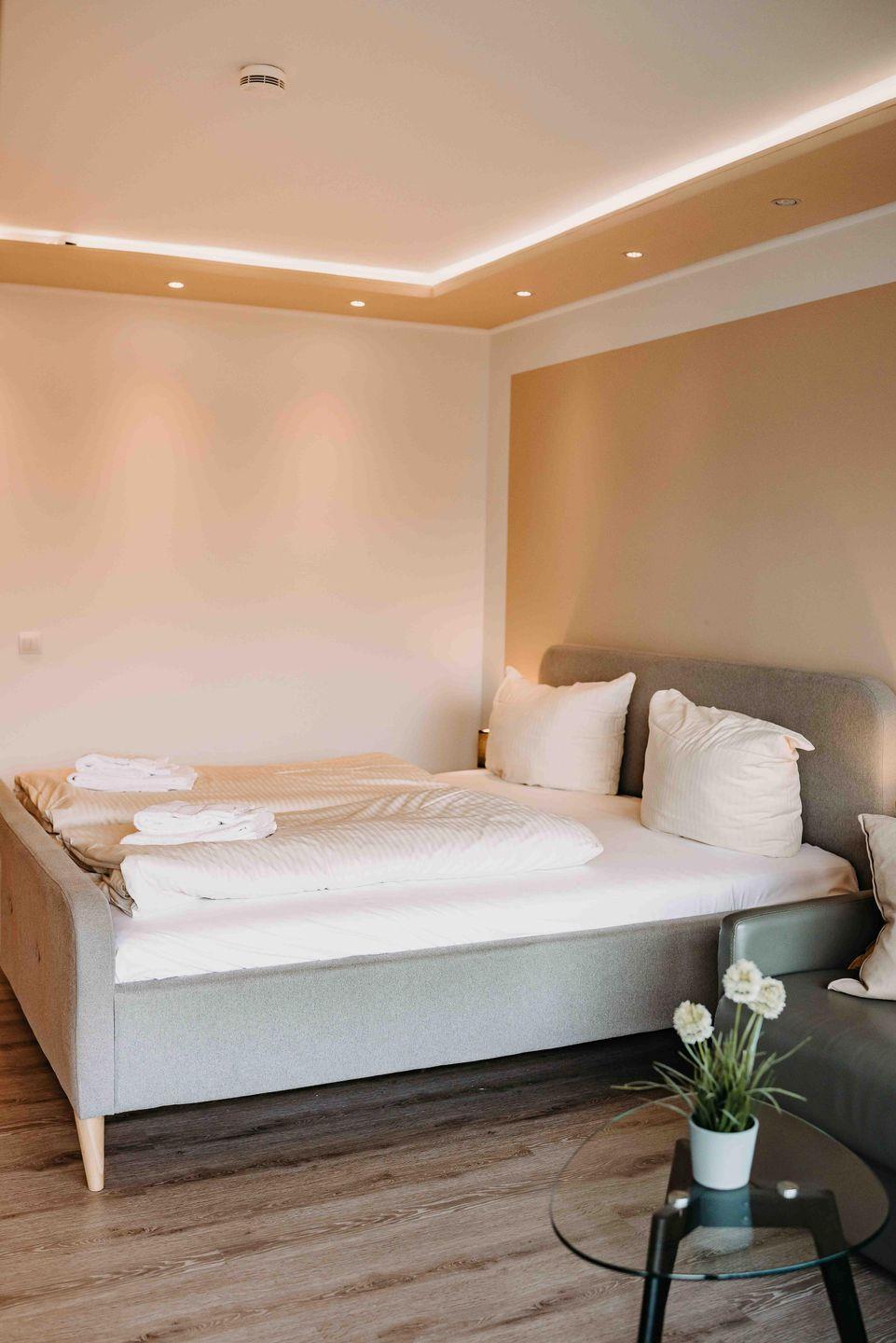 Für erholsame Nächte steht ein gemütliches Doppelbett bereit.