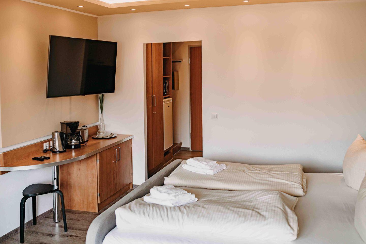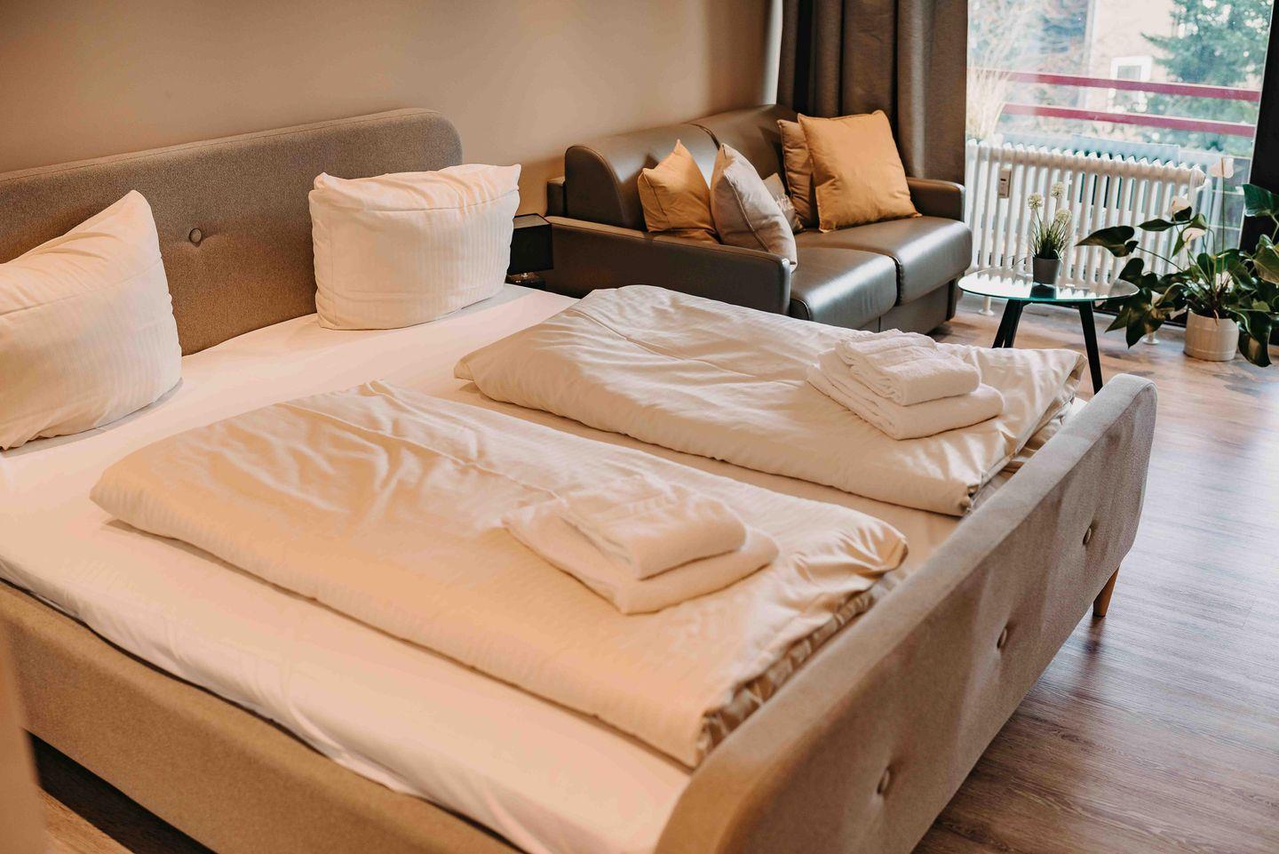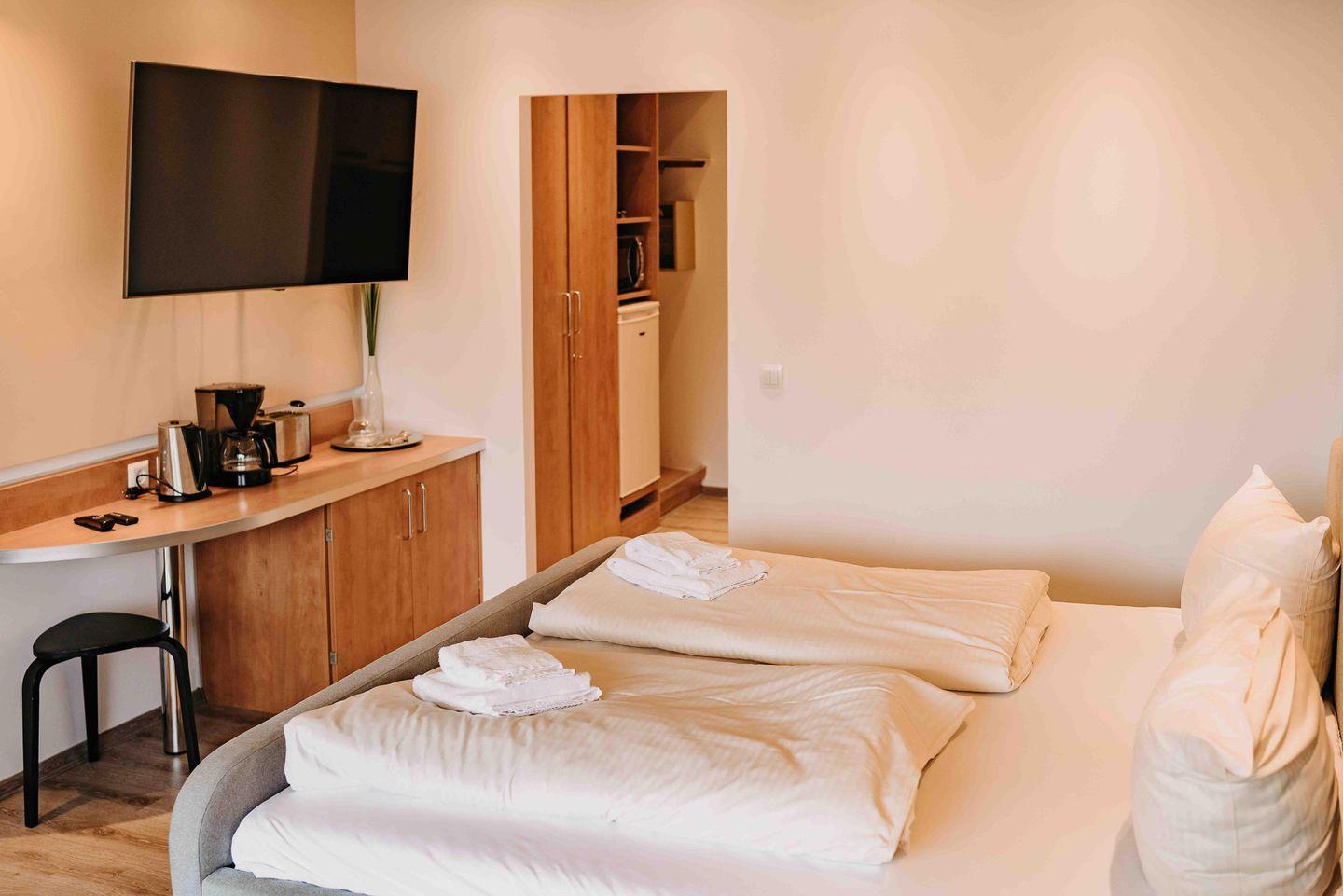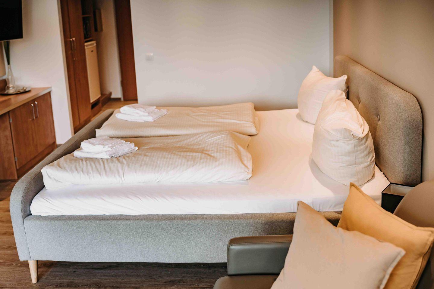 Für erholsame Nächte steht ein gemütliches Doppelbett bereit.