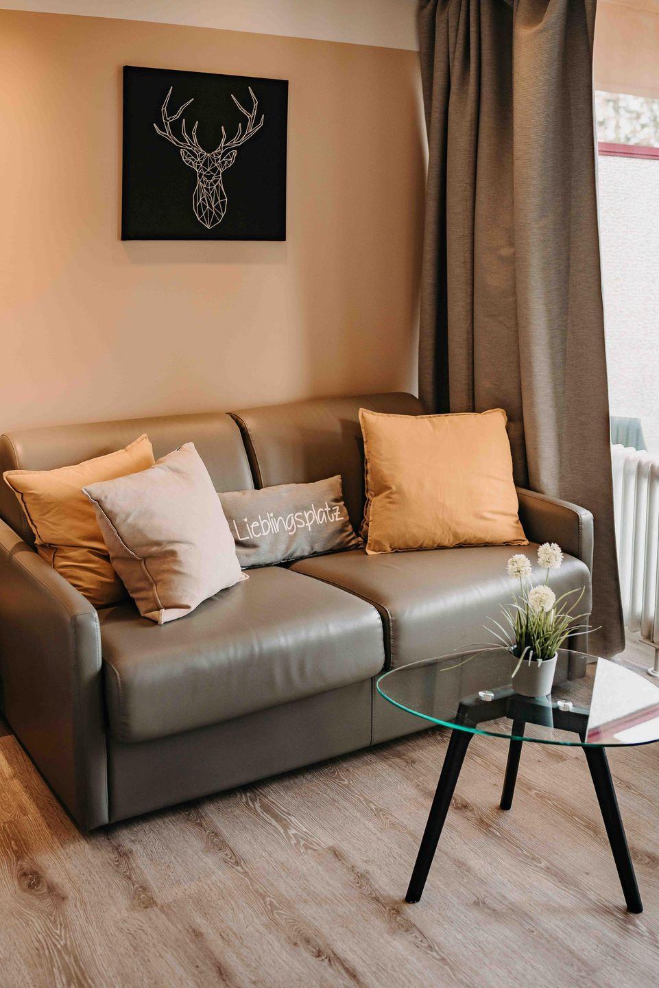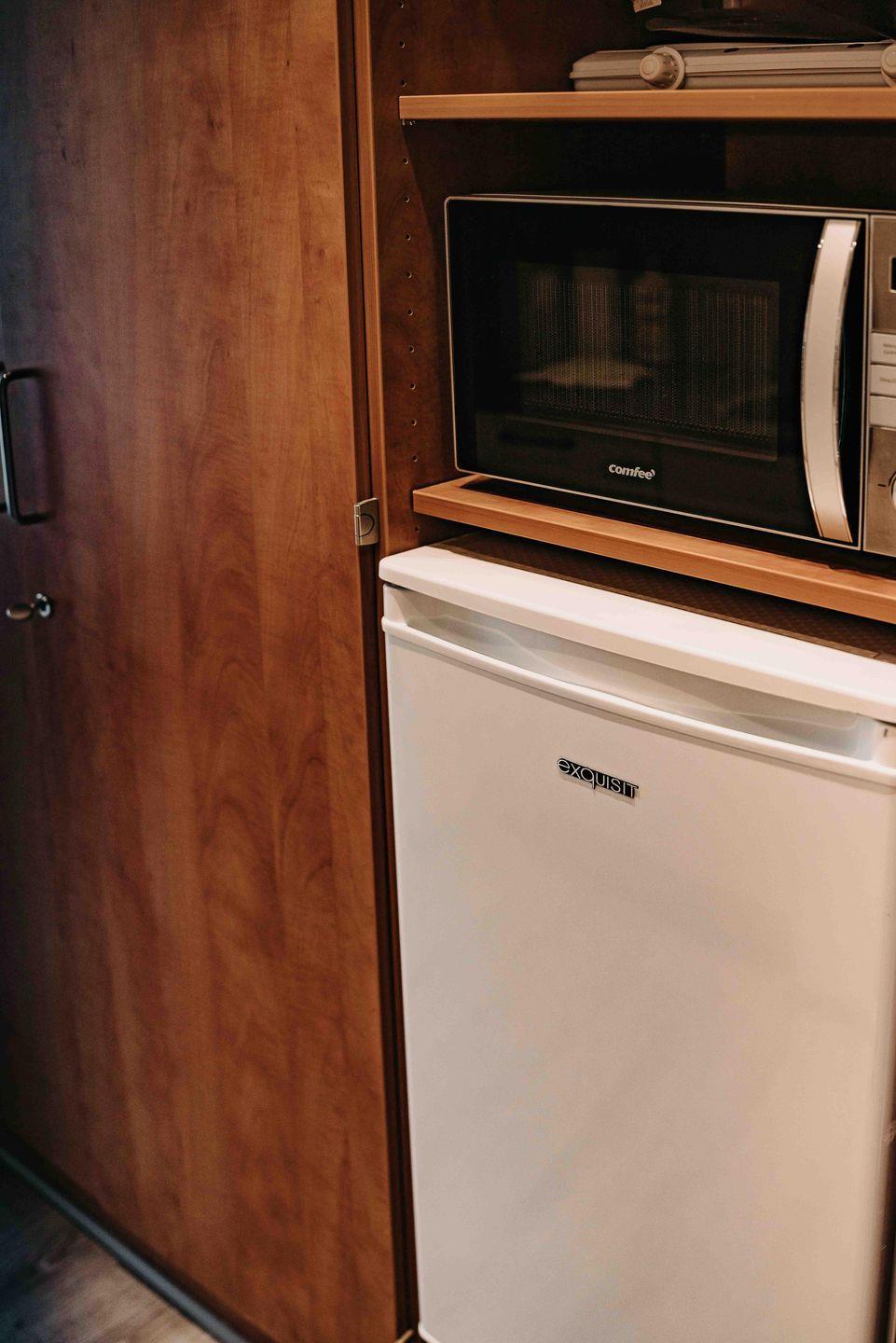 Neben der Schlafcouch auf der man herrlich vor dem Fernseher entspannen kann, steht ein Esstisch bereit sowie eine kleine Küchenzeile, die alles für kleinere Mahlzeiten bietet.