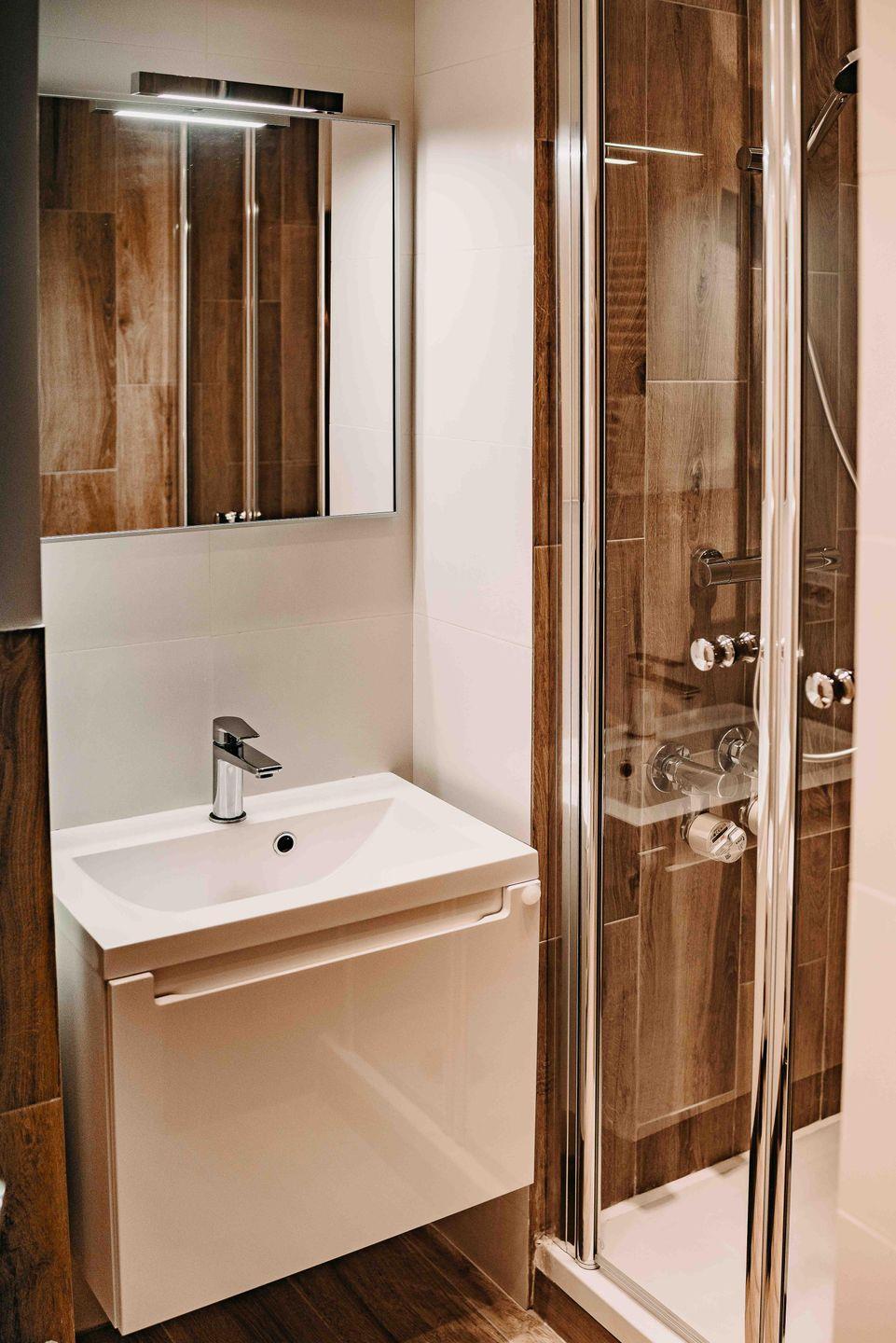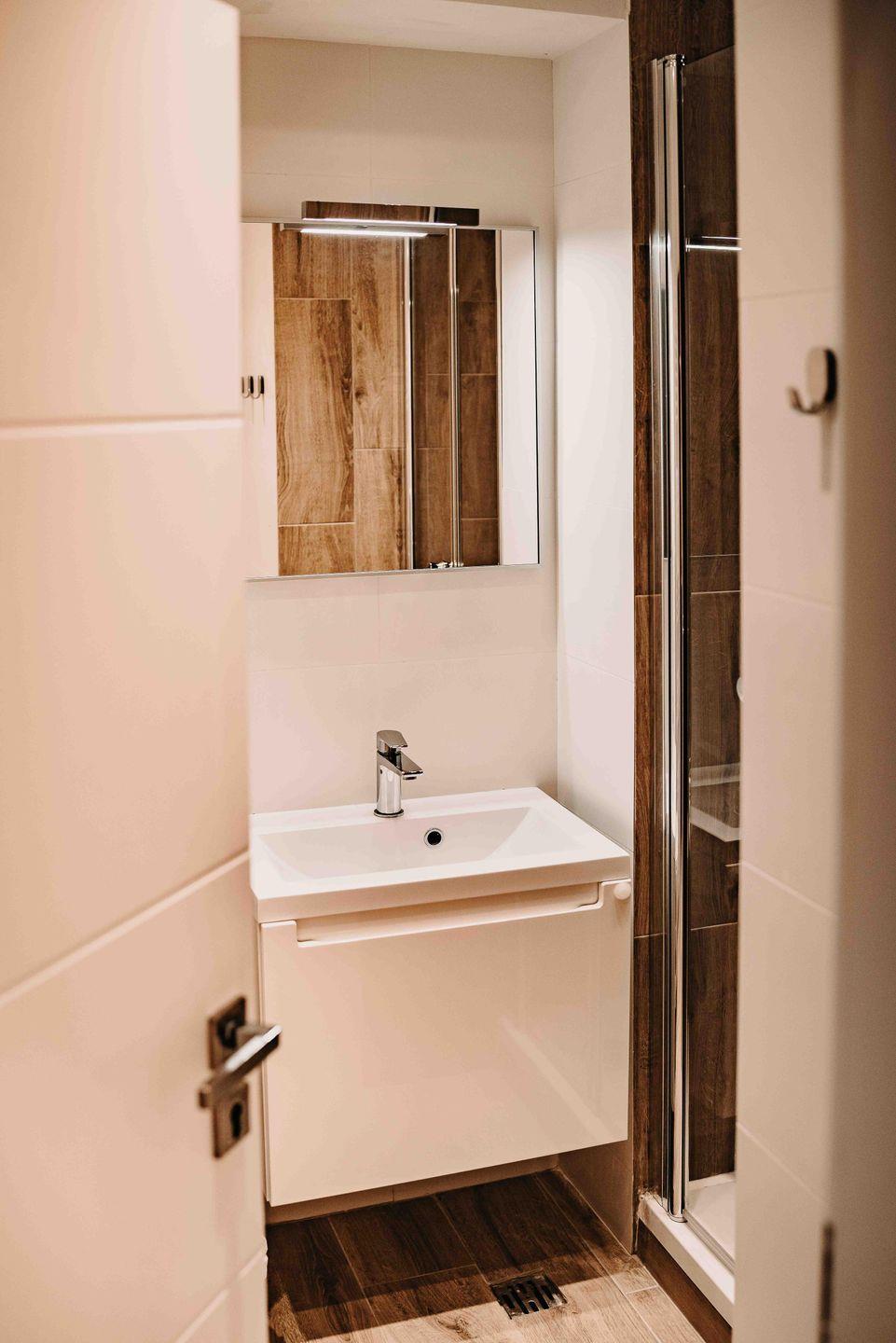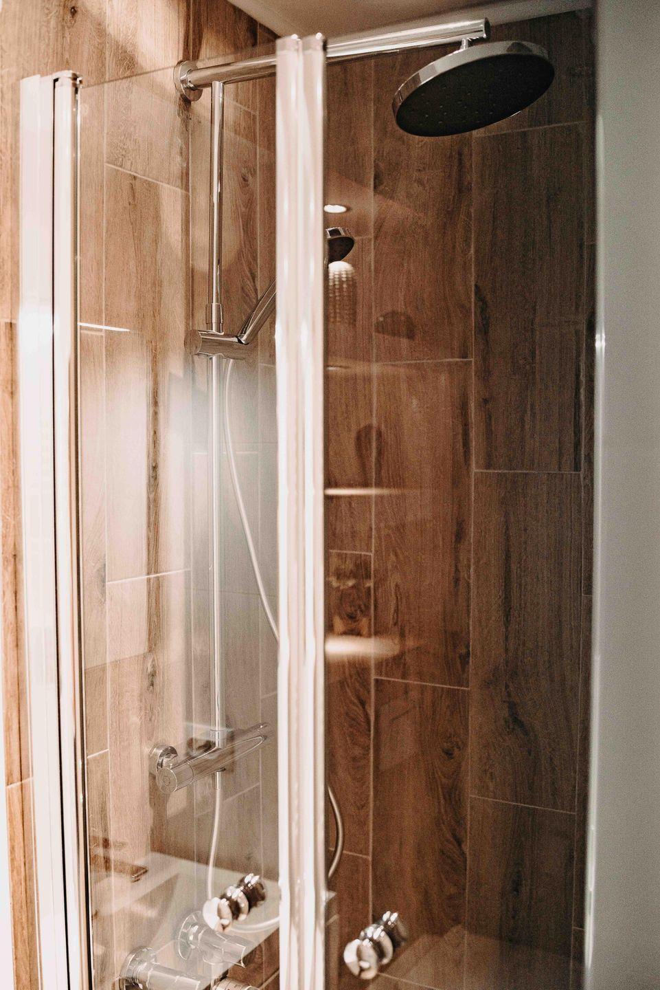 Das Badezimmer ist neben einer Dusche unter anderem auch mit einem Fön ausgestattet.