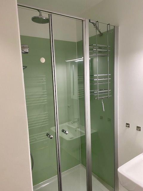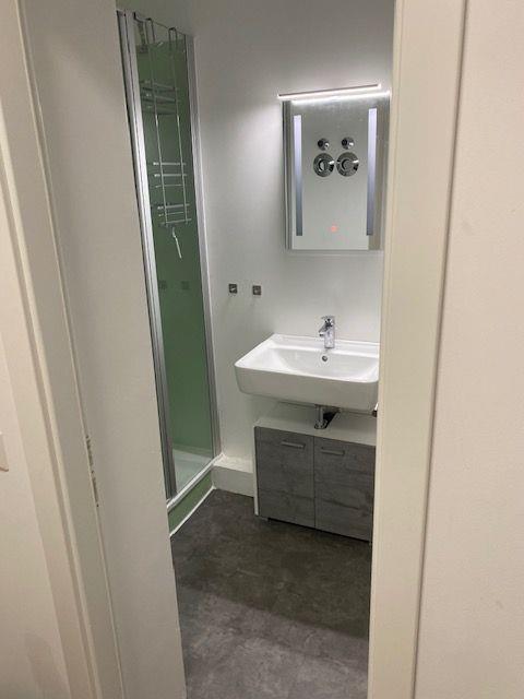 Das Badezimmer hat eine Dusche und einen Spiegelschrank.
