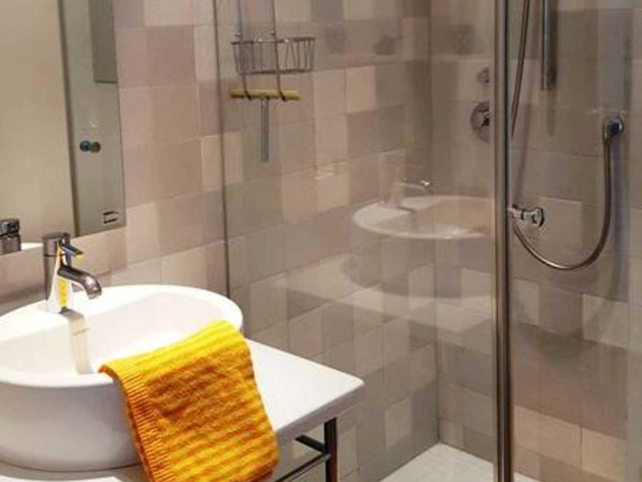 Sanitär: bodenebene Dusche, Föhn, Handtuchheizkörper, Schminkspiegel.