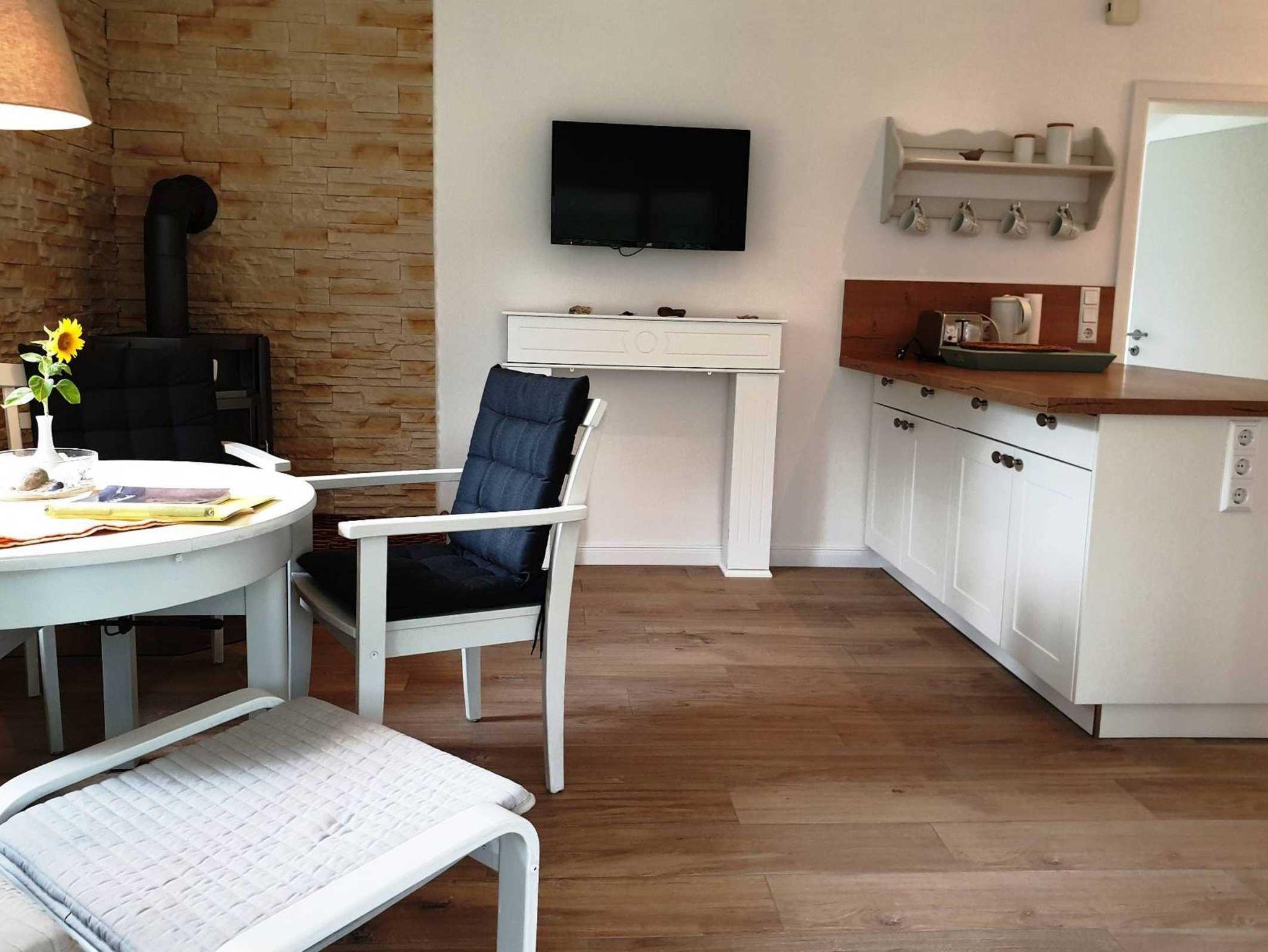 Wohnbereich mit Kamin und Zugang zum Garten. Strandkorb, Gartenmöbel warten auf Sie, damit sie relaxen können. In diesem Nichtraucherhaus sind sind keine Haustiere erlaubt.