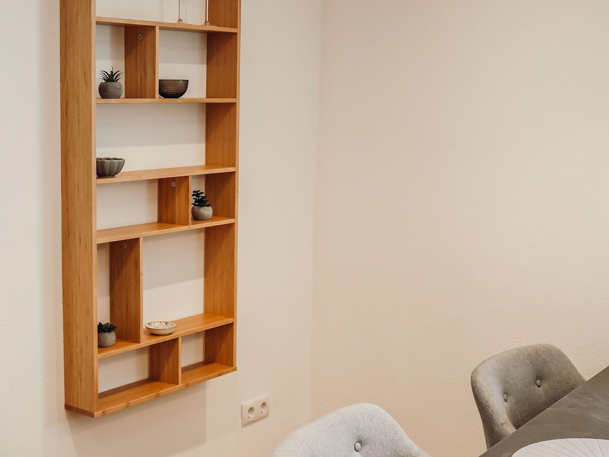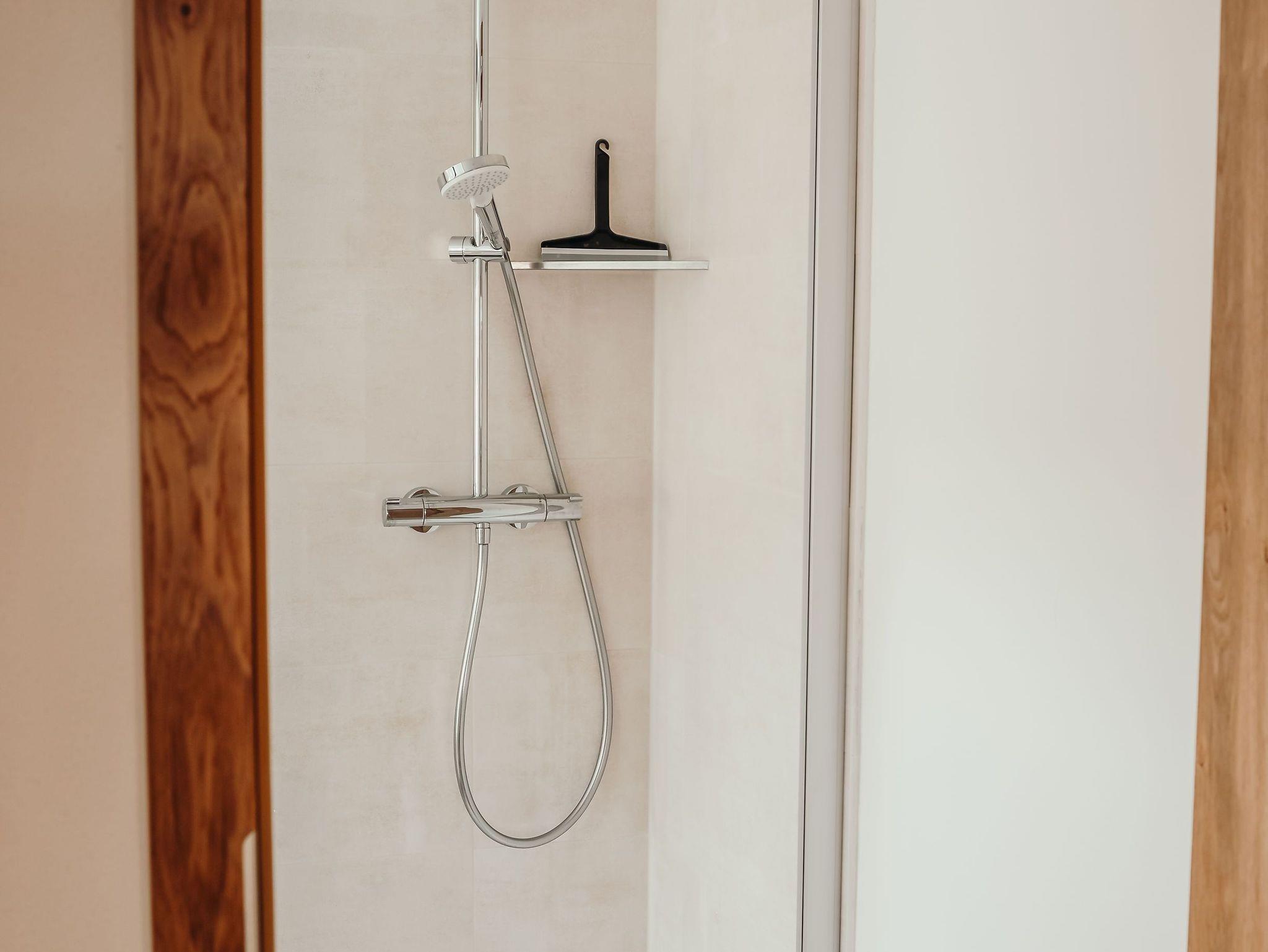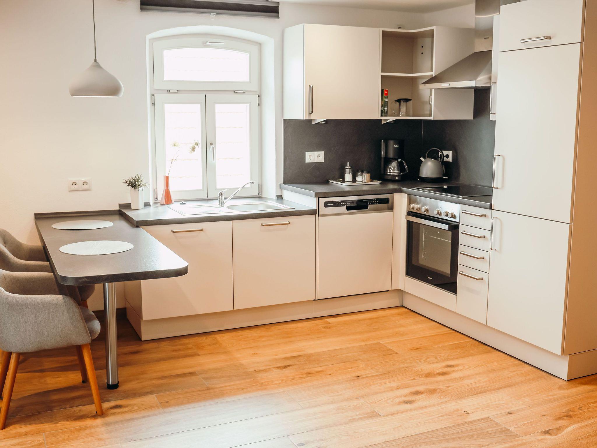 Die großzügige Küchenzeile im Wohnraum bietet allen Komfort wie Spülmaschine, Backofen, Herdplatte und enthält eine gute Grundausstattung an Geschirr, Gläser und Küchenutensilien, sowie Wasserkocher, Filterkaffeemaschine, Kaffeefilter, Geschirrtücher/ Putzlappen, Spülmittel und Mülltüten. Der große Wohnbereich verfügt über ein Faltsofa und einen Esstisch, der an der Küche angebaut ist. Das Faltsofa kann als Schlafcouch für eine zusätzliche Person umgebaut werden. Das extra Schlafzimmer ist mit einem Doppelbett für 2 Personen und einem Flachbild-TV ausgestattet. Das Tageslichtbad hat eine ebenerdige Dusche, WC und einen Fön.