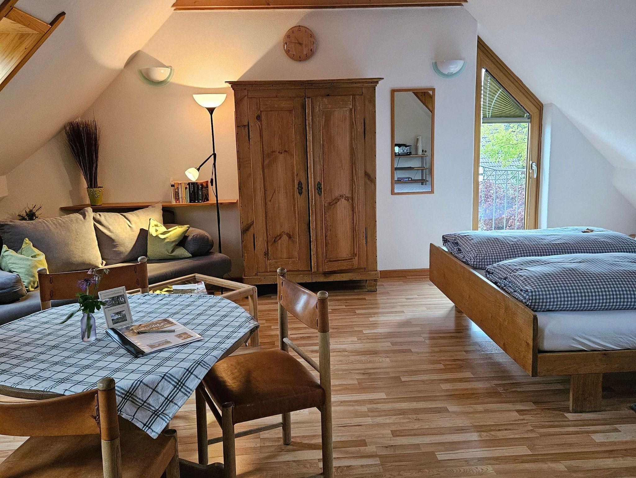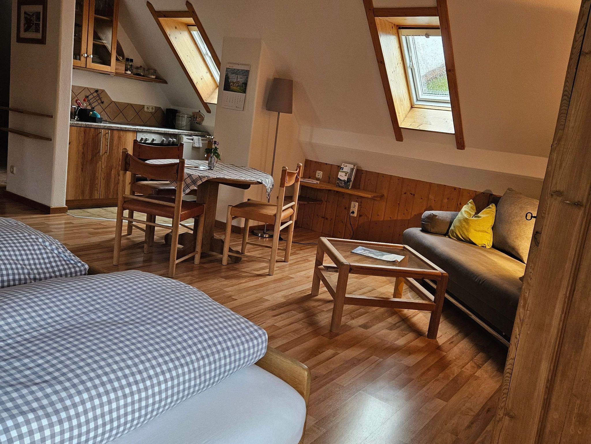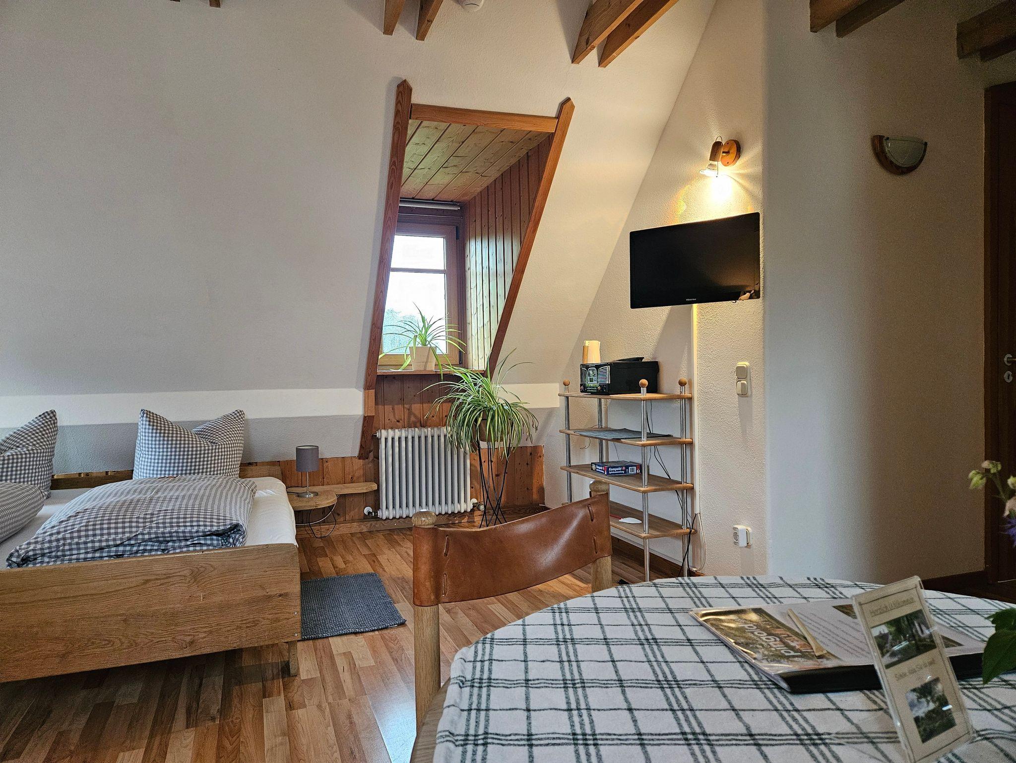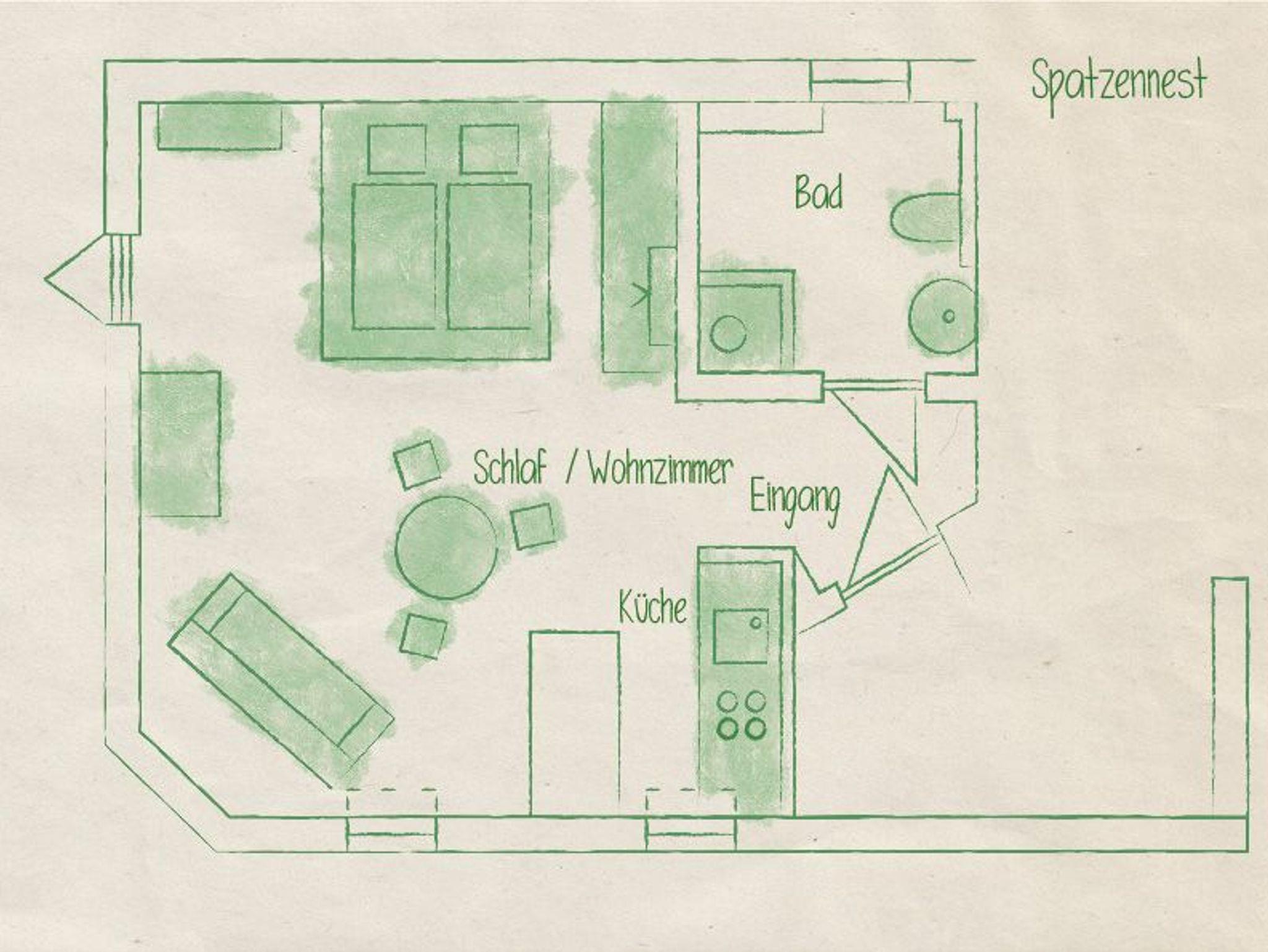 Unser Appartement ?Spatzennest? befindet sich im zweiten Stock unseres Gästehauses. Sie wohnen in einen großen Wohn-Schlafraum (30qm) mit integrierter Küchenzeile und seperatem Bad. Das Appartement ist für 2 Personen mit max. 1 Kind geeignet. In der Kombination mit dem Schwalbennest können Sie auch als größere Familie entspannt Ihren Urlaub bei uns genießen. Die Terrasse der Gaststube unter unserer schattenspendenden Linde, sowie der großzügige Garten ermöglichen Ihnen viele Stunden im Freien zu Genießen und zu Verweilen.