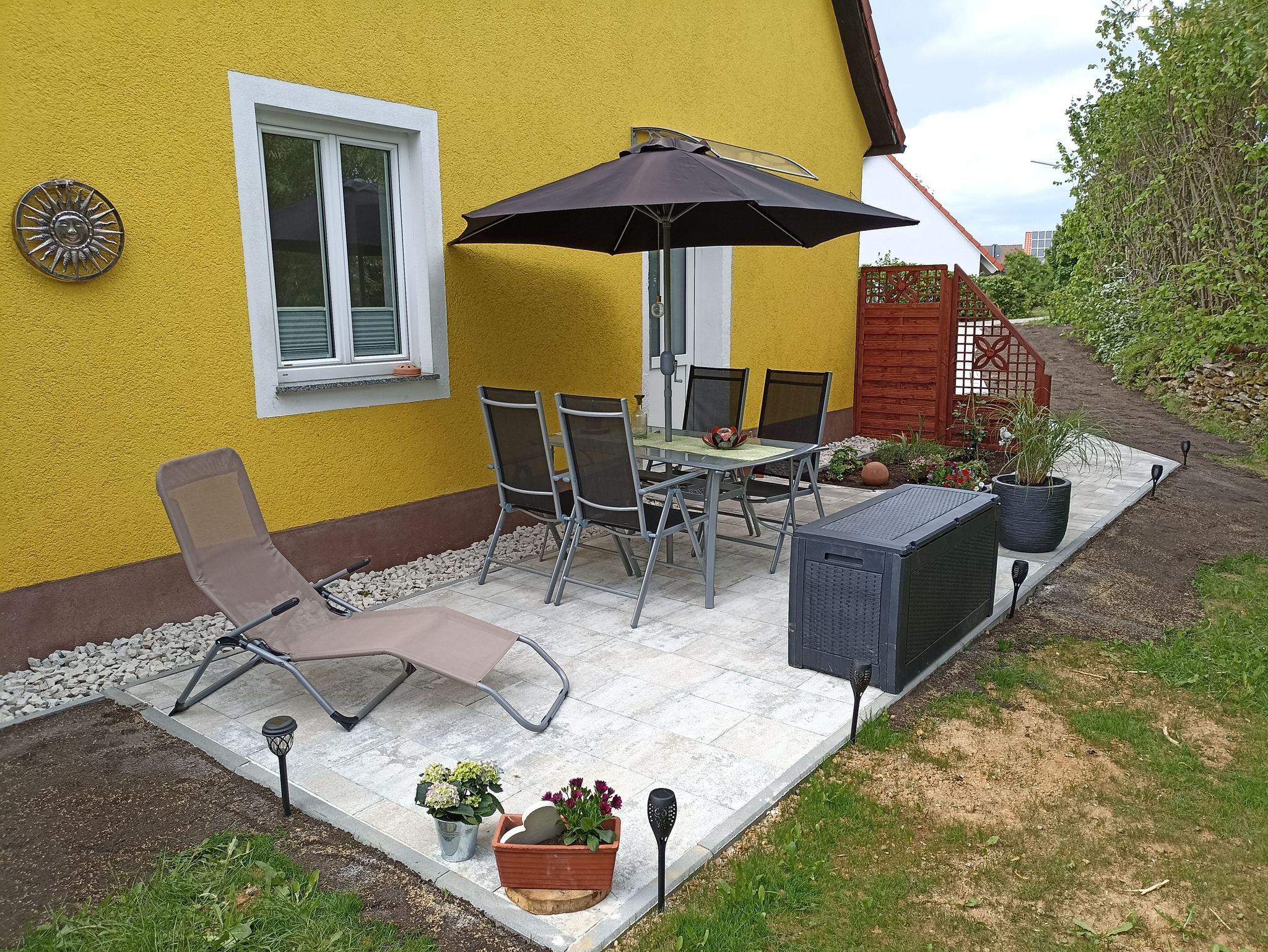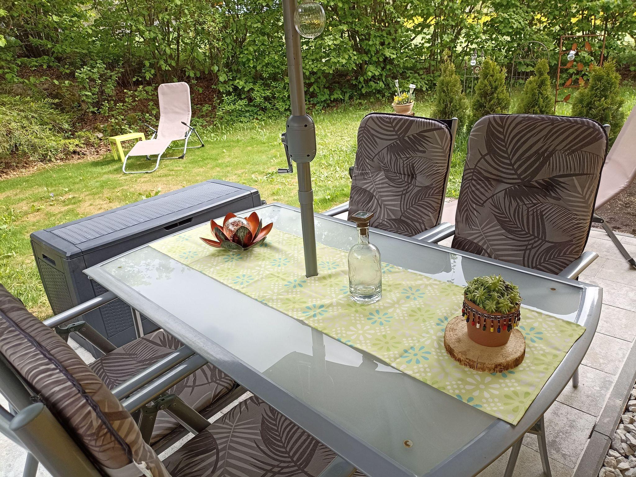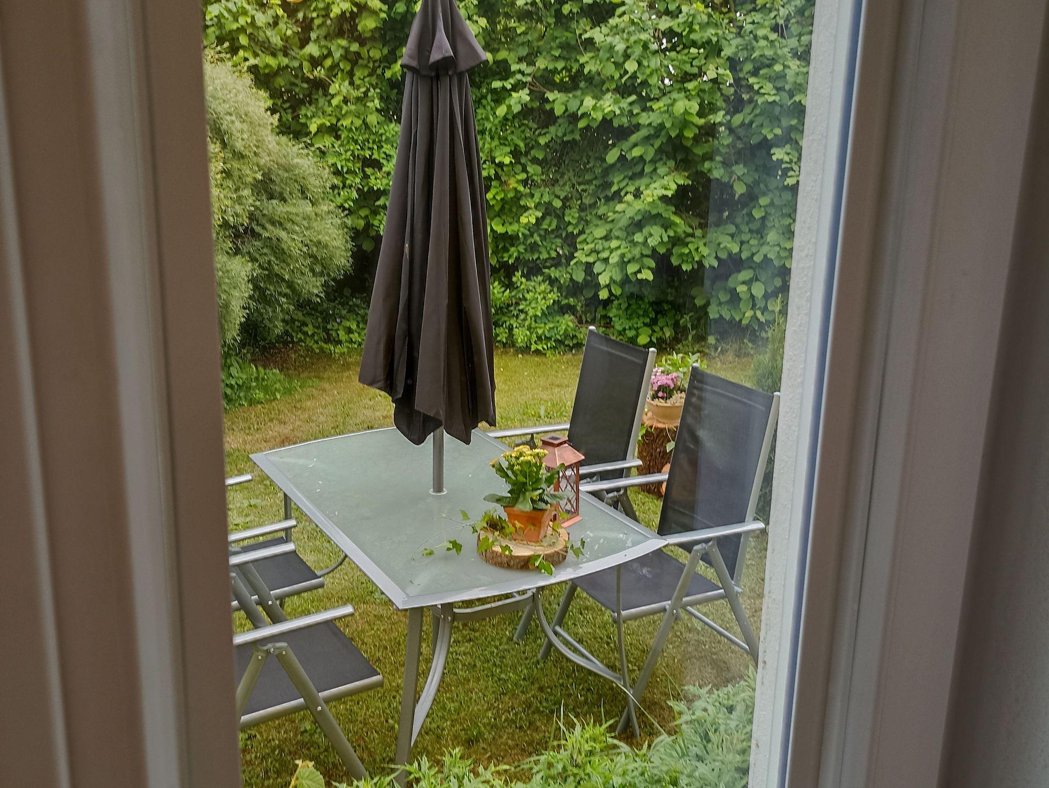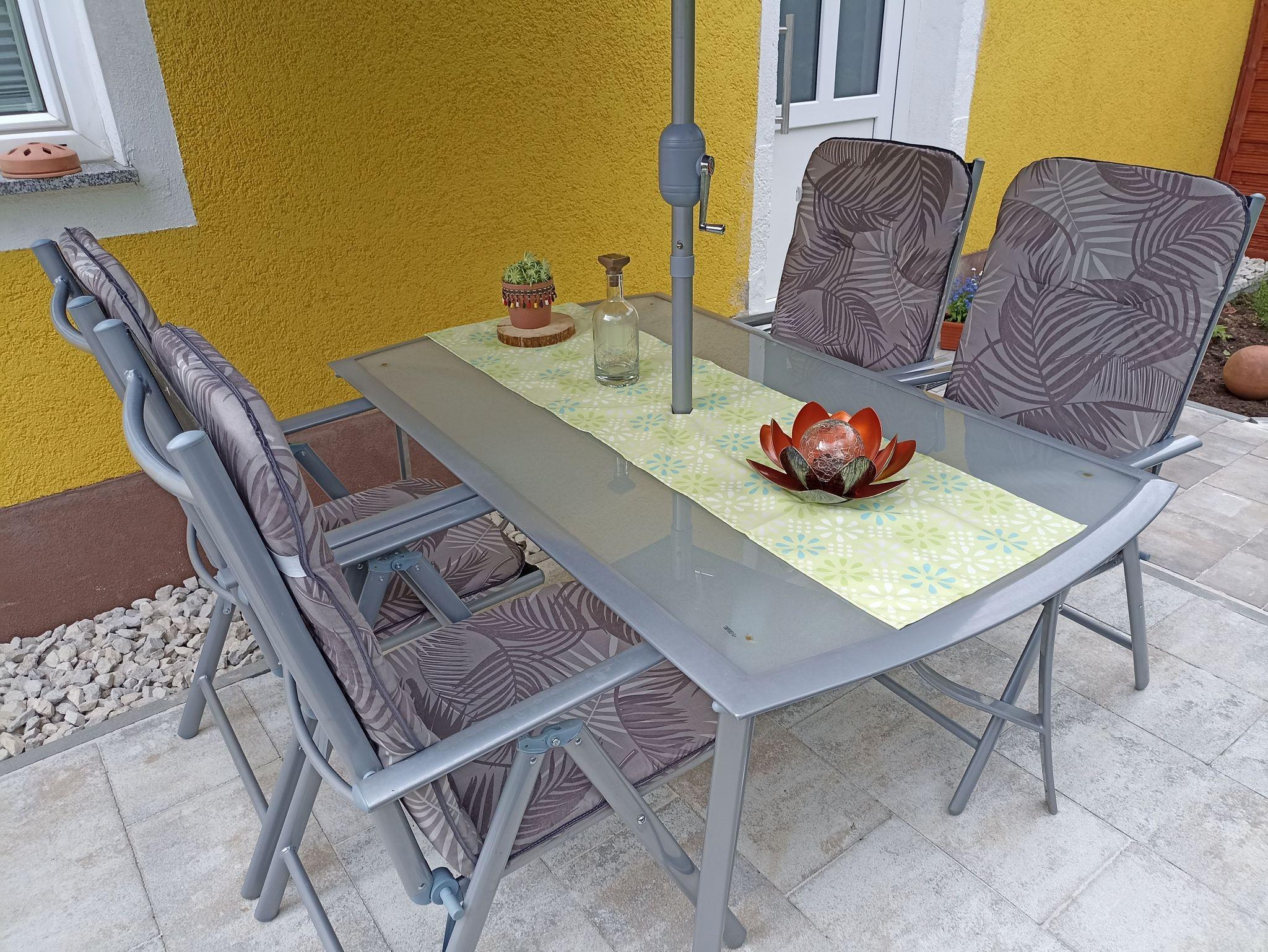 Um gemütlich Draußen sitzen zu können, lädt die abgetrennte Sitzgruppe mit Sonnenschirm, die ausreichend Platz für vier Personen bietet, zum Verweilen ein. Auch ein Stellplatz steht kostenlos für Sie bereit.