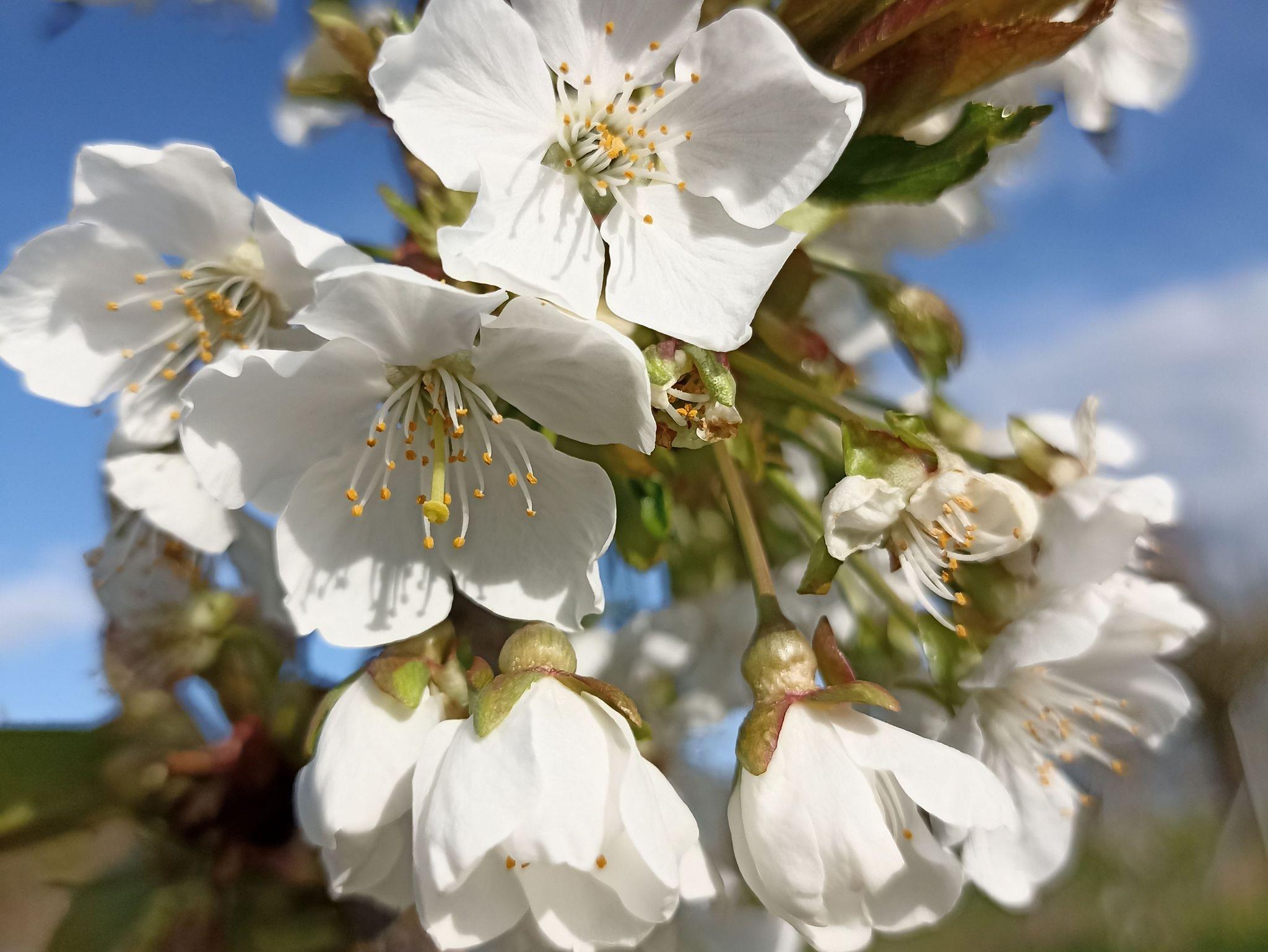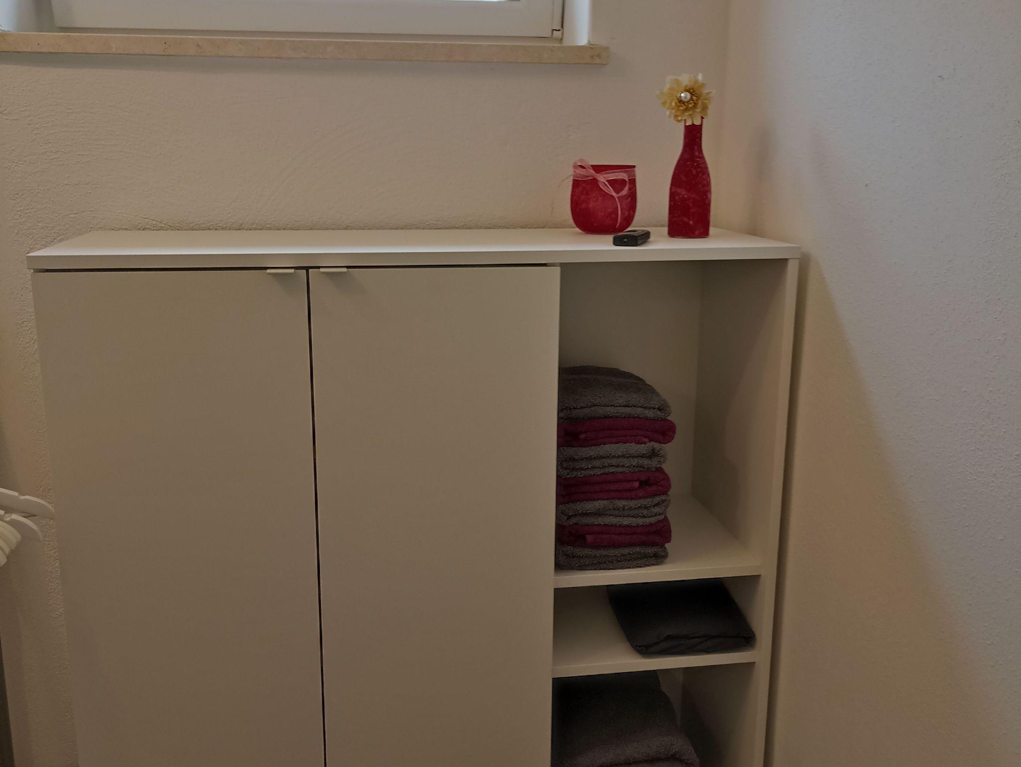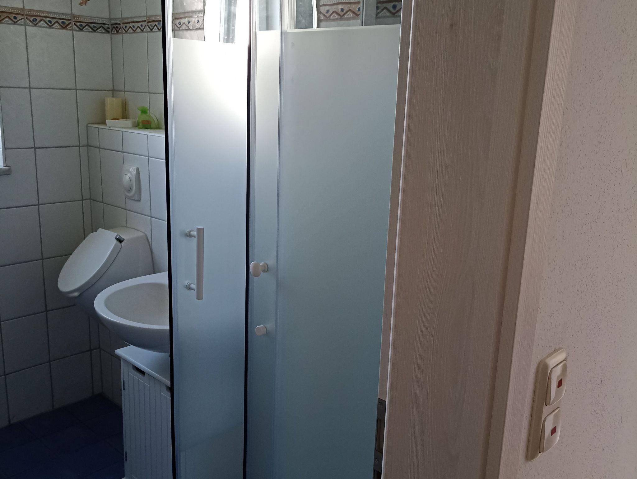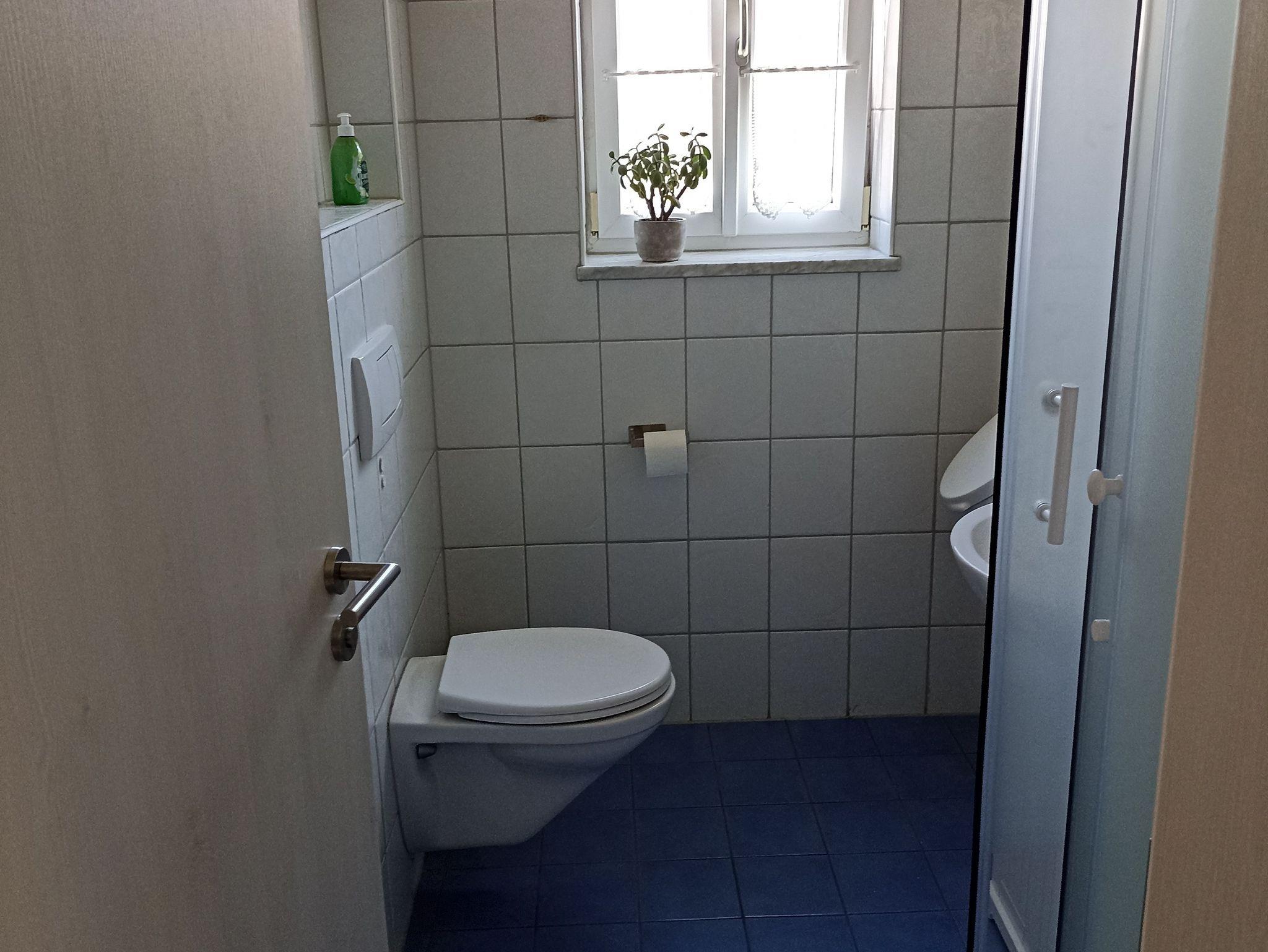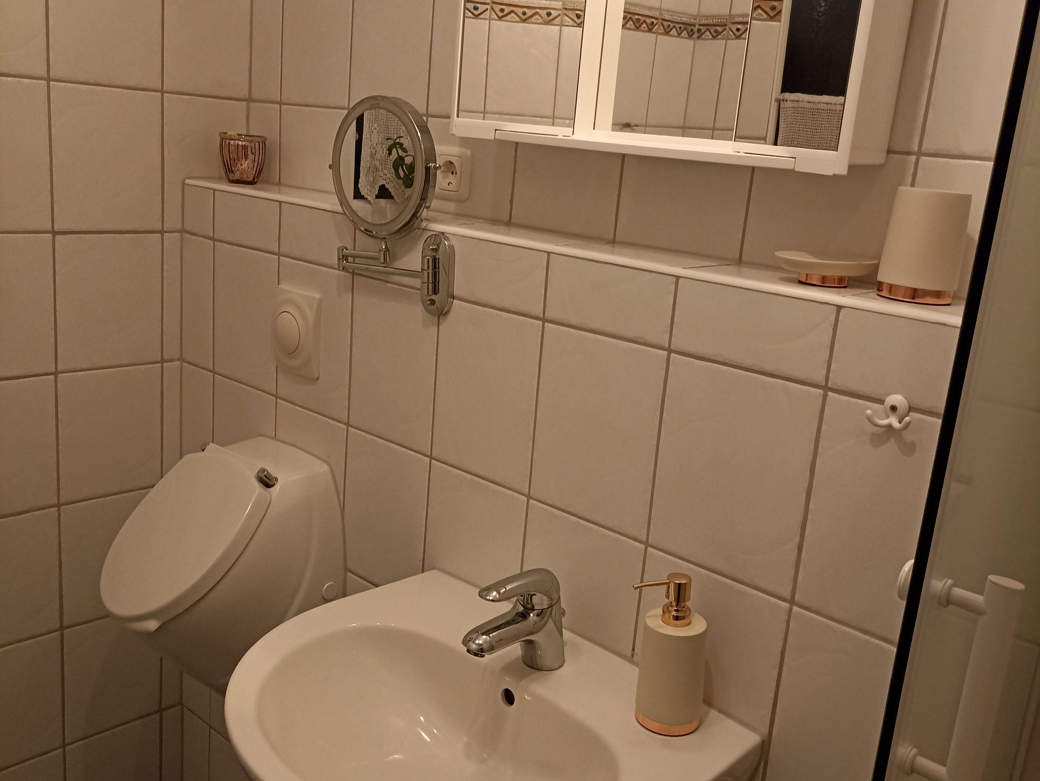 Im hellen Badezimmer befindet sich eine Dusche sowie Föhn, WC, Waschbecken und ein Pessar.