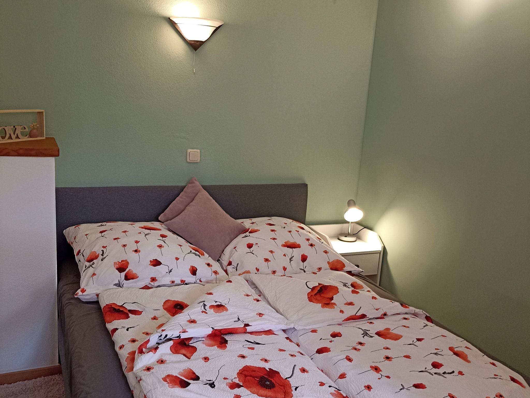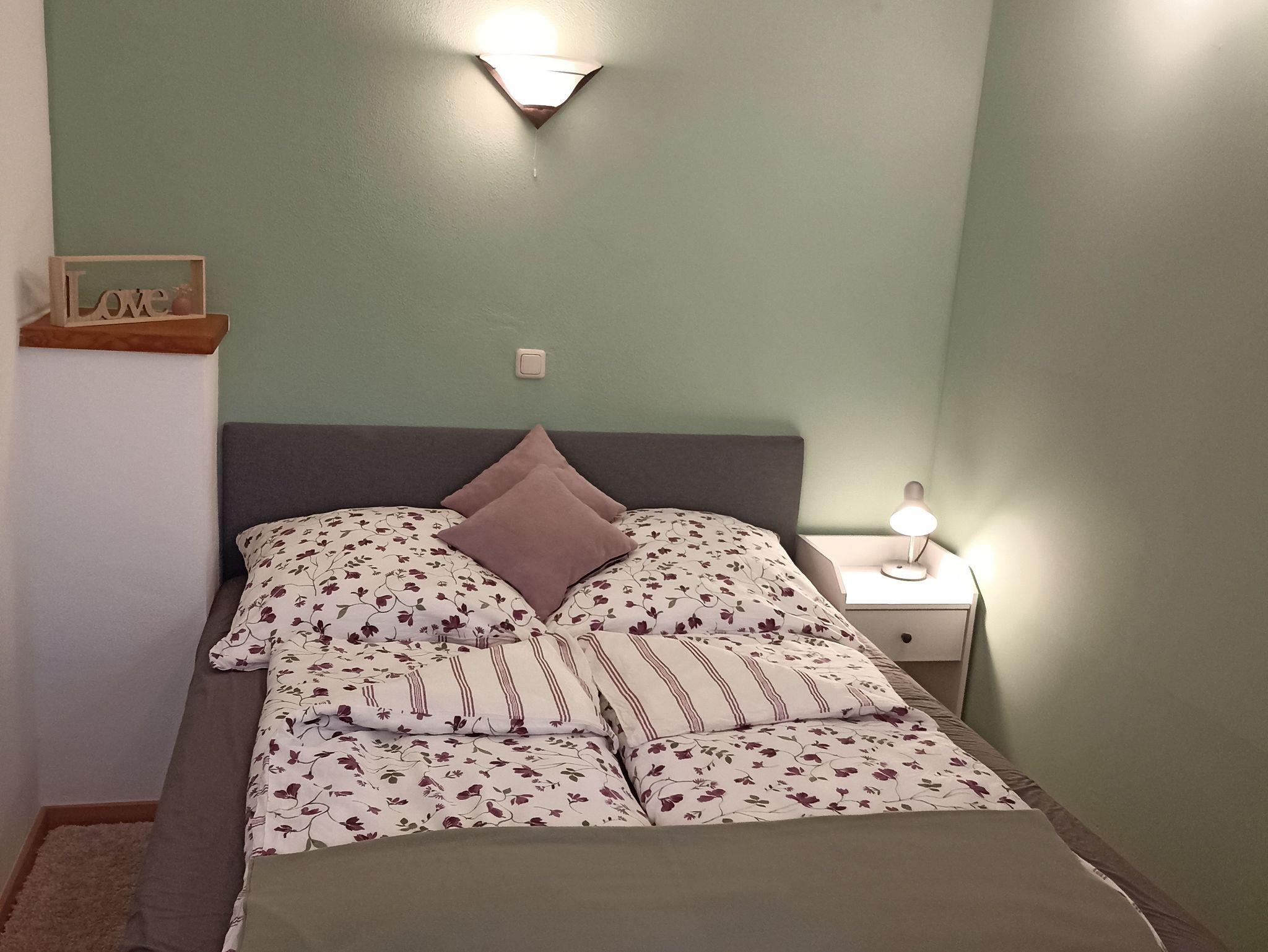 Für einen erholsamen Schlaf sorgt ein 160x200m-Bett, welches sich im Schlafzimmer befindet.