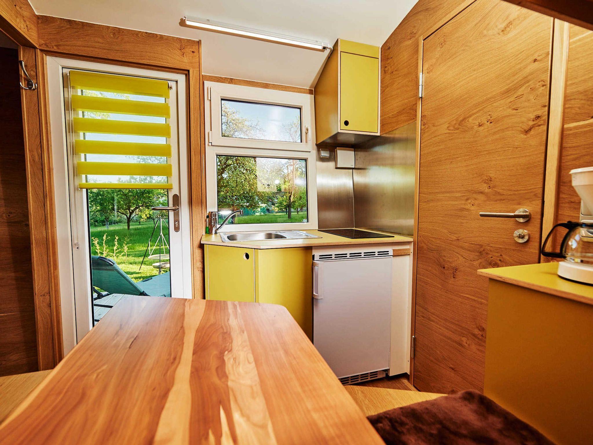 ausgestattete Küchenzeile mit Kühlschrank, Kochfeld, Wasserkocher und