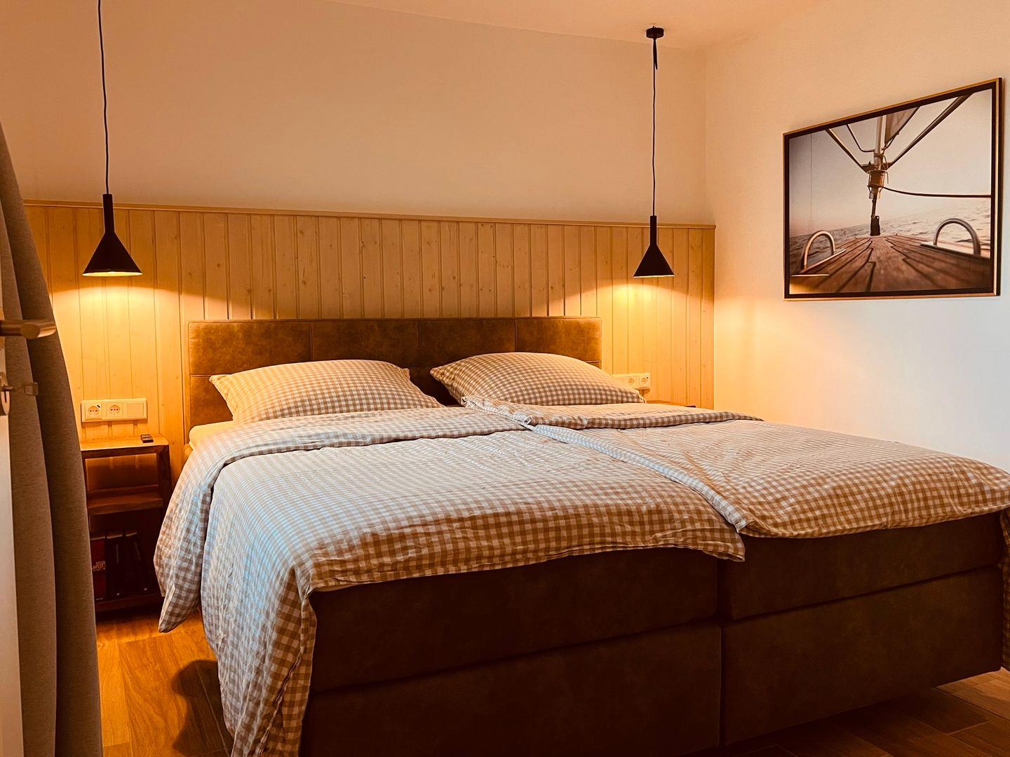 Das Schlafzimmer verfügt über ein komfortables Boxspringbett (180x200 cm) mit offenem Fußende und einem Kleiderschrank. Verdunklungsmöglichkeiten garantieren erholsame Nächte. Das Badezimmer ist modern gestaltet und bietet eine ebenerdige Dusche, WC, Haartrockner, Spiegel sowie Waschbecken und Fenster für frische Luft.