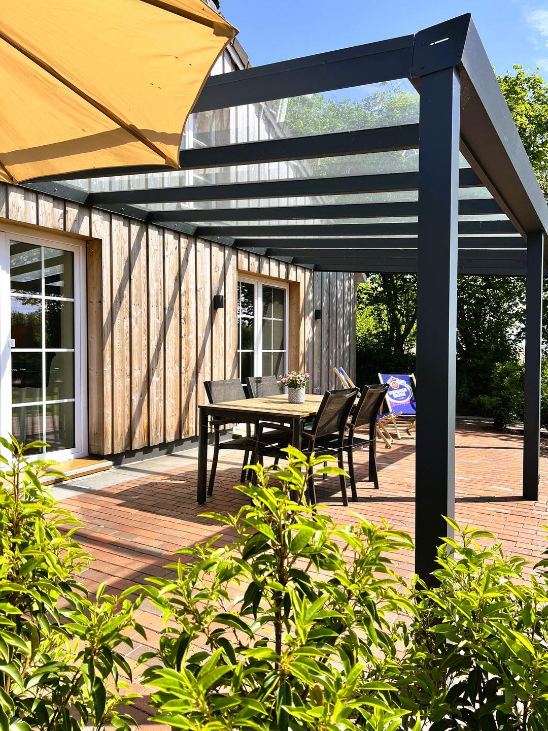 Im Außenbereich steht den Gästen eine Gartensauna (Fasssauna) zur Gemeinschaftsnutzung zur Verfügung, ergänzt durch eine Außendusche. Die Nutzung der Sauna kostet 6,00 € pro Stunde (Münzautomat). Der Gemeinschaftsgarten mit Liegewiese sowie die eigene Terrasse sind perfekt zum Entspannen geeignet; Gartenmöbel, Sonnenschirm und Windschutz sind vorhanden. Bitte beachten Sie, dass aufgrund des benachbarten Reetdaches das Grillen nicht gestattet ist.