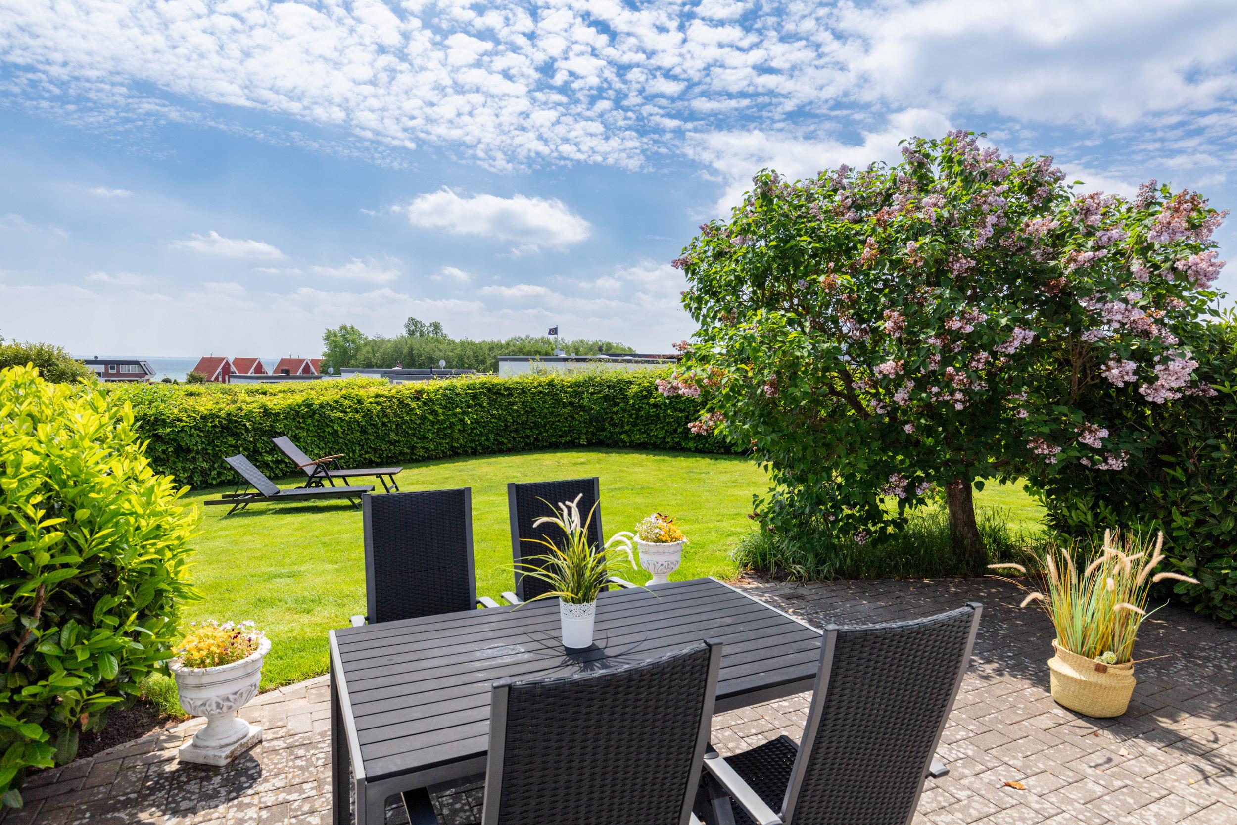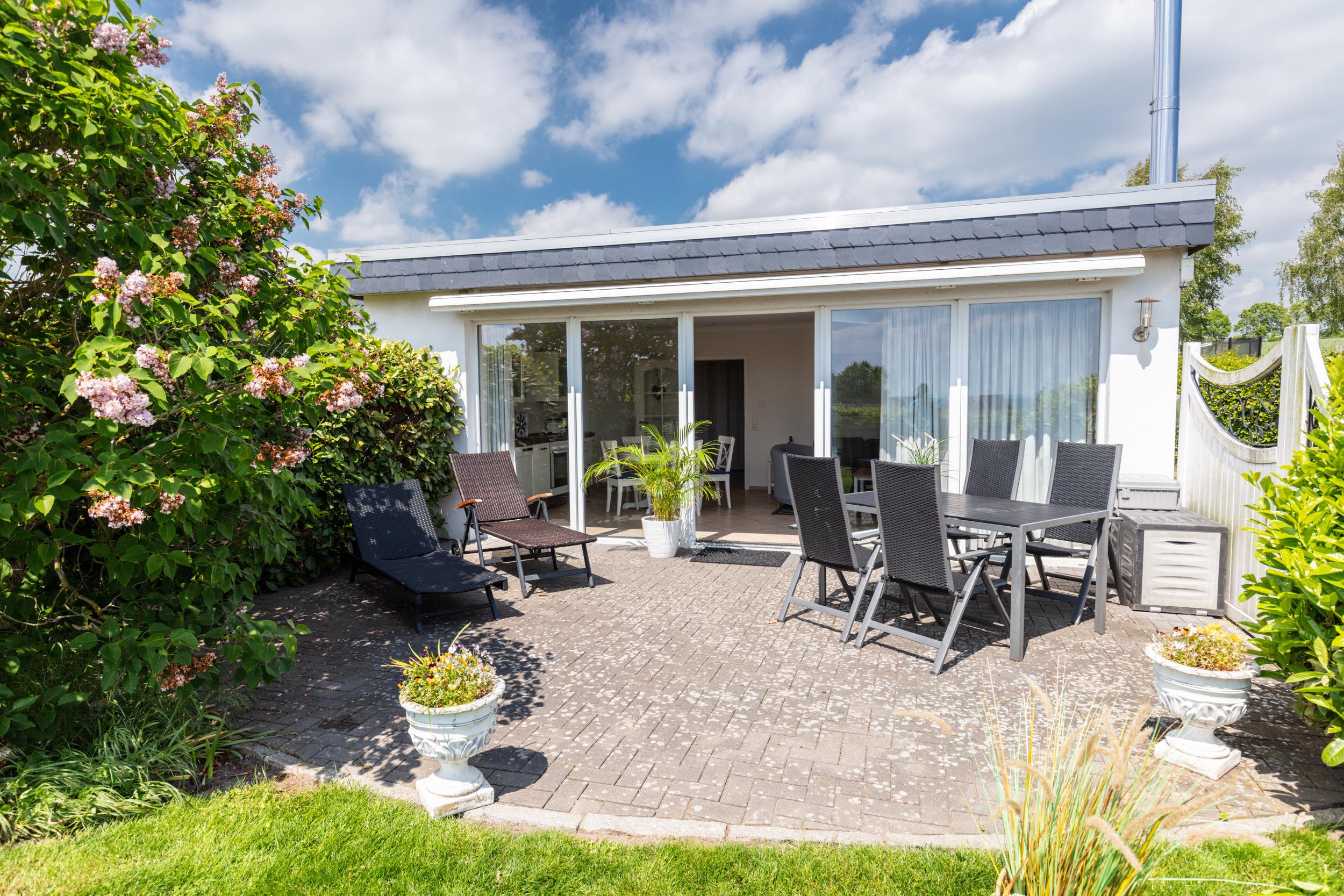 Sonne tanken kannst Du auf der schönen Terrasse. Gartenmöbel, Liegen und ein Sonnenschirm stehen für Dich bereit. Zum Strand gelangst Du in wenigen Schritten.