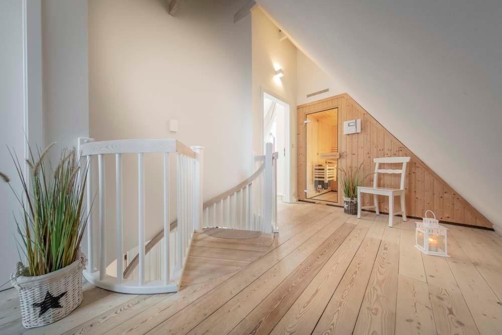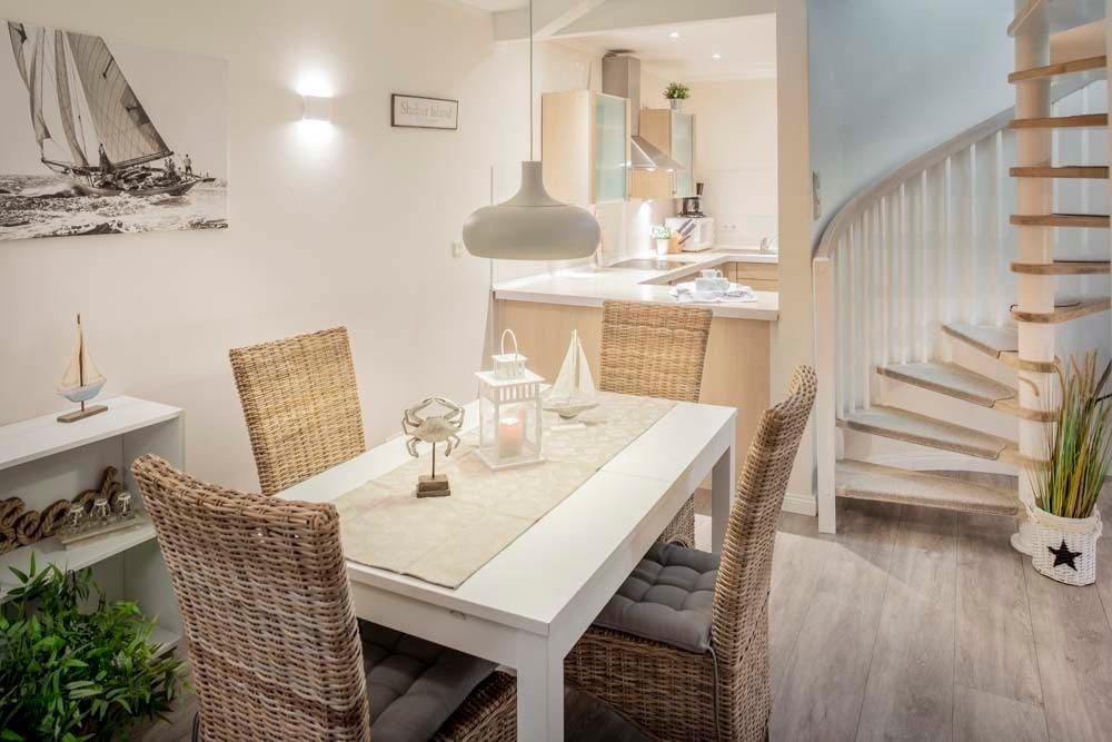 Auf zwei Wohnebenen spürst du im Strandhaus pure, ganz gelassene Ferienstimmung. Der Einrichtungsstil ist frisch und elegant: helles Weiß, warme Naturtöne, kombiniert mit stilvollen maritimen Schwarz-Weiß-Fotografien an den Wännden.