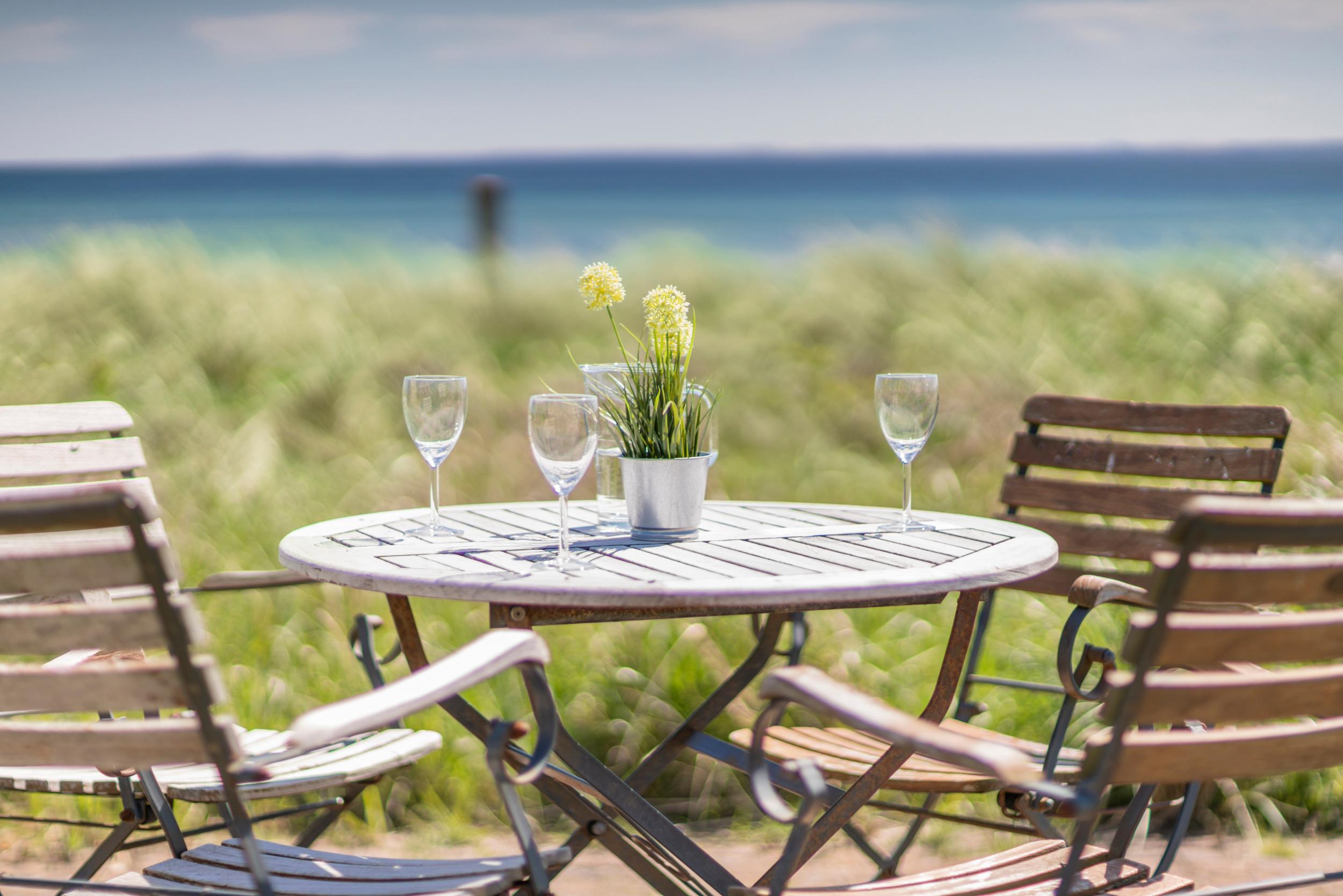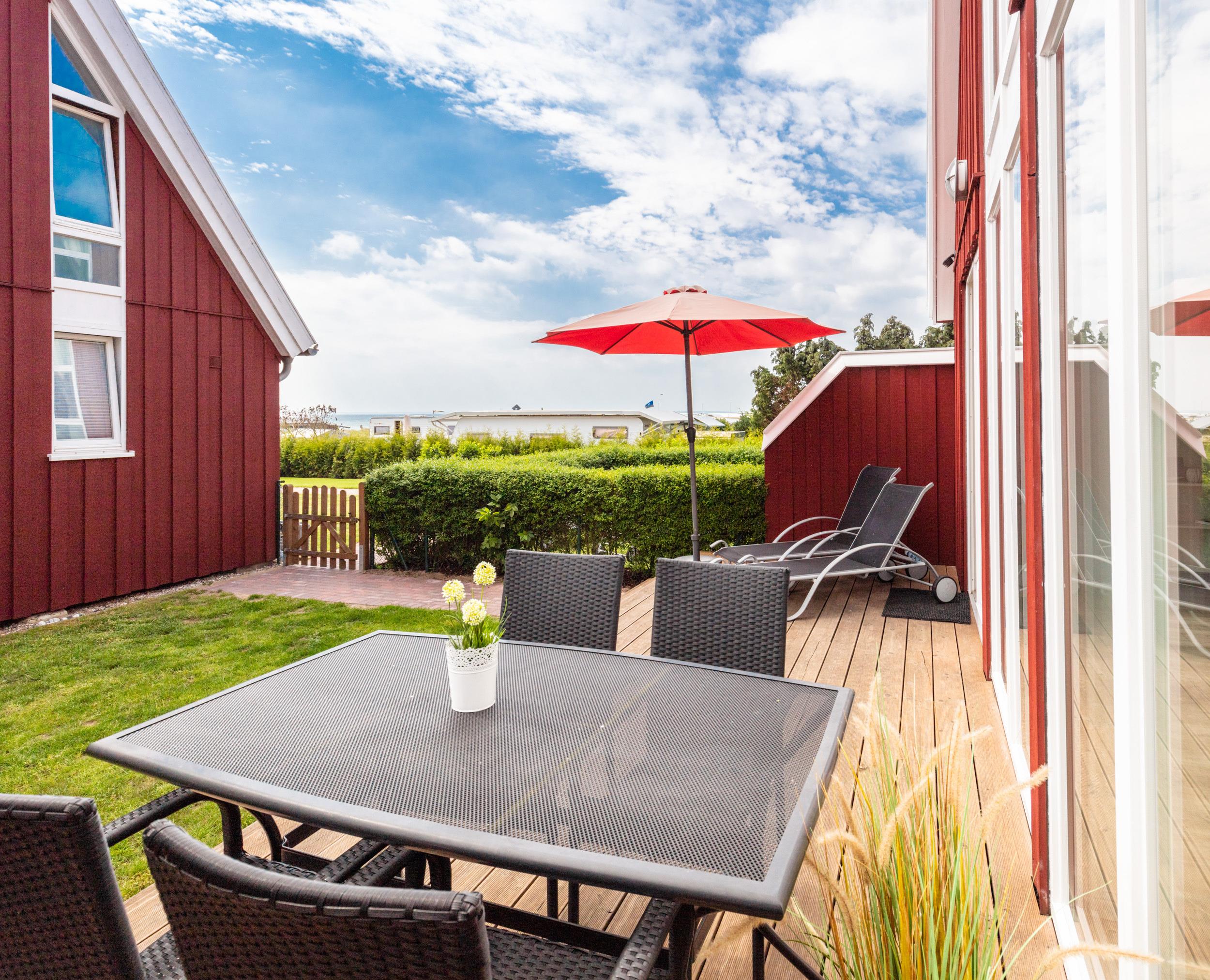 Sonne tanken kannst Du auf der erhöhten Holz-Terrasse. Gartenmöbel, Liegen und ein Sonnenschirm stehen für Dich bereit. Zum Strand gelangst Du über den eigenen Zugang in wenigen Schritten.