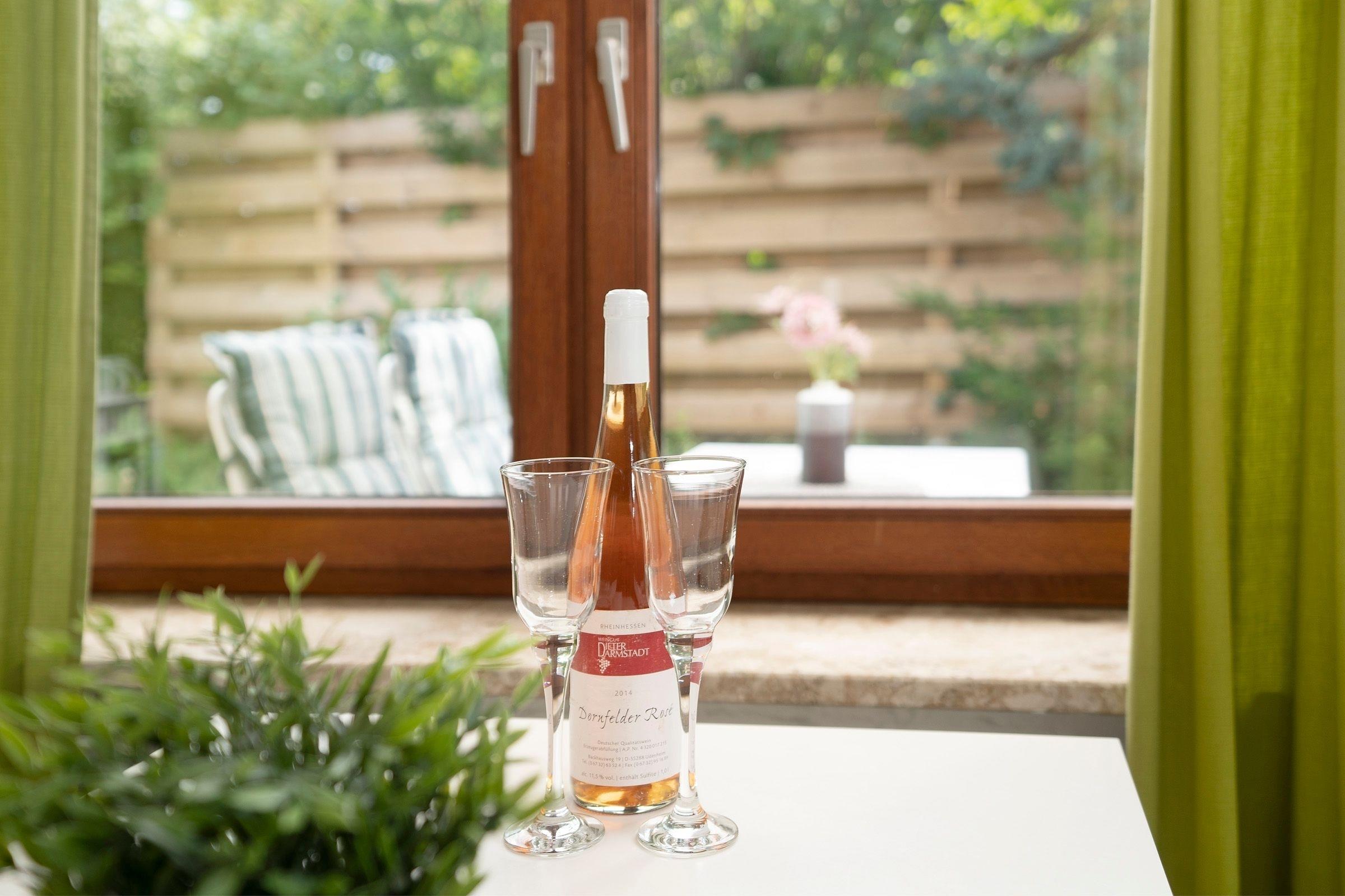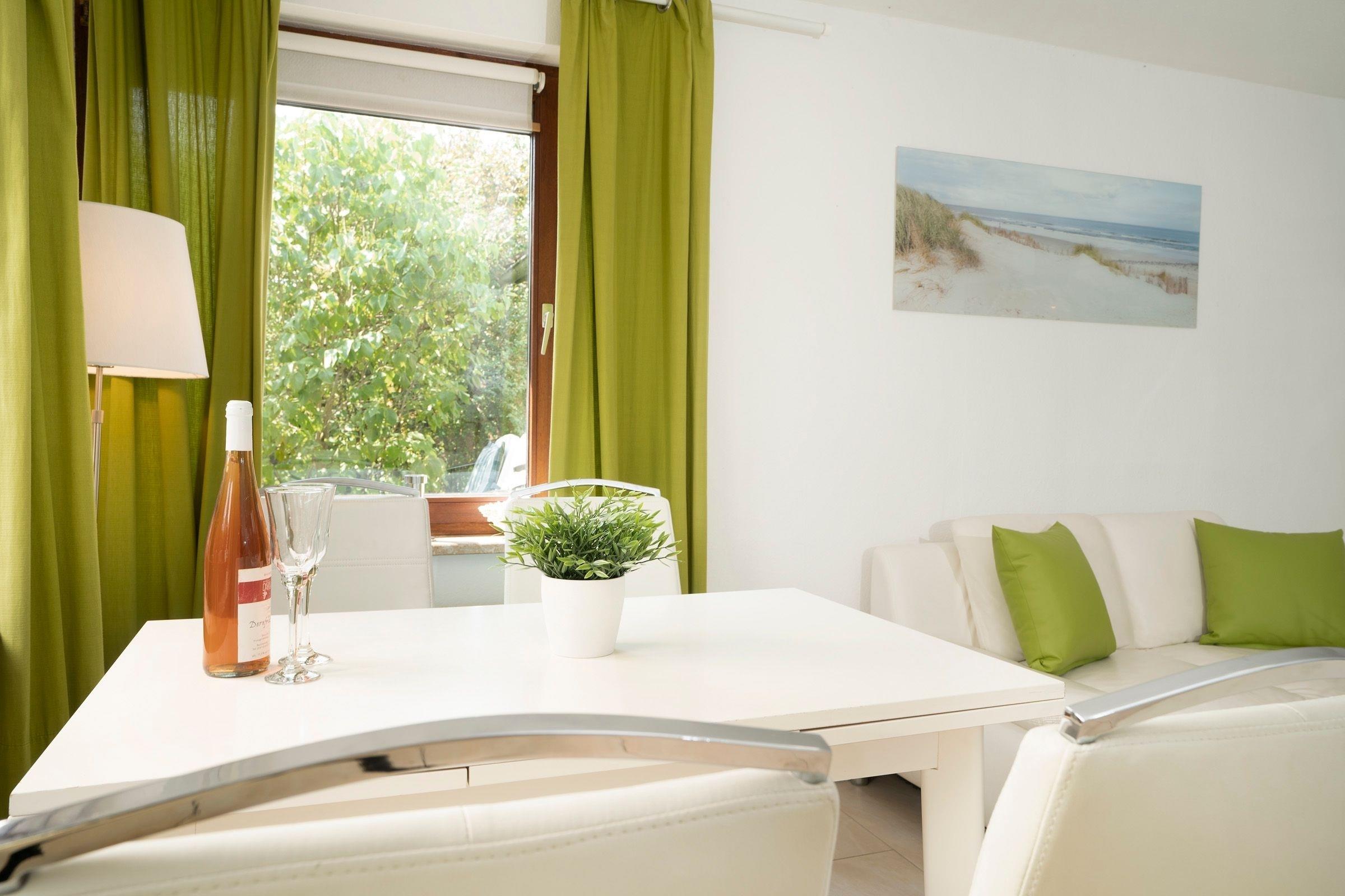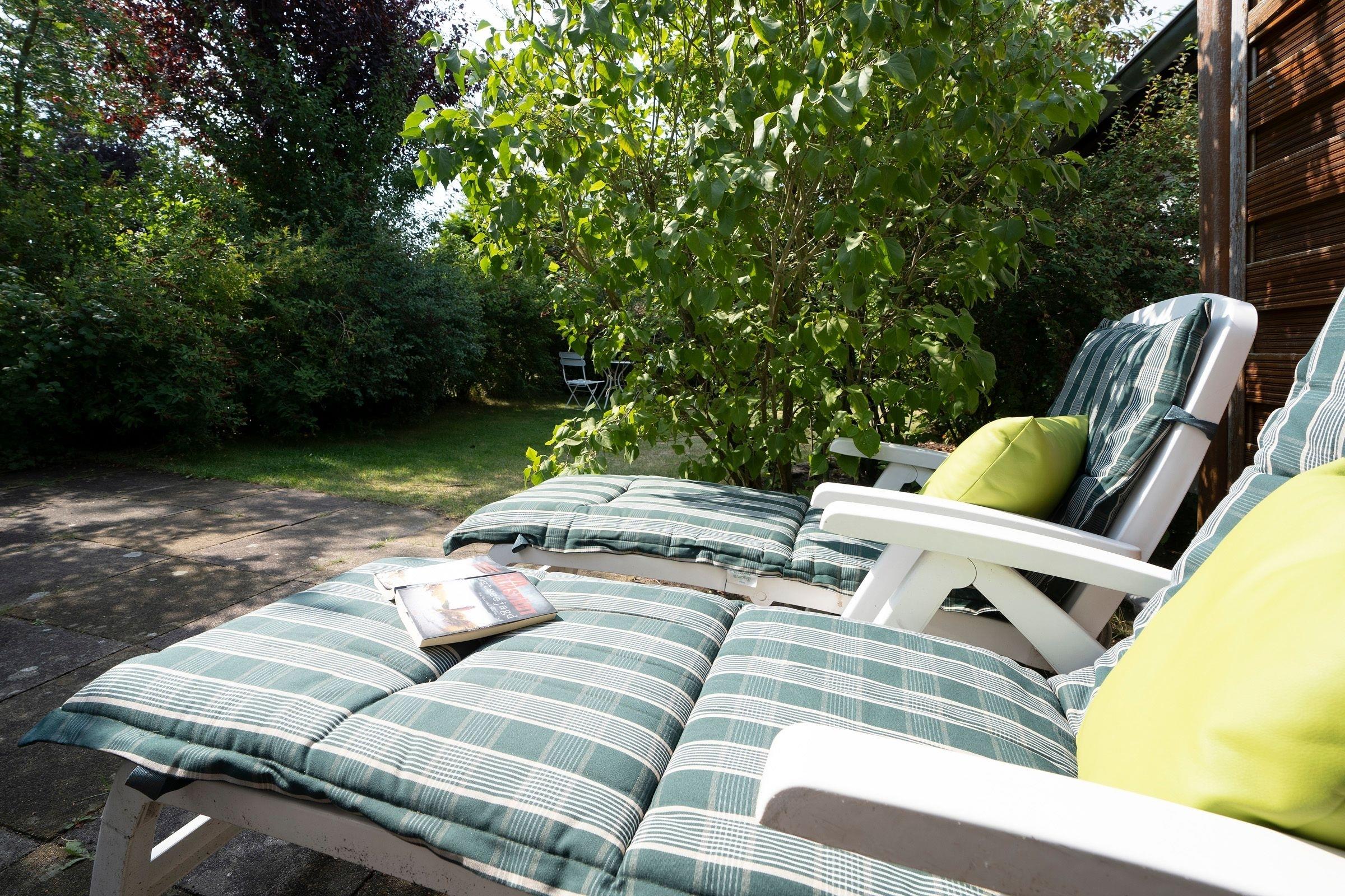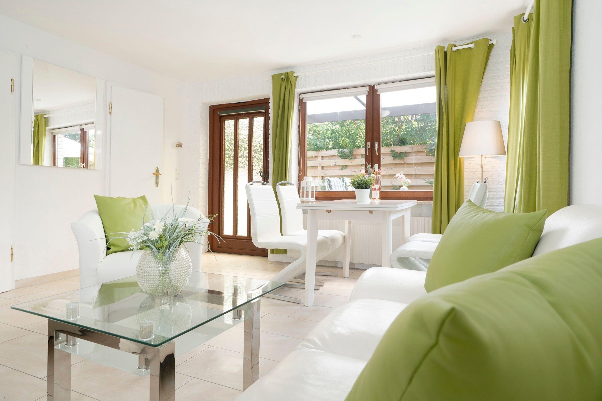 In der Wohnung gibt es ein Wohnzimmer, ein separates Schlafzimmer mit 2 Einzelbetten (je 80 x 200 cm), eine kleine gemütliche Küche und ein Badezimmer. Vom Wohnzimmer aus gelangen Sie direkt auf die sonnige Terrasse und in den großzügigen Garten.