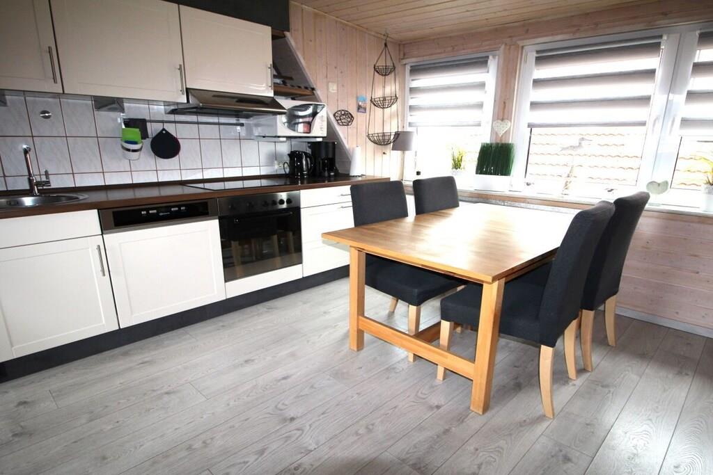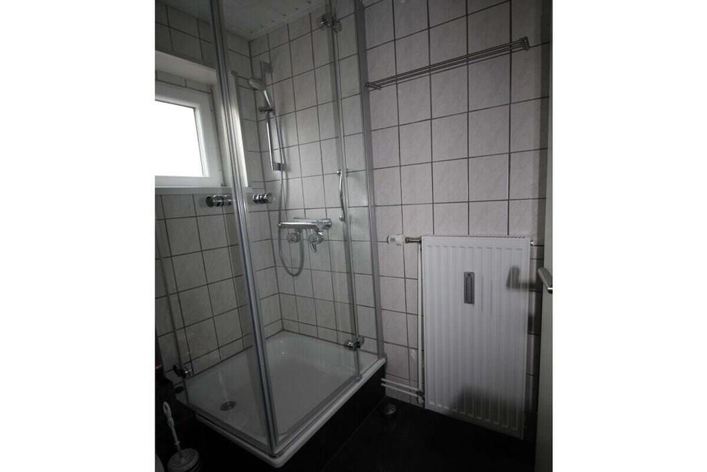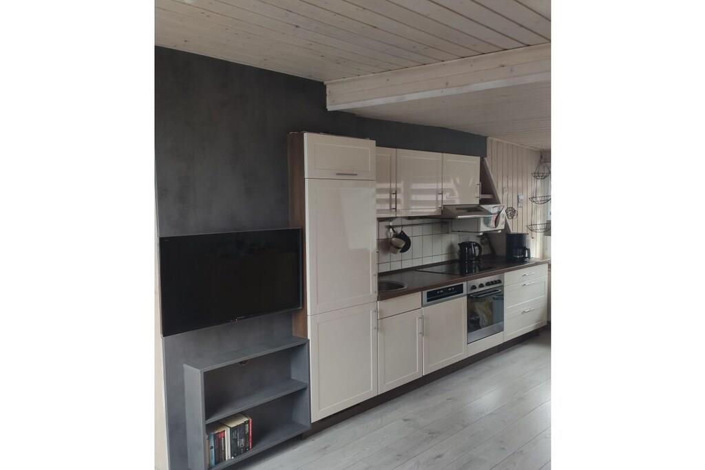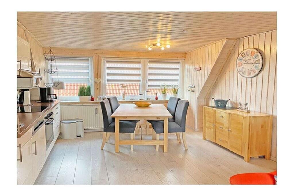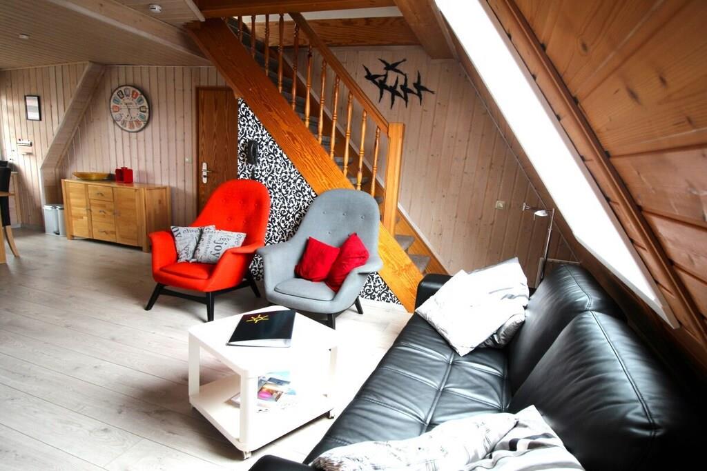 På 1. etage: (stue / spisestue(, , , Fjernsyn, spisebord, radio, CD-afspiller, kogeplade, elkedel, brødrister, kaffemaskine, ovn, mikrobølgeovn, opvaskemaskine , køleskab), soveværelse(, dobbeltseng, Fjernsyn), soveværelse(, enkeltseng, enkeltseng, Fjernsyn)) Loft: (badeværelse(, toilet, håndvask)) , , badeværelse(, toilet, bruser, håndvask), Internetadgang, varme, terrasse(havemøbler, Haveskur)