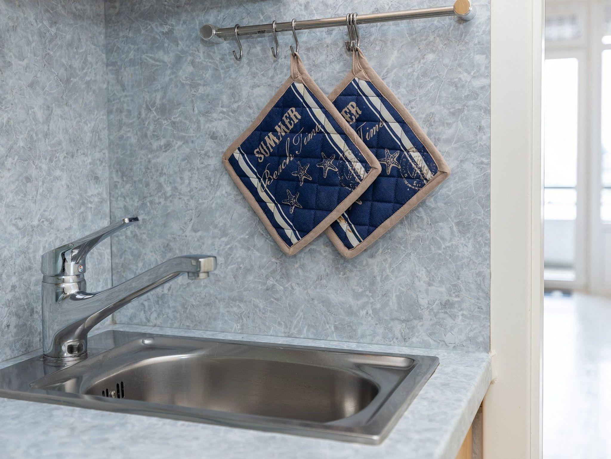 Moderne, Pantry-Küche im Flur. Die Küche ist mit einem 2-Platten Cerankochfeld, einer Spülmaschine, einem Kühlschrank mit kleinem 3-Sterne Gefrierfach, Microwelle, einer Kaffeemaschine, einem Toaster und einem Wasserkocher ausgestattet.