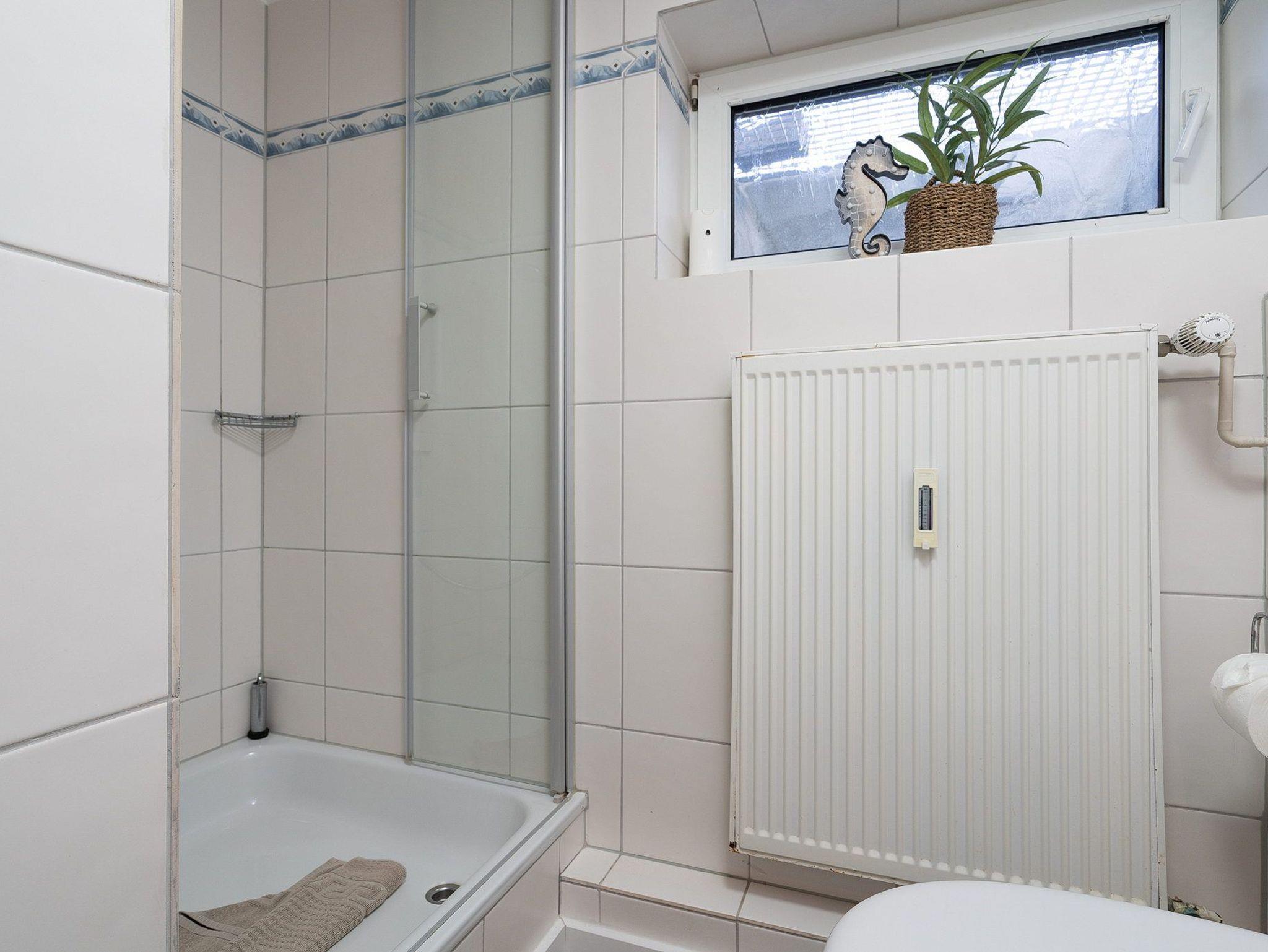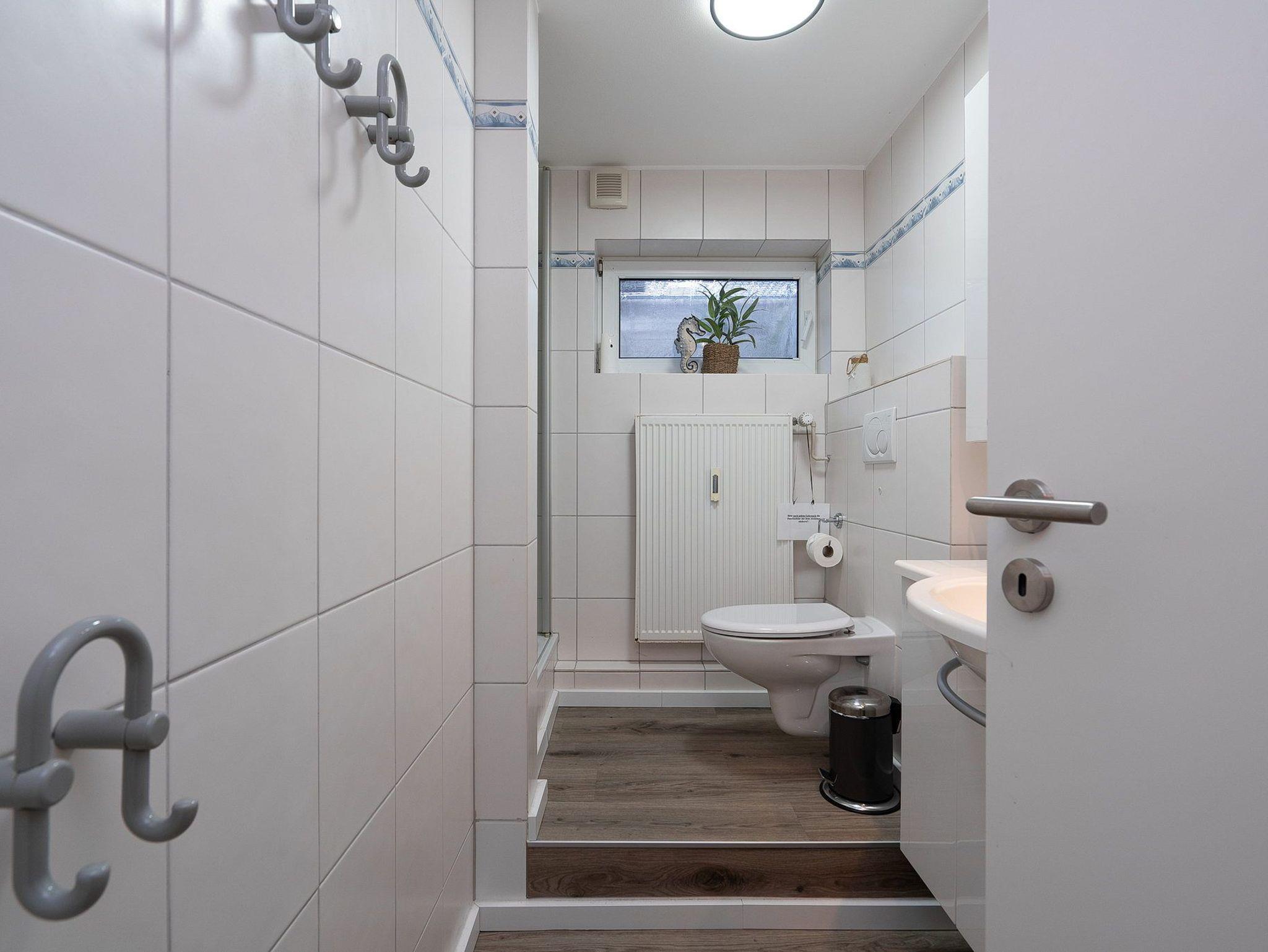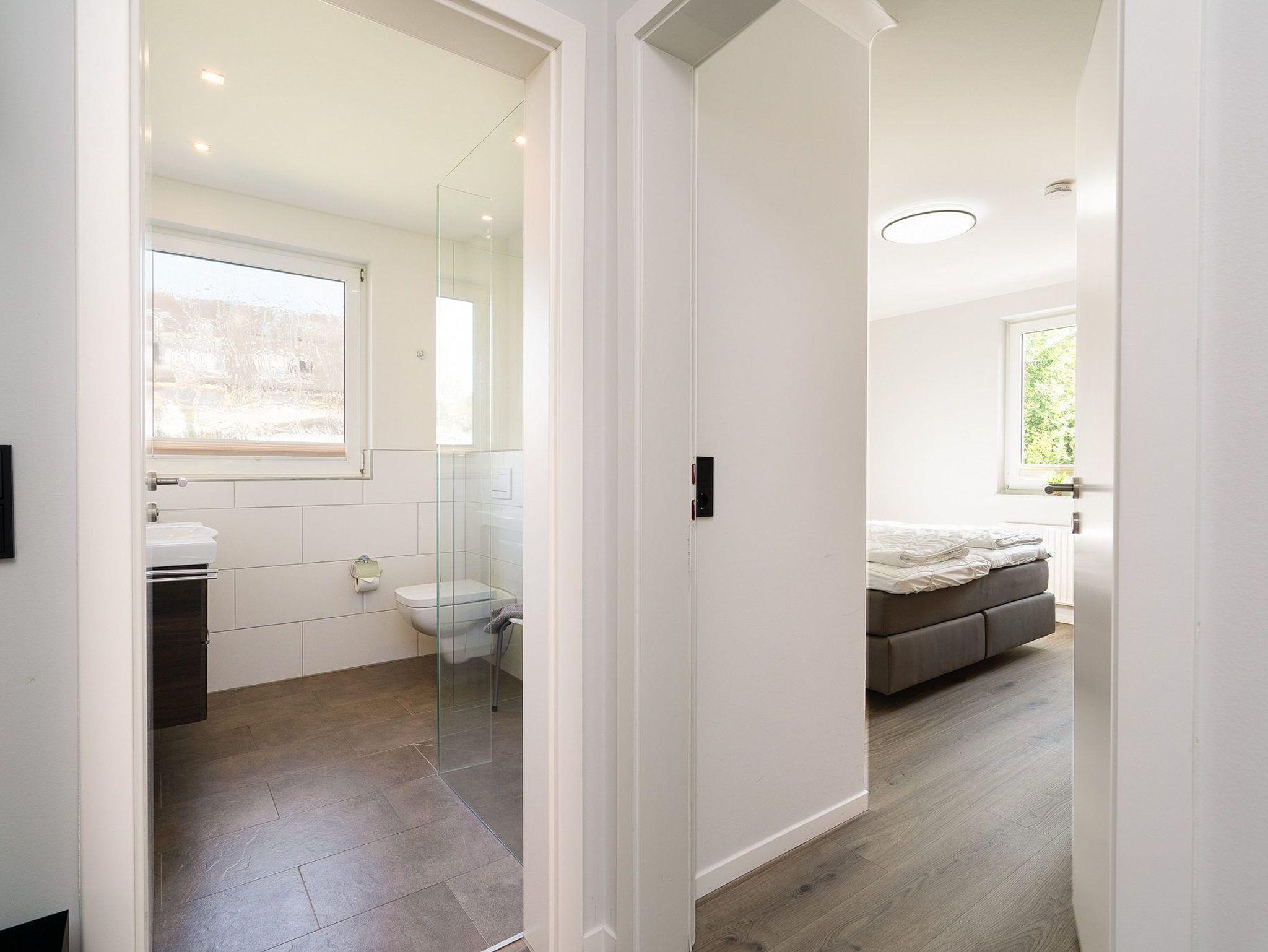 Direkt neben dem Schlafzimmer befindet sich das Tageslichtbad mit WC und Dusche (eine Stufe erhöht) und einer Waschtischanlage mit einem Spiegelschrank.