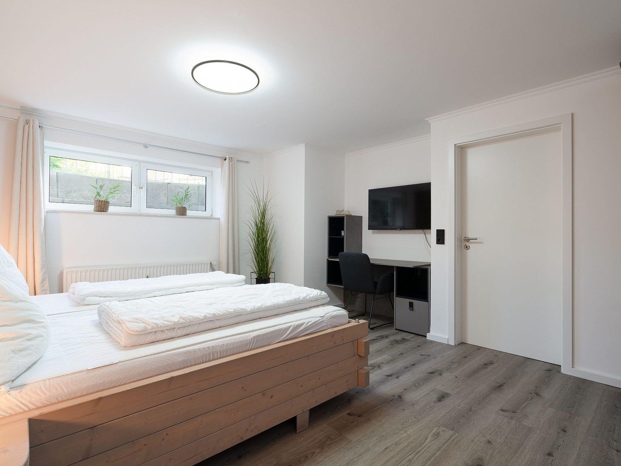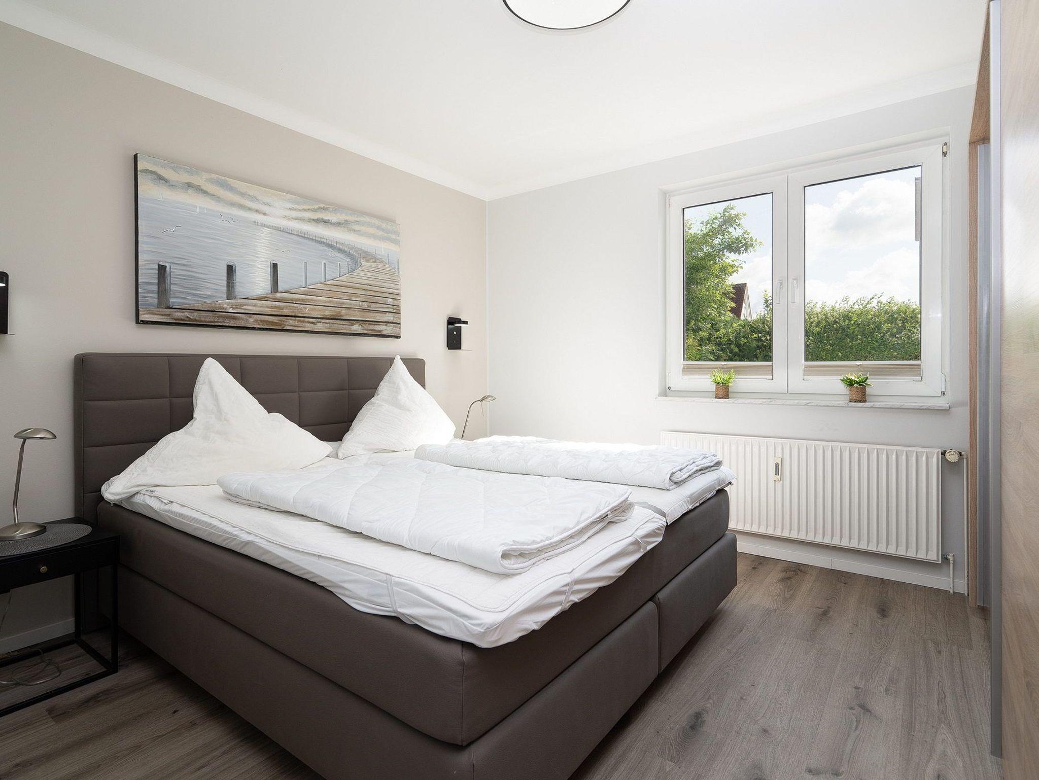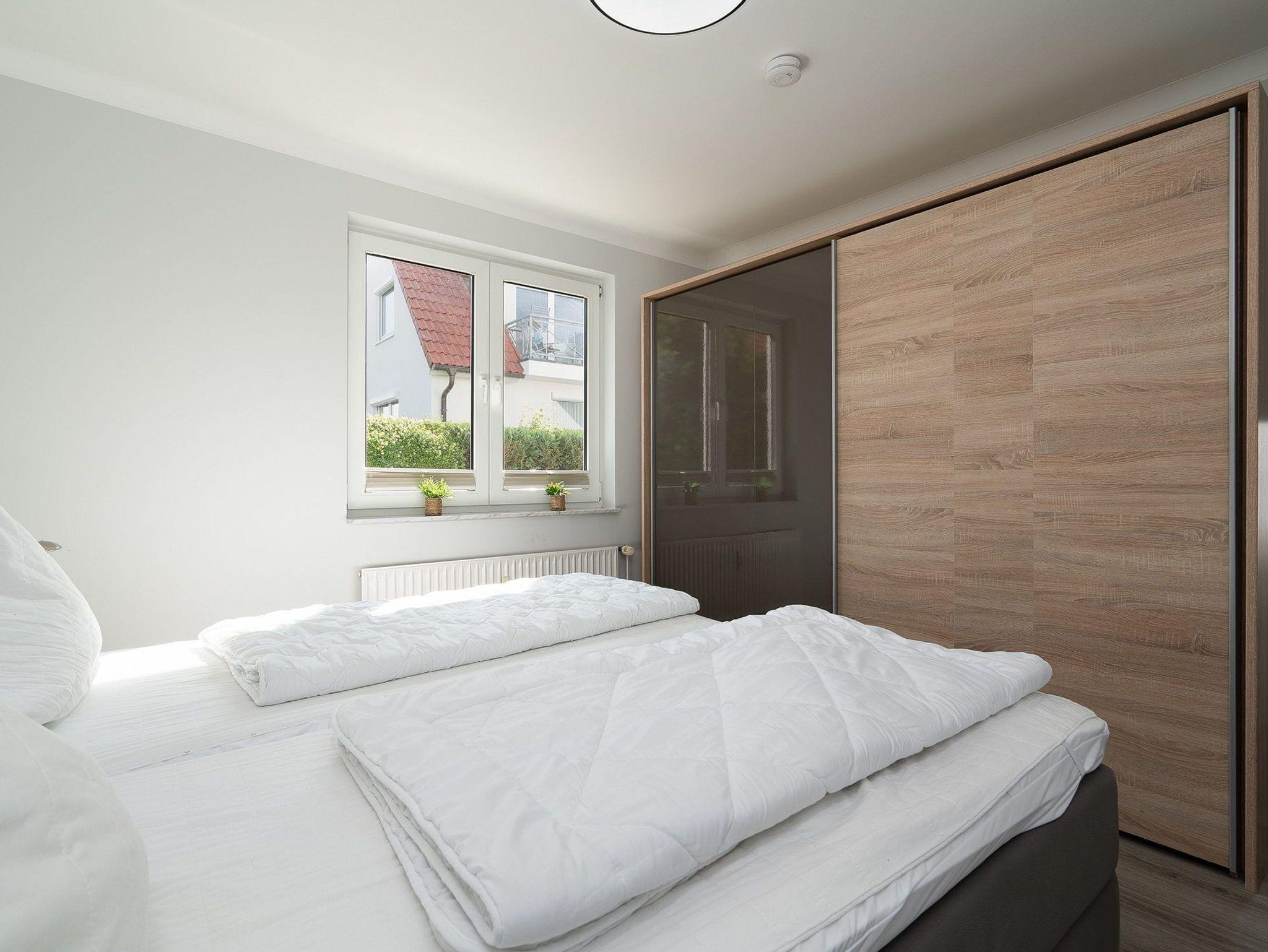 Das modern ausgestattete Schlafzimmer wurde mit einem neuen Boxspringbett (180x200cm) ausgestattet und verfügt über einen Kleiderschrank mit platzsparenden Schiebetüren. Der Raum wurde ebenfalls mit dem pflegeleichten, modernen Designboden ausgelegt. Die Fenster lassen sich durch die Plissees verdunkeln.