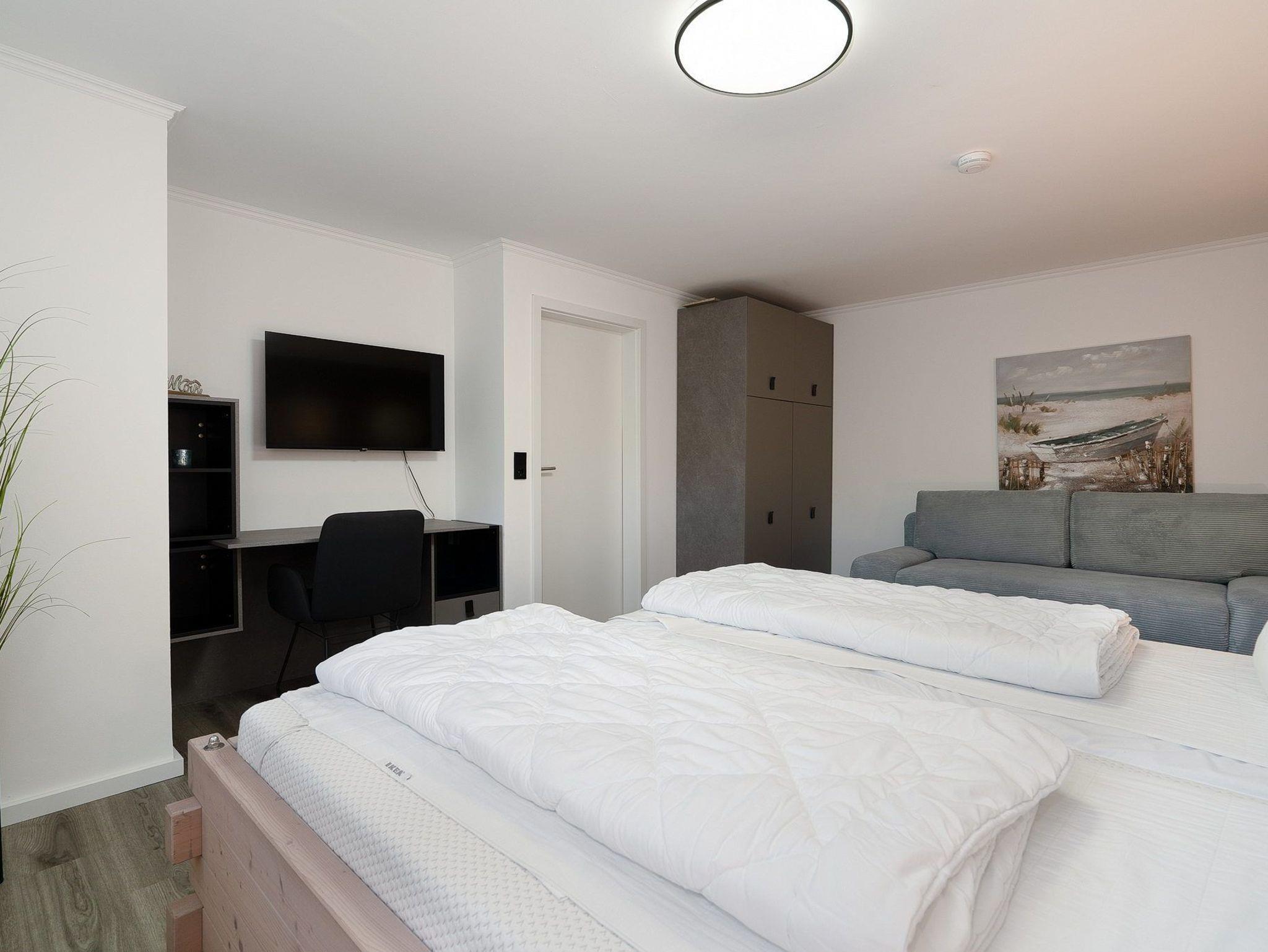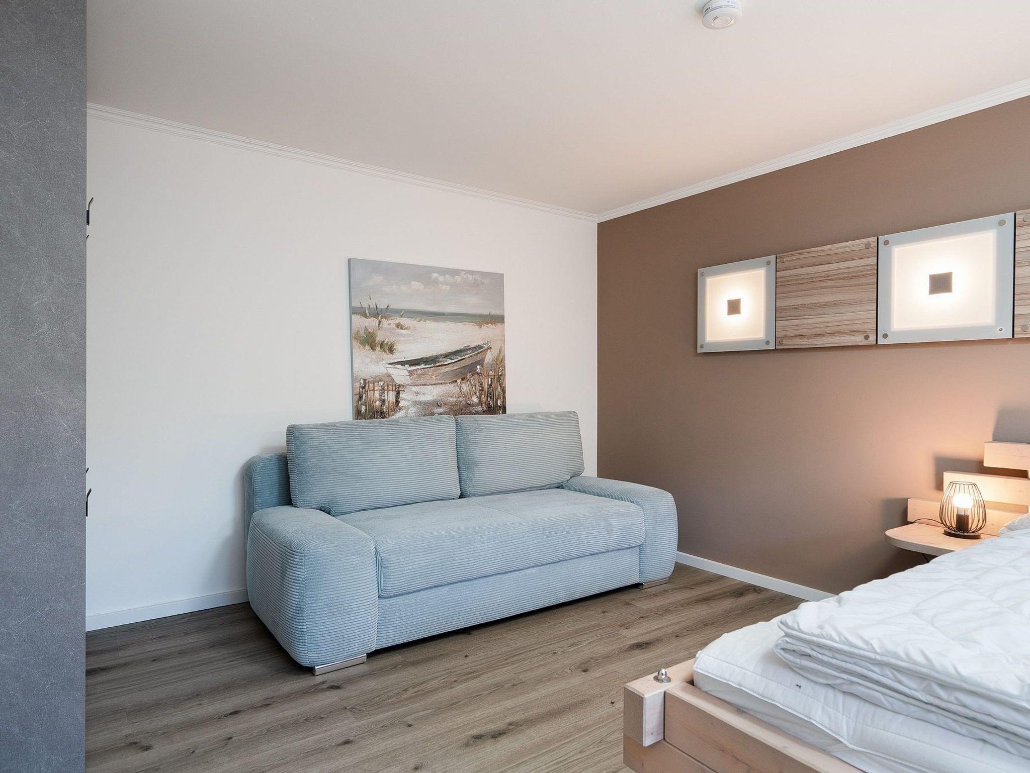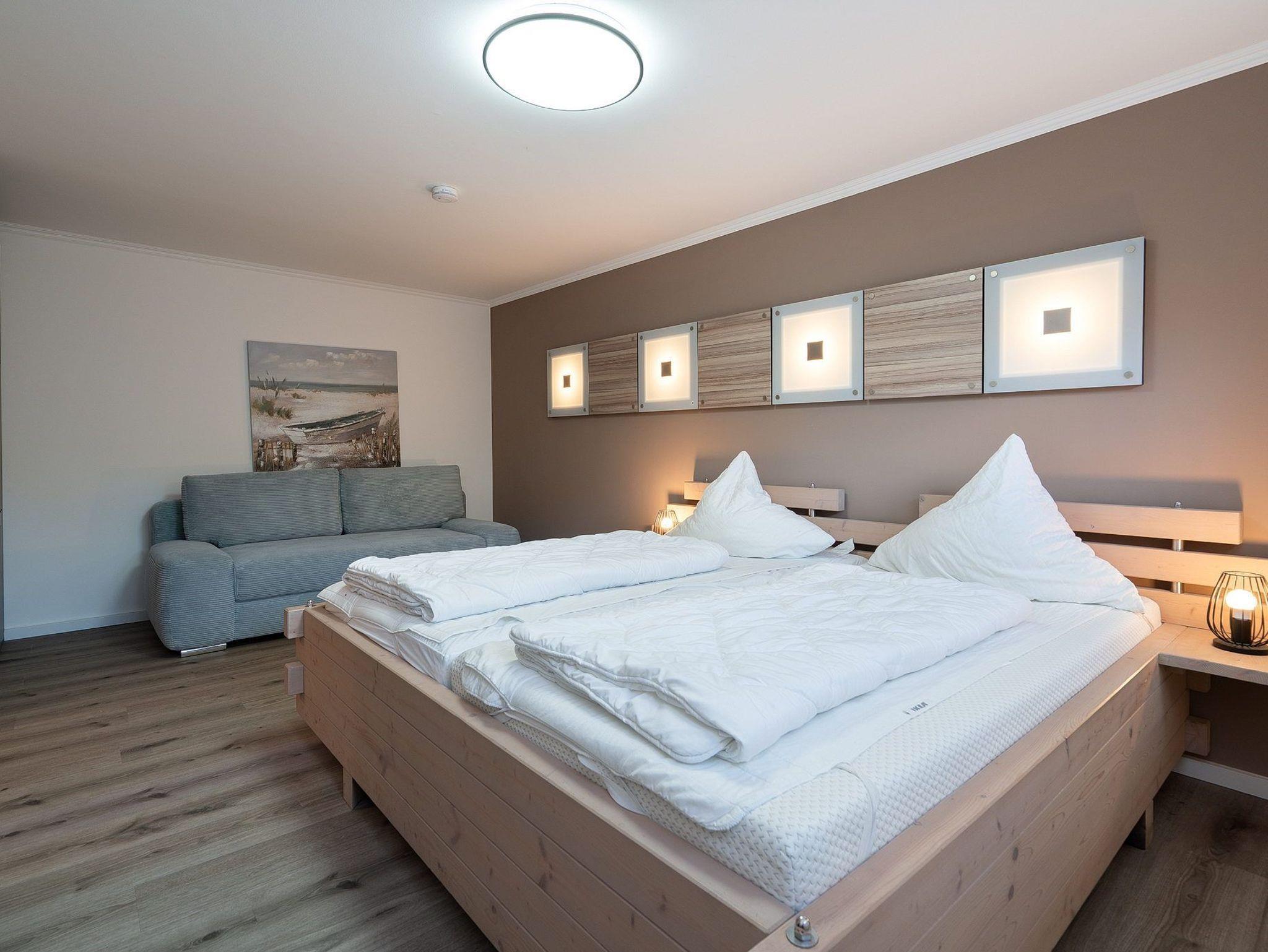 Der großzügige Schlafraum verfügt über ein massiv gebautes Holzbett (2x100x200cm). Zur weiteren Ausstattung zählt ein Kleiderschrank, ein Sidebord und zur Unterhaltung ein Flachbildschirm-TV. Der Fußboden ist gelfliest. Die Fenster lassen sich durch Vorhänge verdunkeln. Außerdem steht eine Schlafcouch zur Verfügung (160x200 cm).