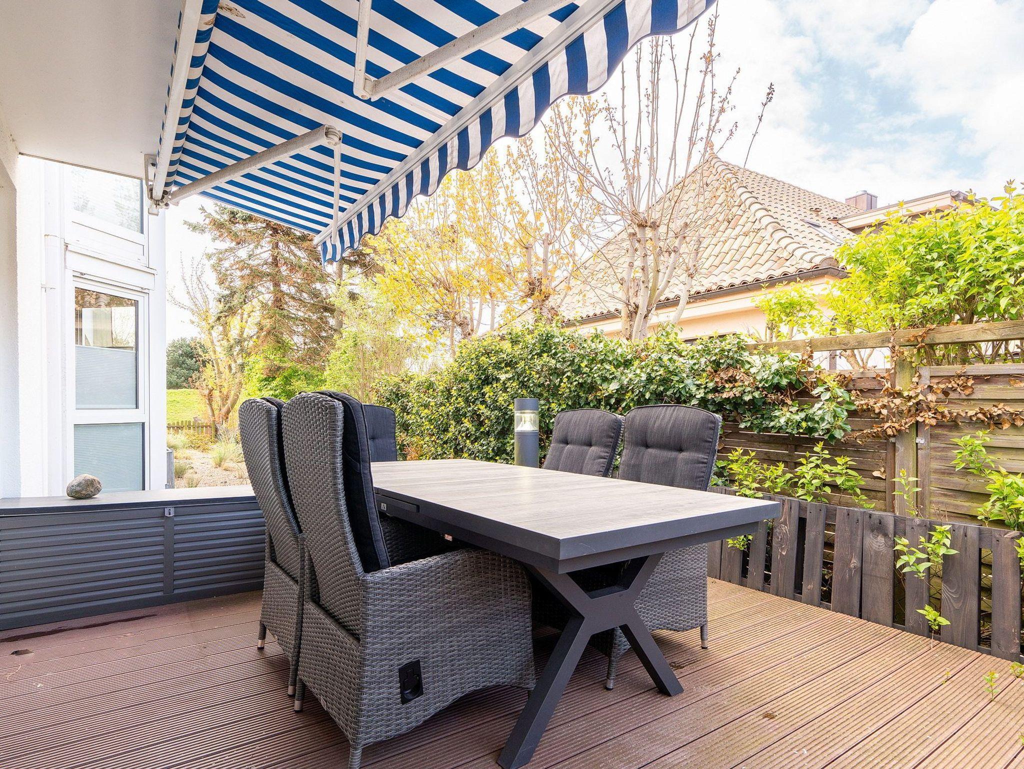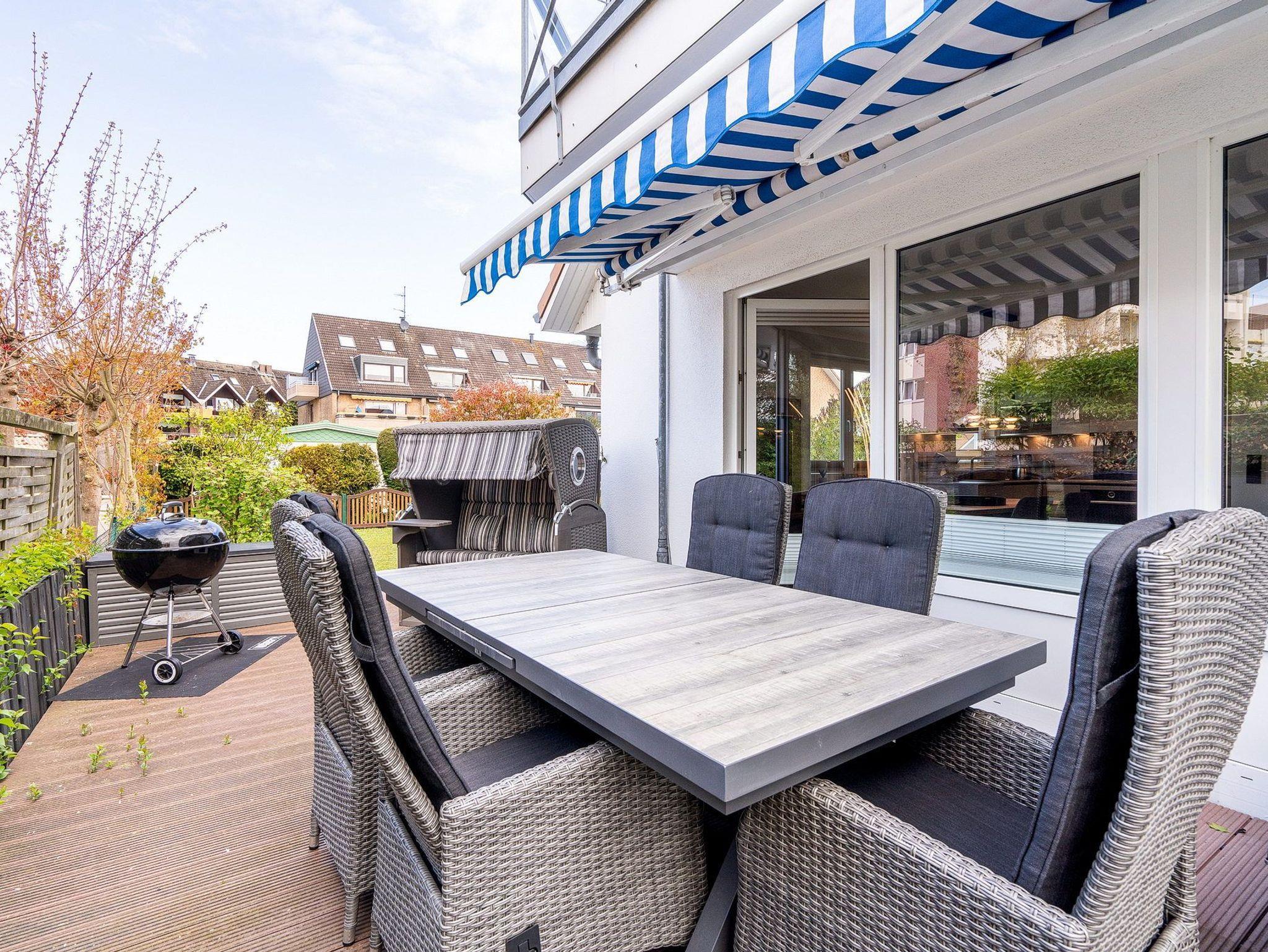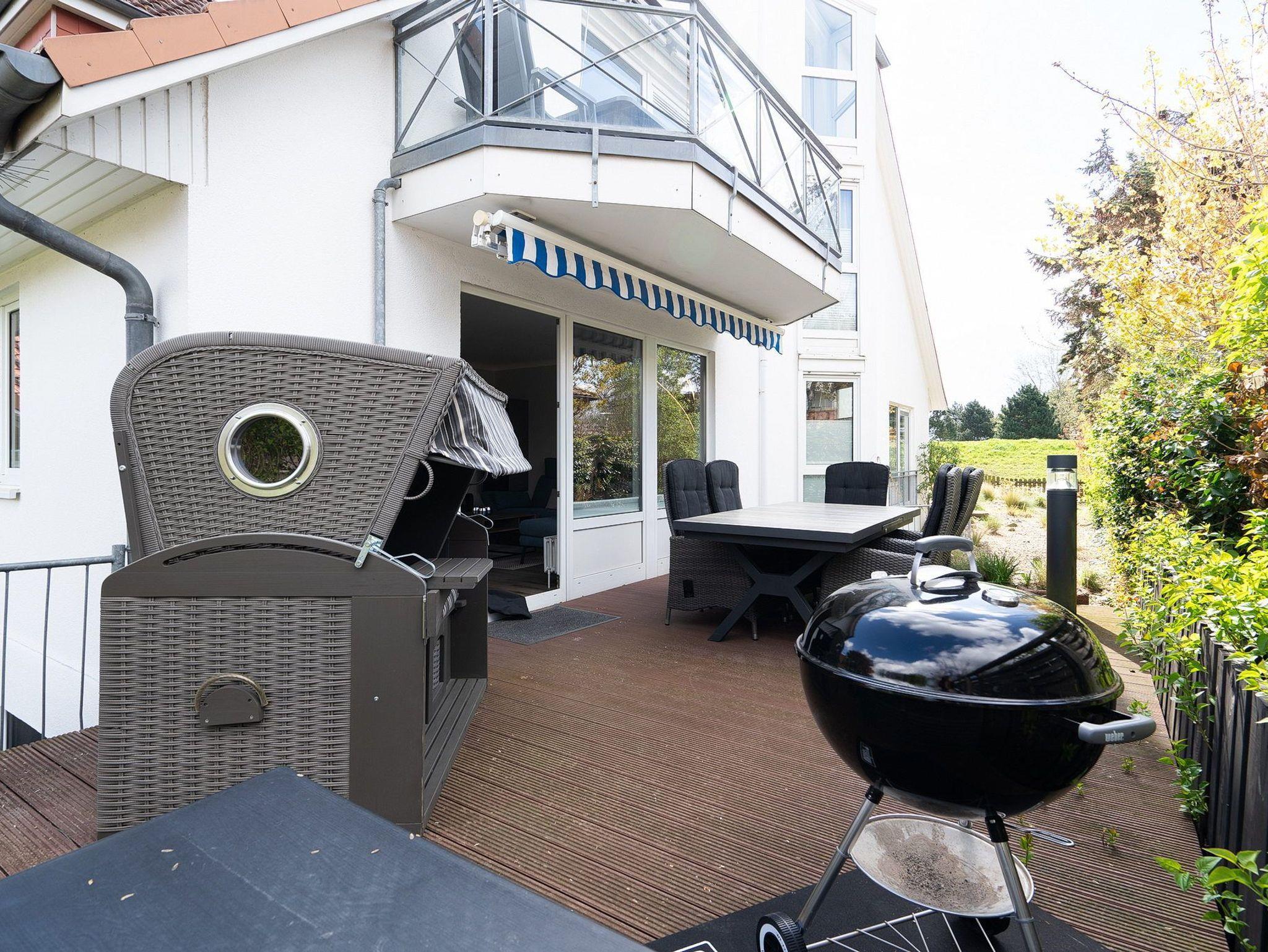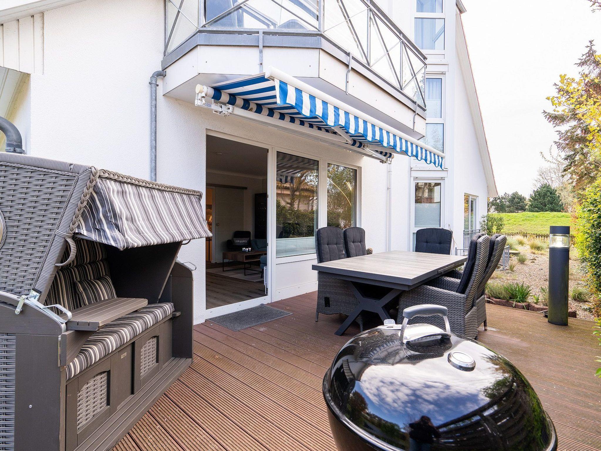Vom Wohn-Essbereich haben Sie direkten Zugang zur großen Terrasse, in westlicher Richtung, die ebenfalls mit viel Komfort ausgestattet wurde: großer Tisch mit Holzkeramikplatte, Rattan Stühle mit verstellbaren Rücklehnen, Markise sowie einen Standkorb. Hier können Sie Ihren Urlaubstag ganz entspannt starten oder in der Abendsonne ausklingen lassen. Gönnen Sie sich diese Oase der Entspannung.[nbsp][nbsp]