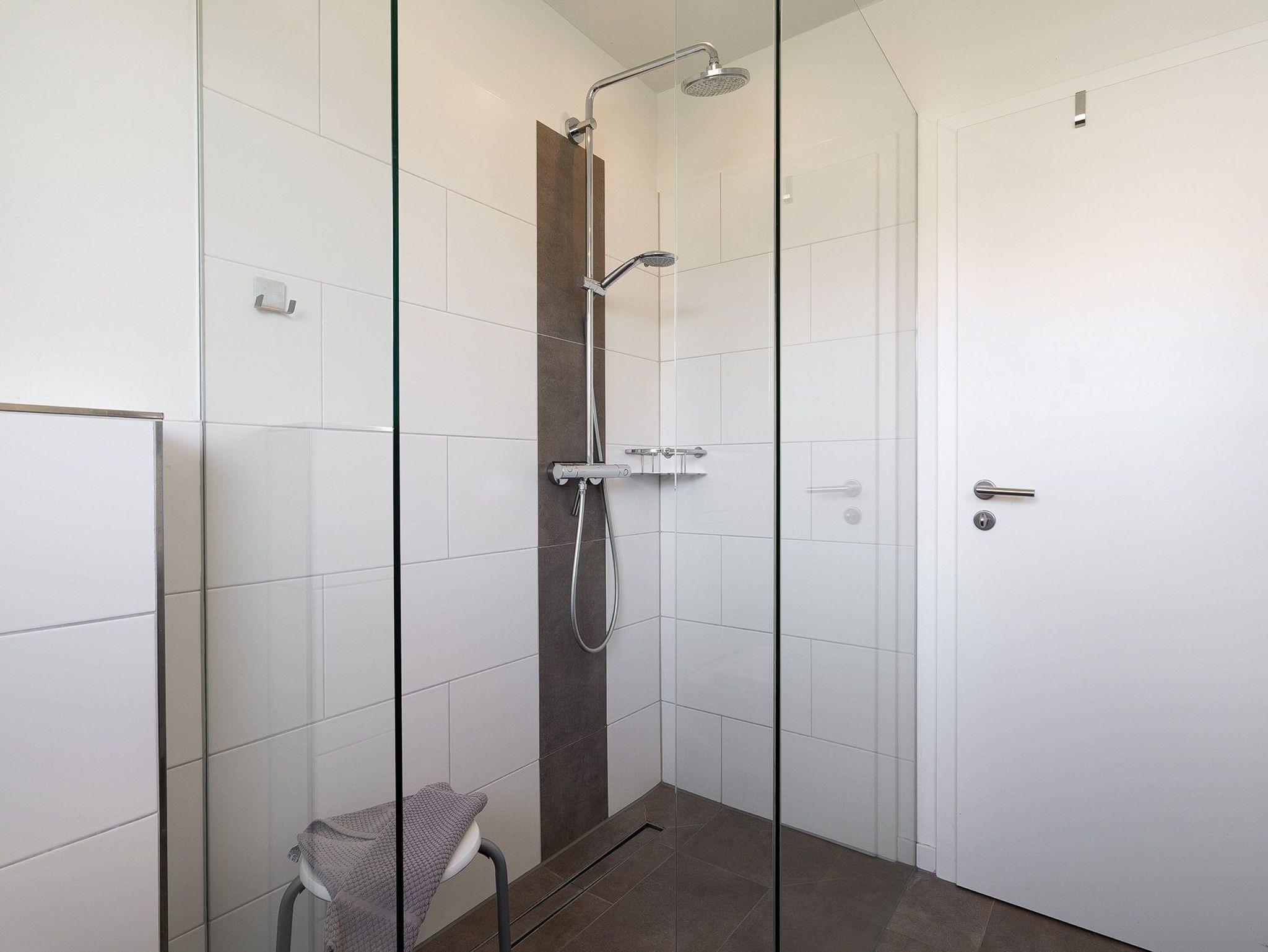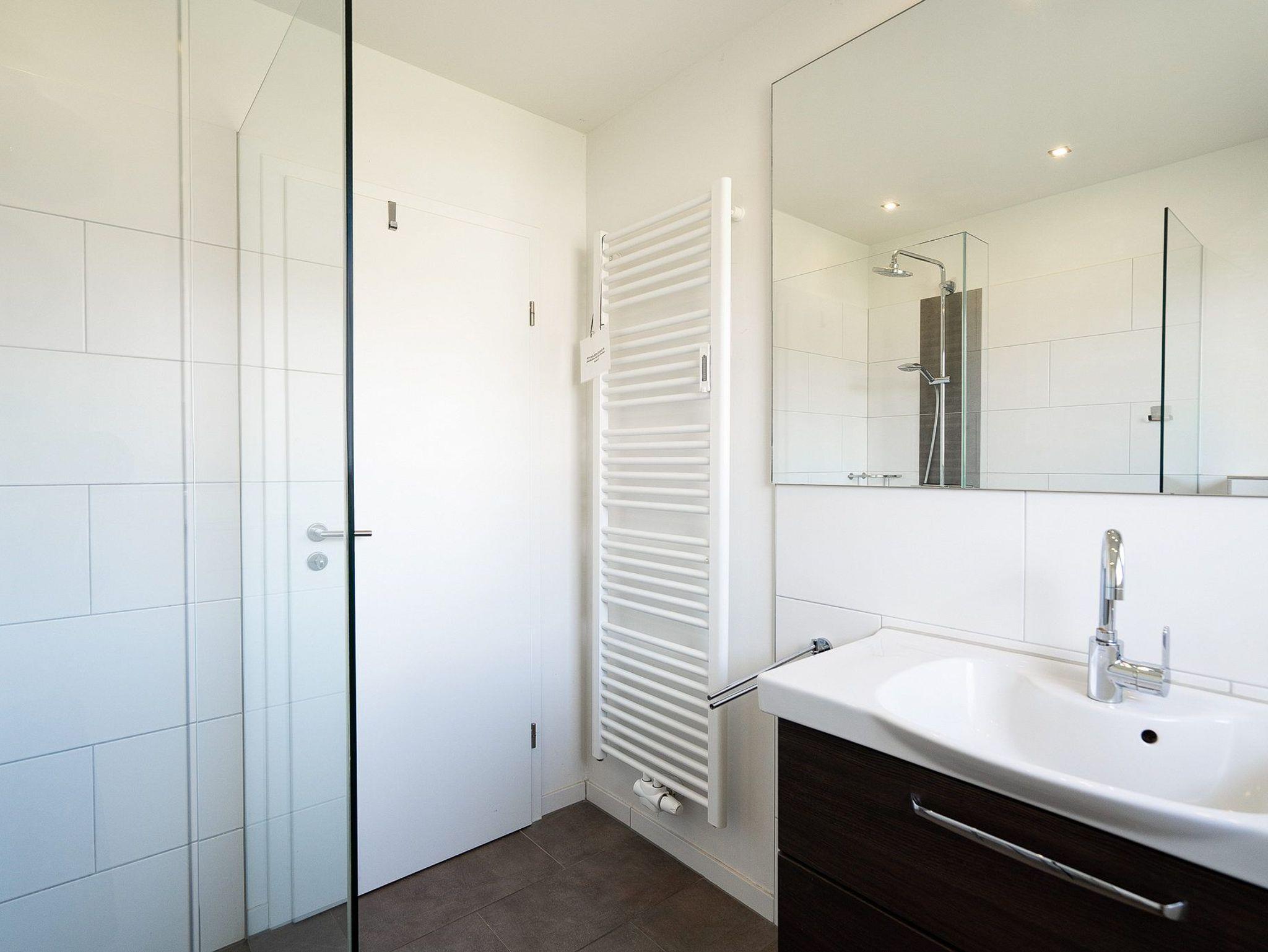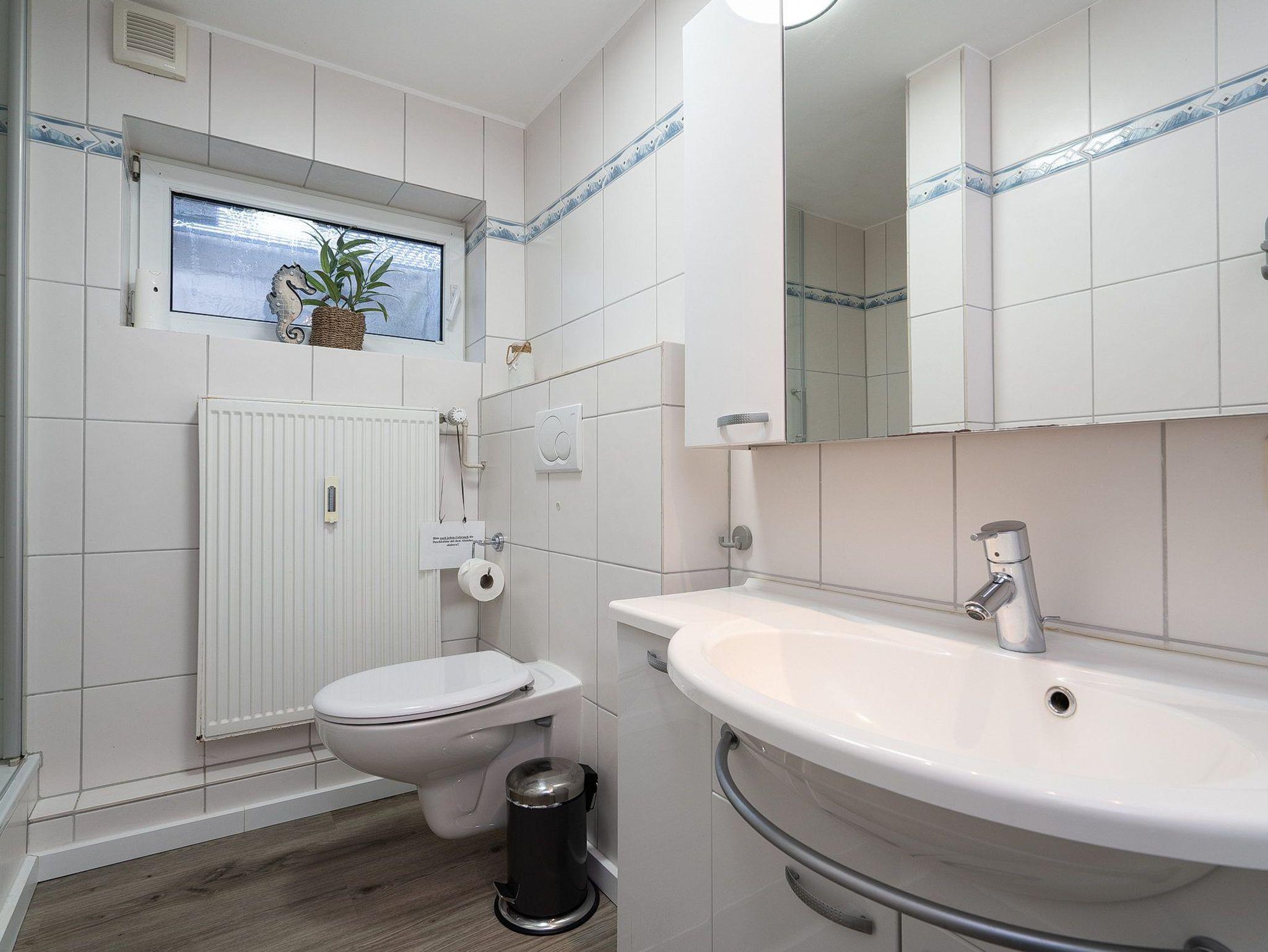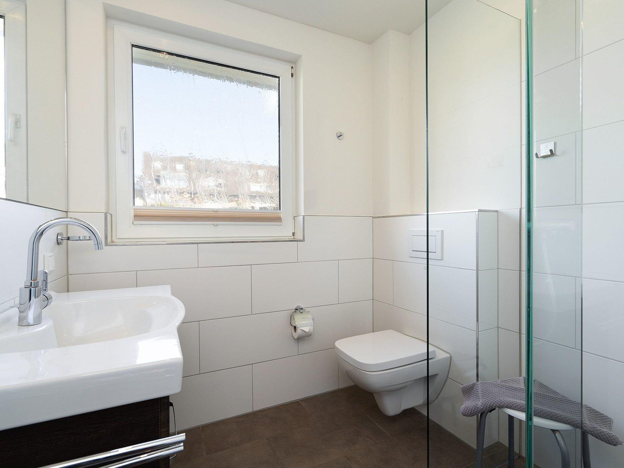 Das moderne gestaltete Tageslichtbad verfügt über eine geräumige und ebenerdige Dusche, WC und Waschtischanlage mit großem Wandspiegel.