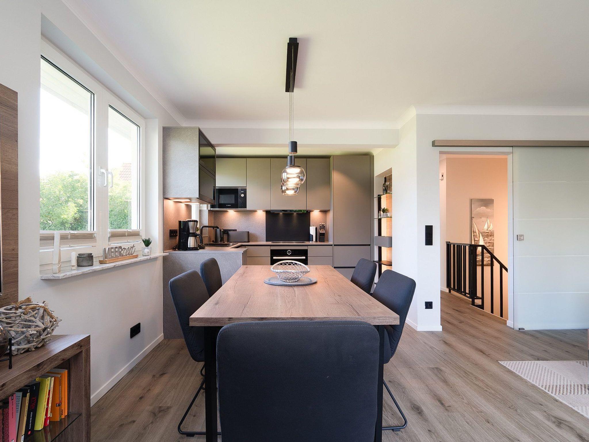 So können Sie sich nun auf einen geräumigen und modernen Wohn-/Essbereich mit offener Küche freuen - mit direkten Zugang zur Terrasse.