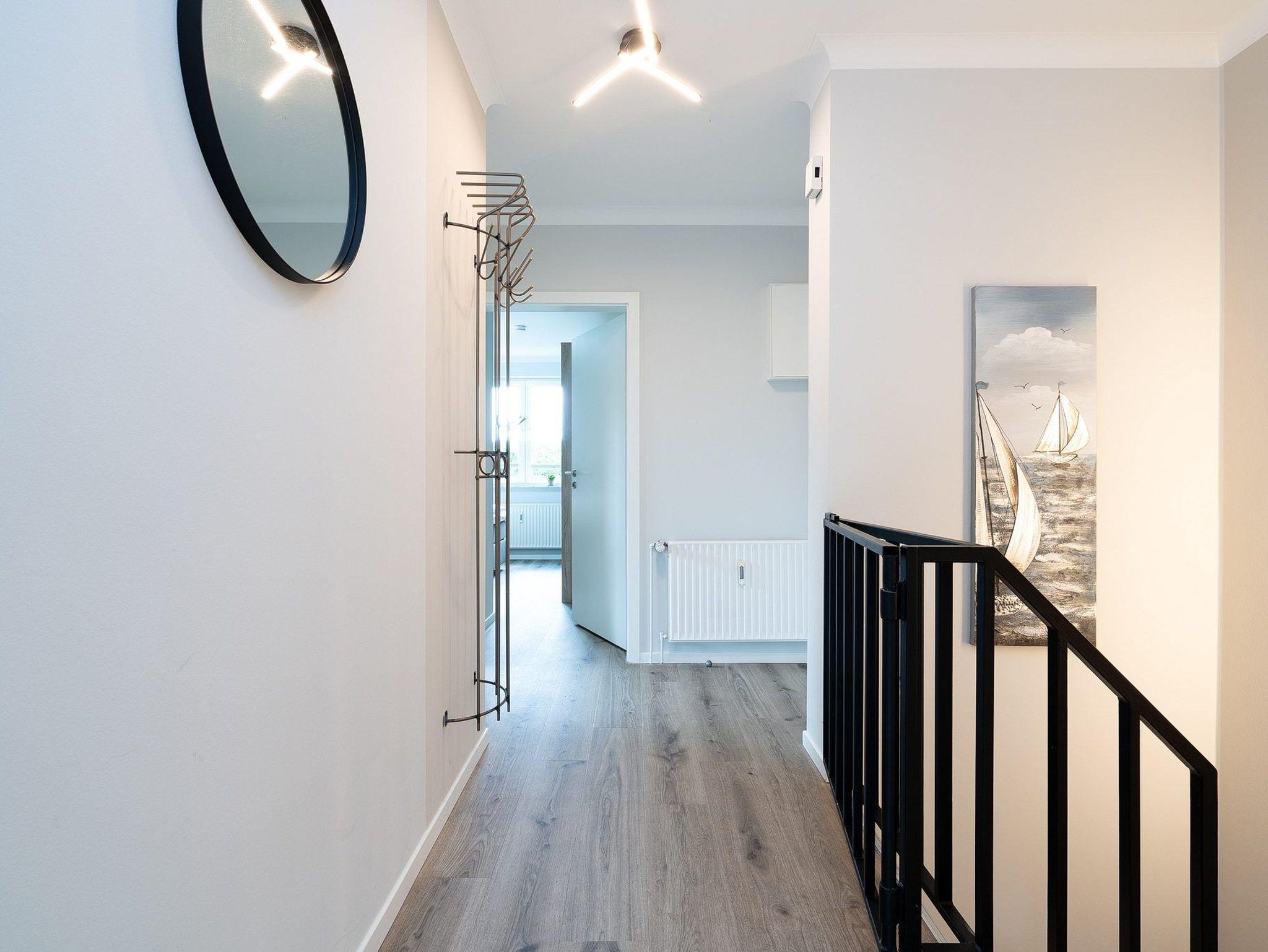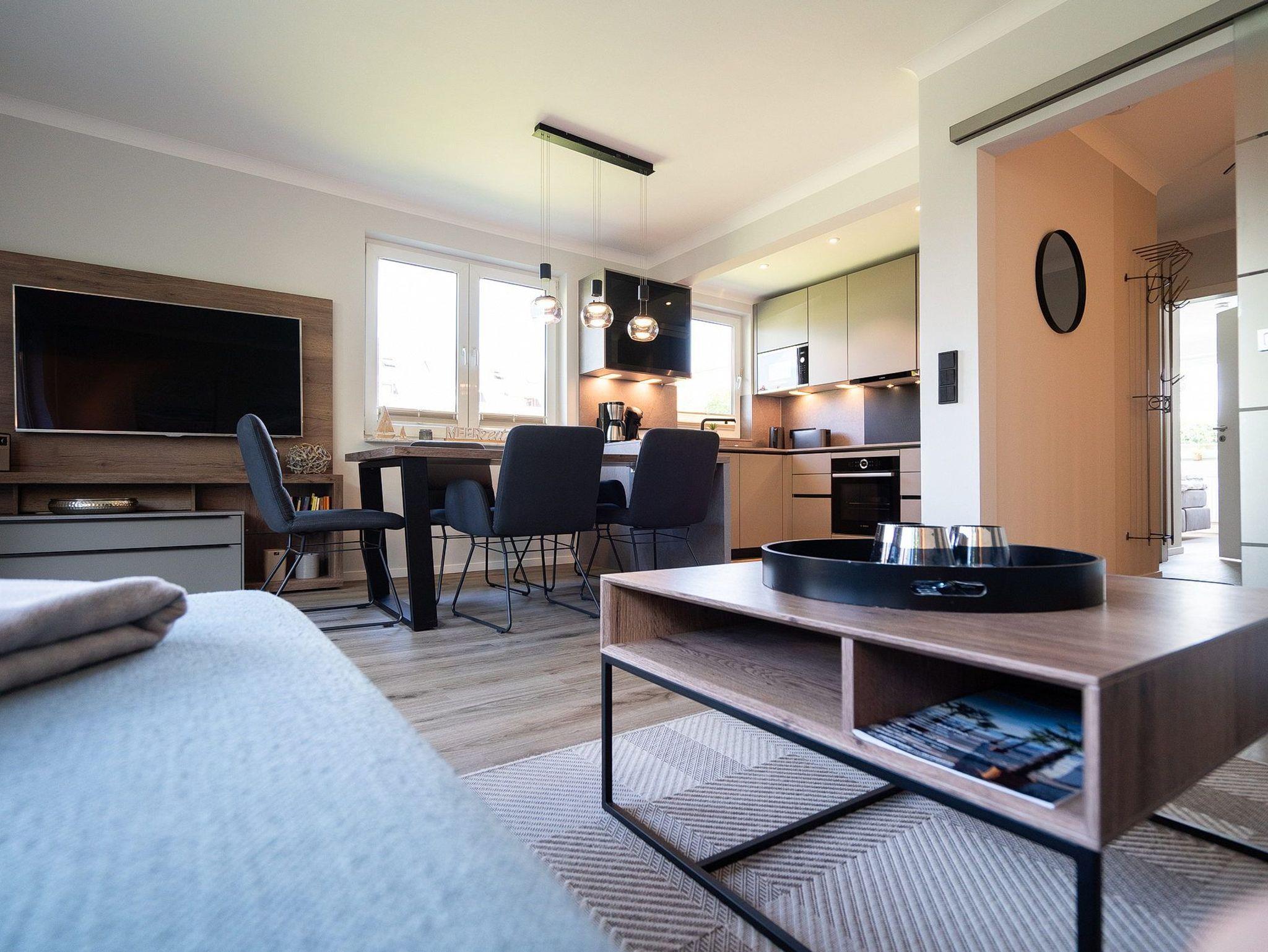 Die neue Küche wurde modern und sehr komfortabel ausgestattet: geräumiger Kühlschrank mit Gefrierfach, Backofen, Mikrowelle, Induktions-Kochfeld, Flachhaube, Geschirrspülmaschine und Kaffeemaschine. Am Esstisch können bis zu 5 Personen bequem Platz nehmen. Im Wohnbereich lädt das Stoff-Ecksofa zum Relaxen ein. Zu Ihrer Unterhaltung steht ein großer 55 Flachbildschirm-TV und ein Radio zur Verfügung. Der gesamte Bereich wurde durchgängig mit einem pflegeleichten, modernen Designboden ausgelegt.