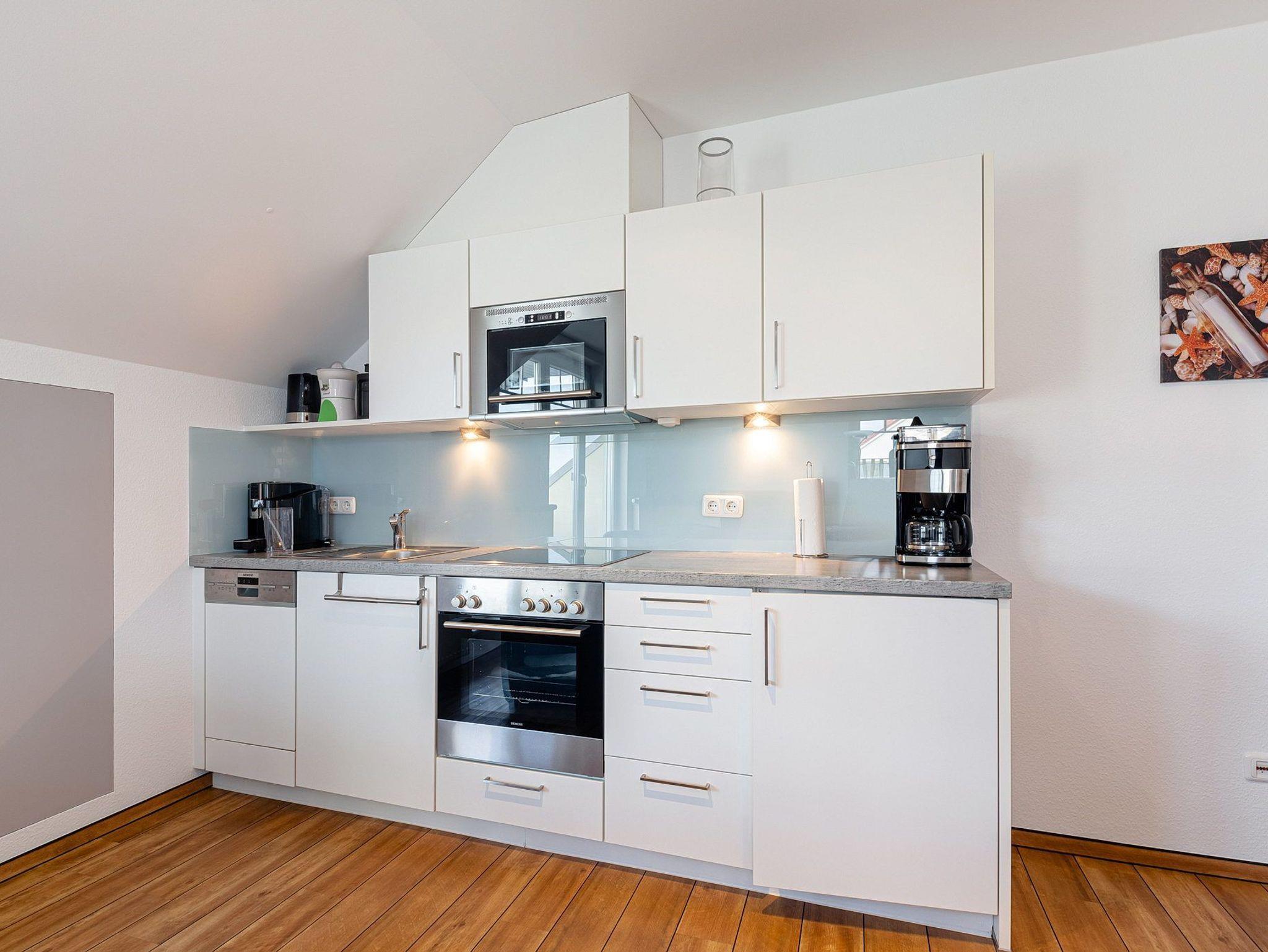 Moderne, komplett eingerichtete, zum Wohn- und Esszimmer offen Küche mit 4 Platten-Cerankochfeld, Backofen, Spülmaschine, Mikrowelle, Kühlschrank mit kleinem 3-Sterne Gefrierfach, Kaffeemaschine, Wasserkocher und Toaster.