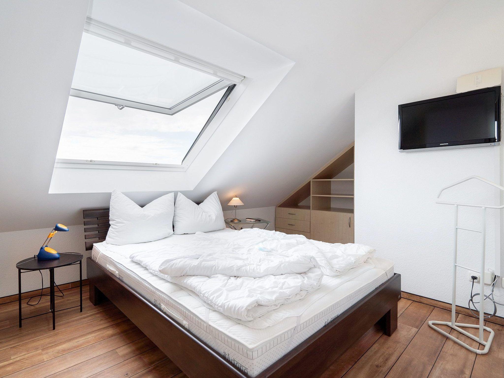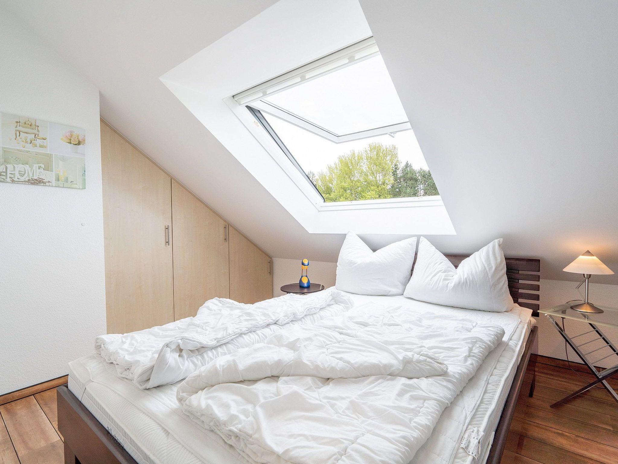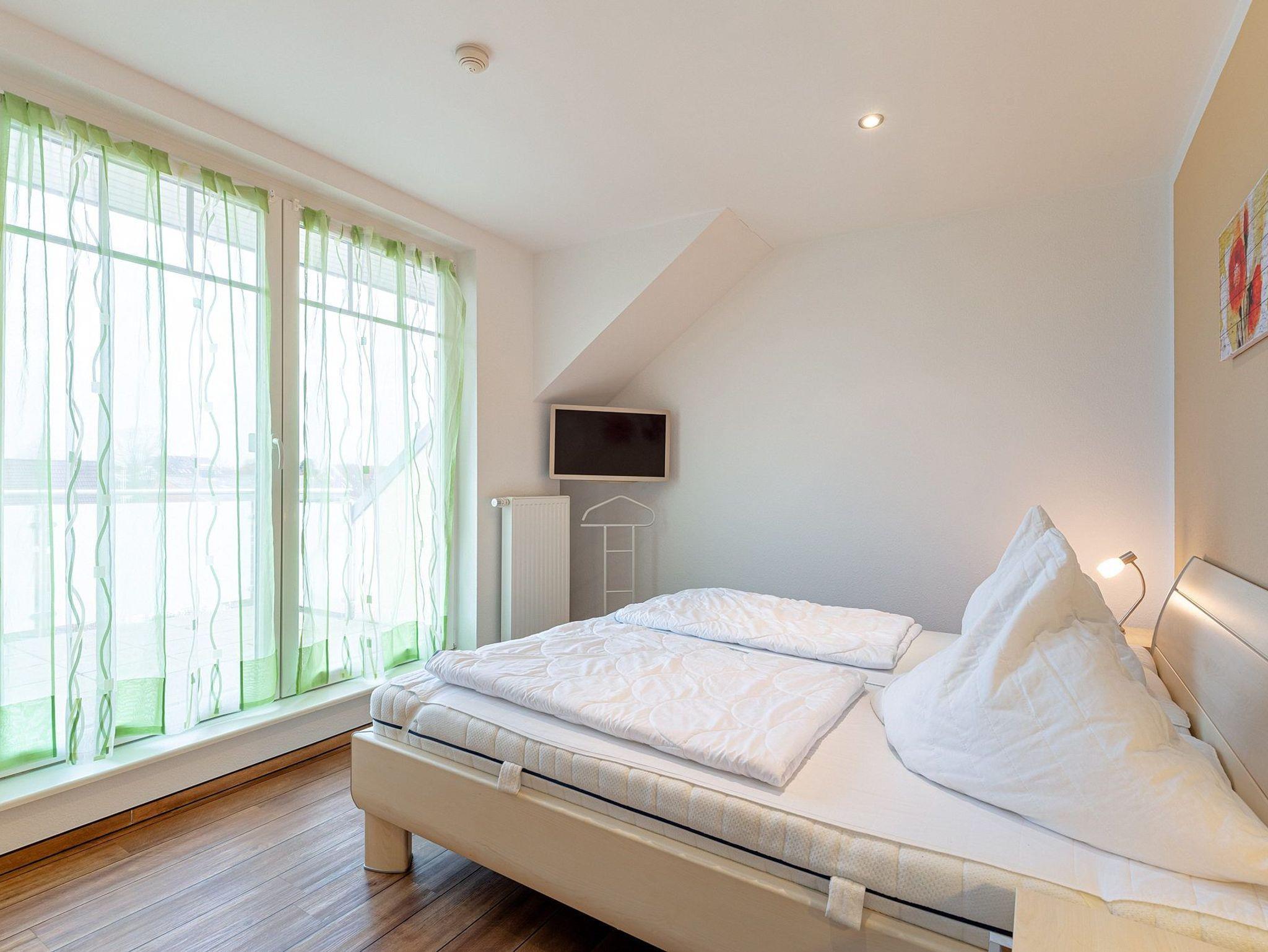 Das modern und hochwertig eingerichtete Schlafzimmer ist mit einem Doppelbett (2x 90x200cm) und einem Einbau-Kleiderschrank ausgestattet. Das Schlafzimmer ist mit Designer-Planken ausgelegt. Das Fenster lässt sich durch ein Außenrollo vollständig verdunkeln.