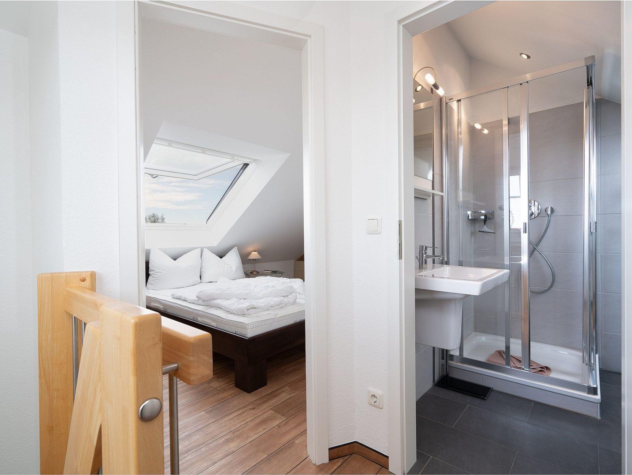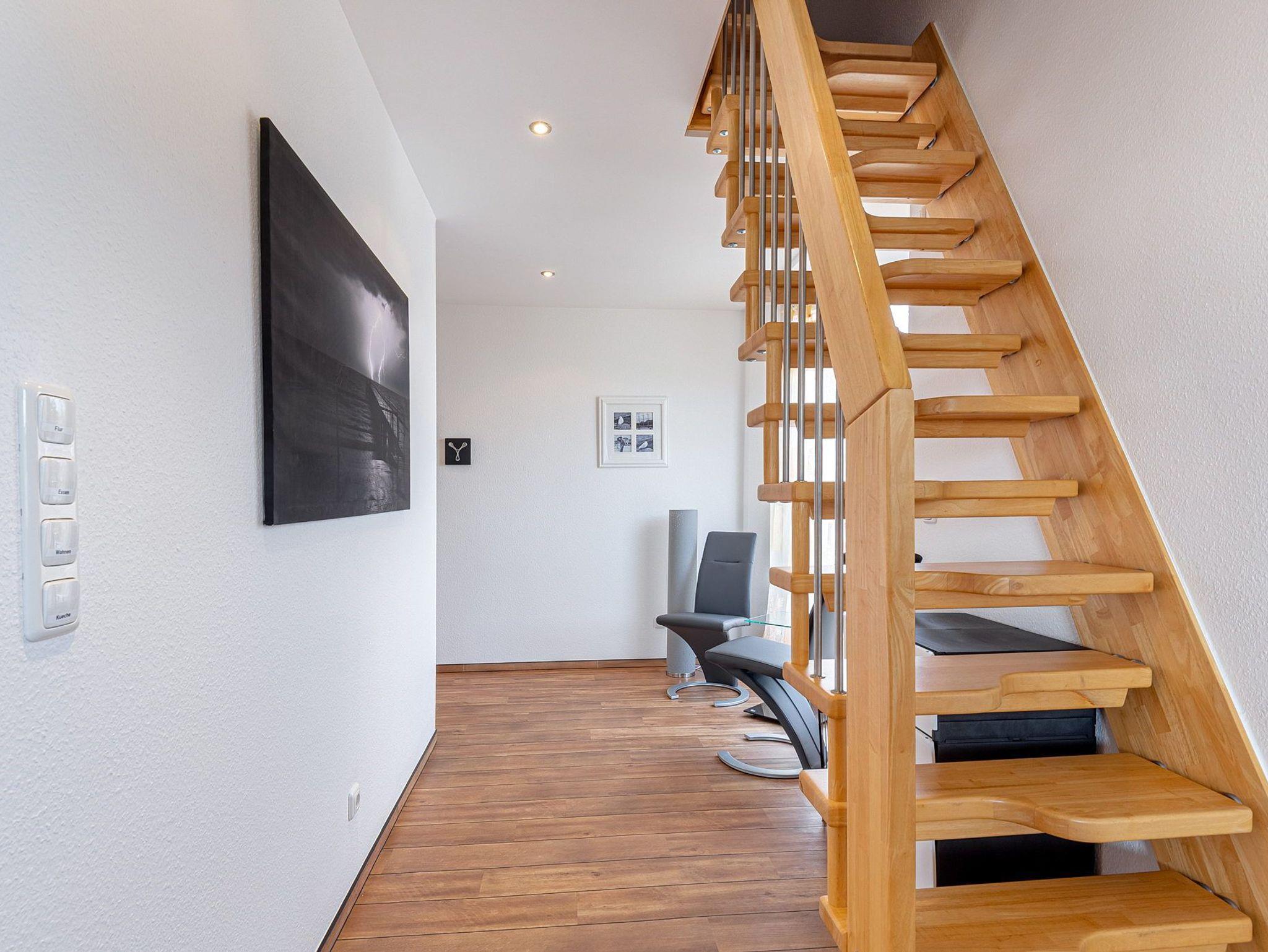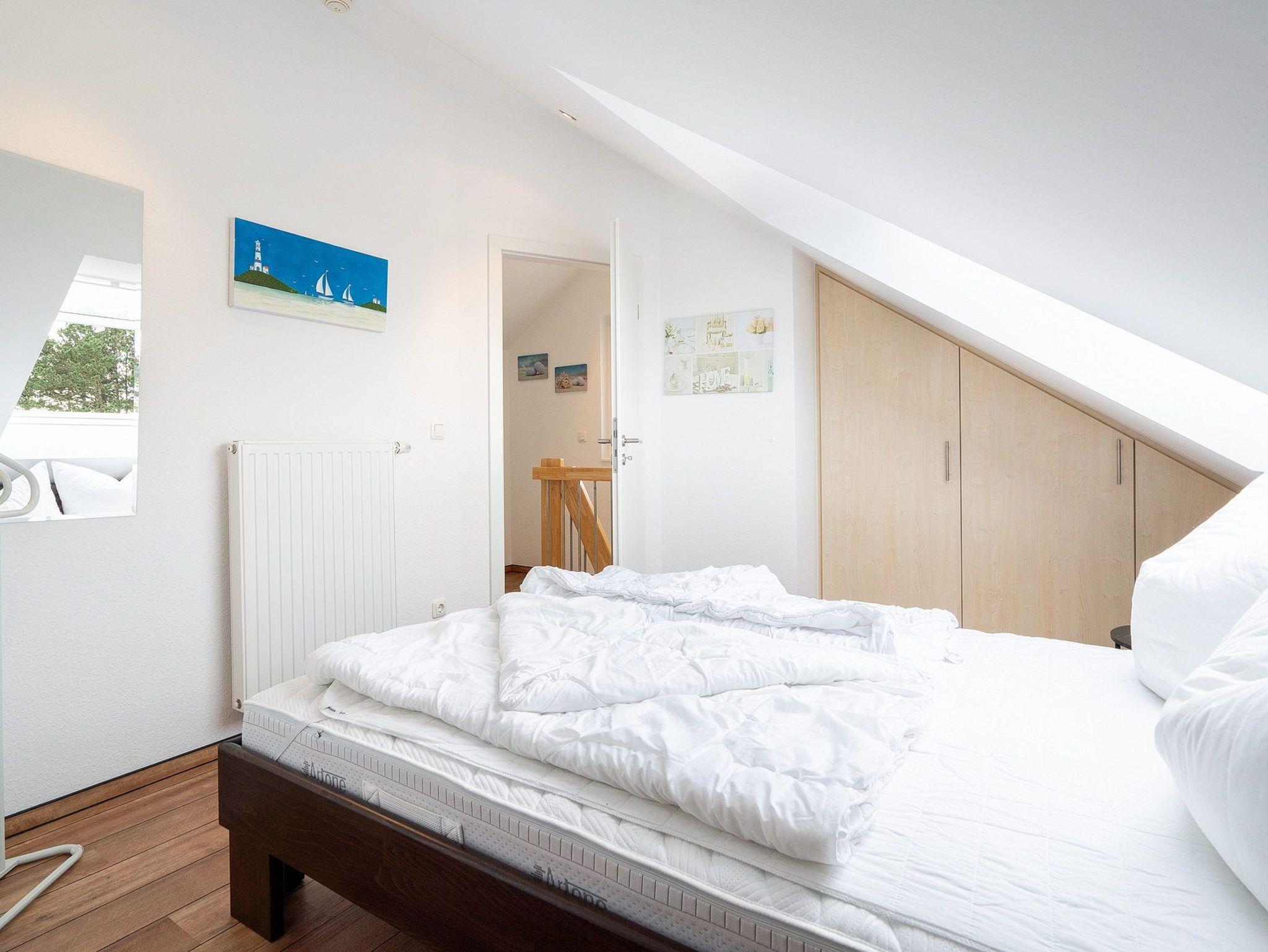 Das Kinderzimmer im 3. OG ist über eine Raumspartreppe erreichbar. Das Zimmer ist mit einem Einbauschrank und mit einem kleinen Doppelbett (140x200cm) ausgestattet. Zur Unterhaltung steht ein Flachbildschirm Fernseher zur Verfügung. Vom Kinderzimmer schöner Ausblick auf den Deich und die See. Das Zimmer ist mit Designer-Planken ausgelegt. Das Fenster lässt vollständig verdunkeln.