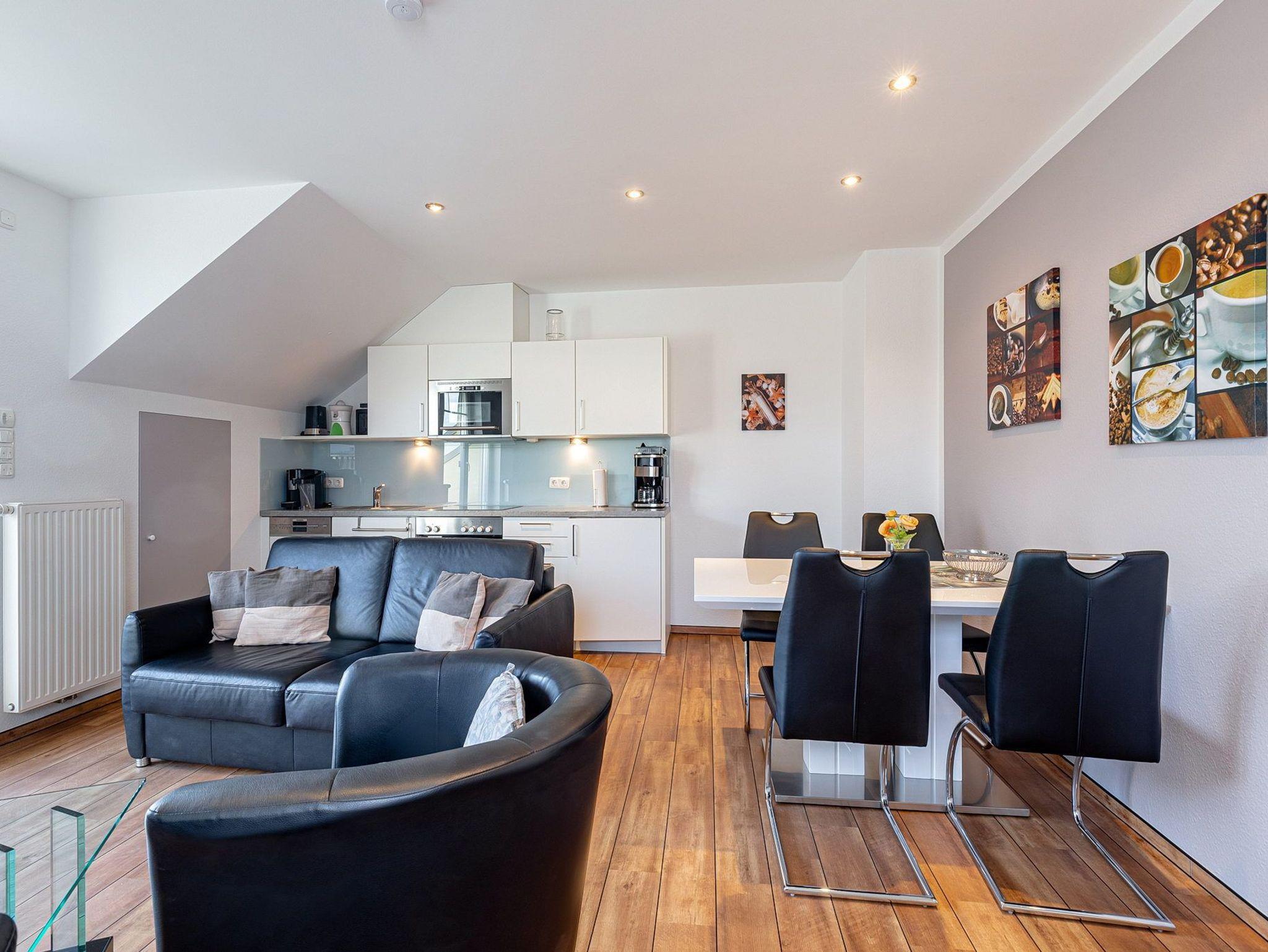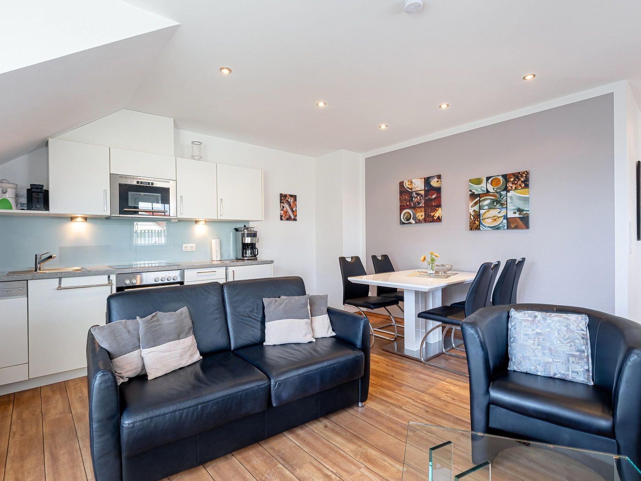 Helles, freundliches, modern und hochwertig ausgestattetes Wohn- und Esszimmer mit direktem Zugang zum Balkon mit schönem Blick auf den Deich bis teilweise zur See. Das Wohn- und Esszimmer ist mit einer Lederschlafcouch (135x195cm), einem Couchtisch, einer Kommode und einem Essplatz für 4 Personen ausgestattet. Das Wohn- und Esszimmer ist mit Designer-Planken ausgelegt. Zur Unterhaltung stehen ein Flachbildschirm und eine Mini-Stereoanlage zur Verfügung. Die Fenster lassen sich durch Außenrollos vollständig verdunkeln.