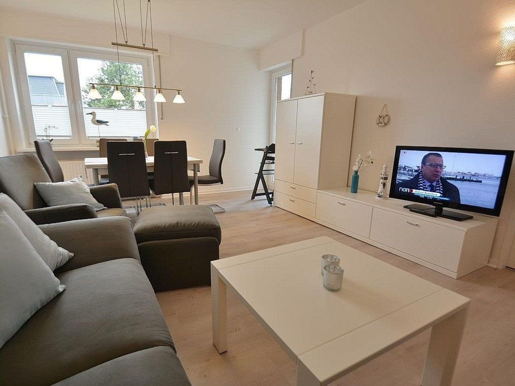 Der moderne helle Wohn- und Essbereich ist mit einer Eckcouch, einem Sessel mit Fußhocker und einem Couchtisch sowie einem Essplatz für 6 Personen ausgestattet. Zur Unterhaltung stehen ein Flachbild-Fernseher und Radio-CD-Spieler zur Verfügung.