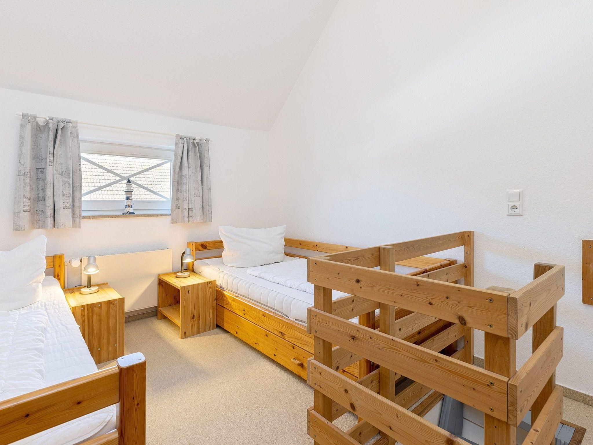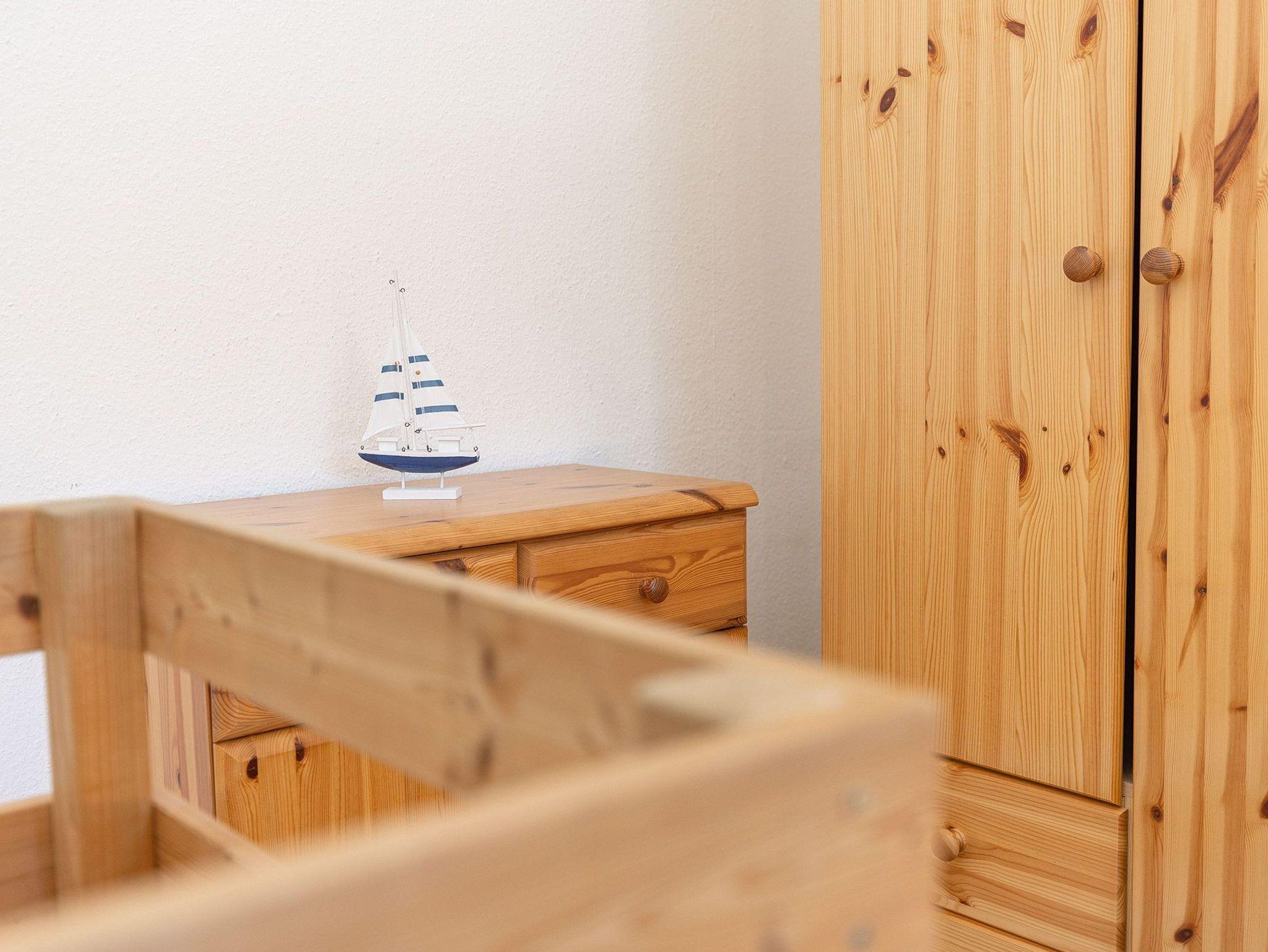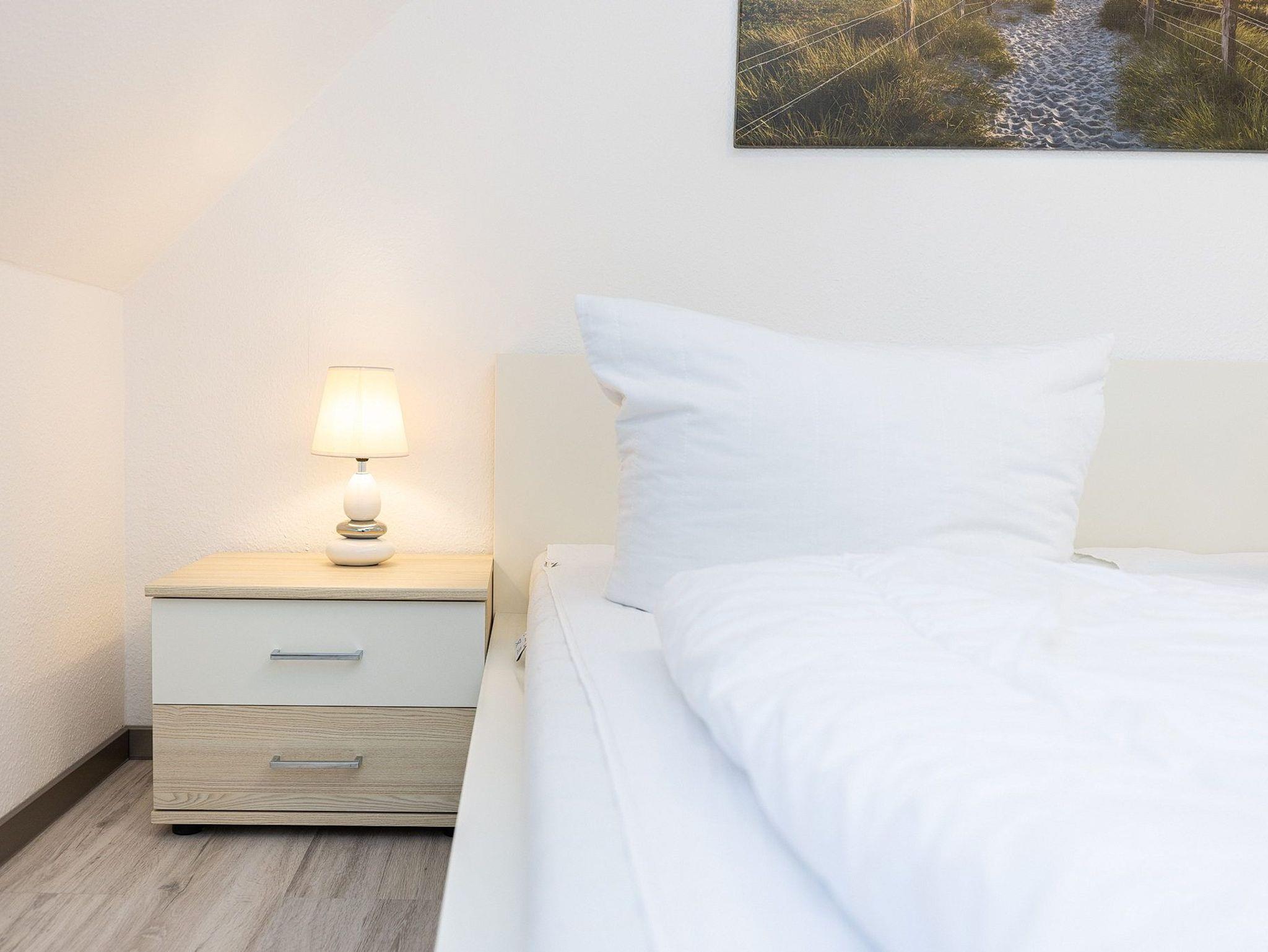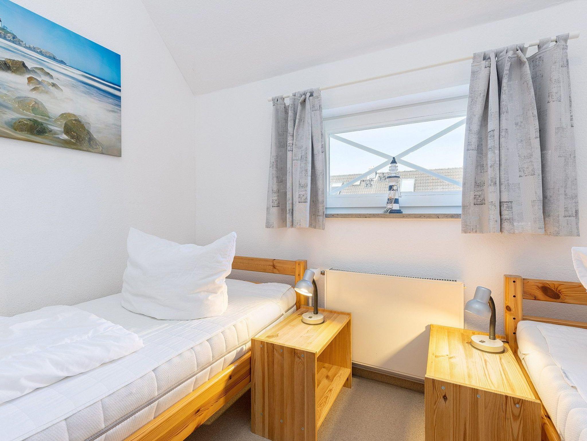 Das Schlafzimmer im 2. OG ist über eine steile und sehr geräuscharme Raumspartreppe erreichbar. Das Schlafzimmer ist mit 2 getrennten Betten (90x200cm), zwei Nachttischen, einem Kleiderschrank und einer Kommode ausgestattet. Das Zimmer ist mit Teppichboden ausgelegt. Das Fenster lässt sich durch einen blickdichten Vorhang verdunkeln.
