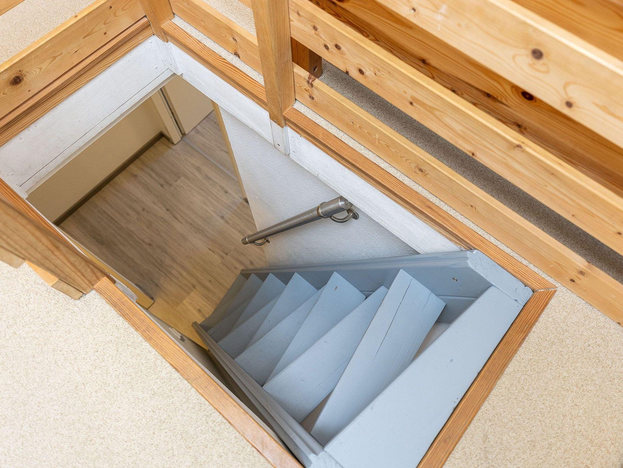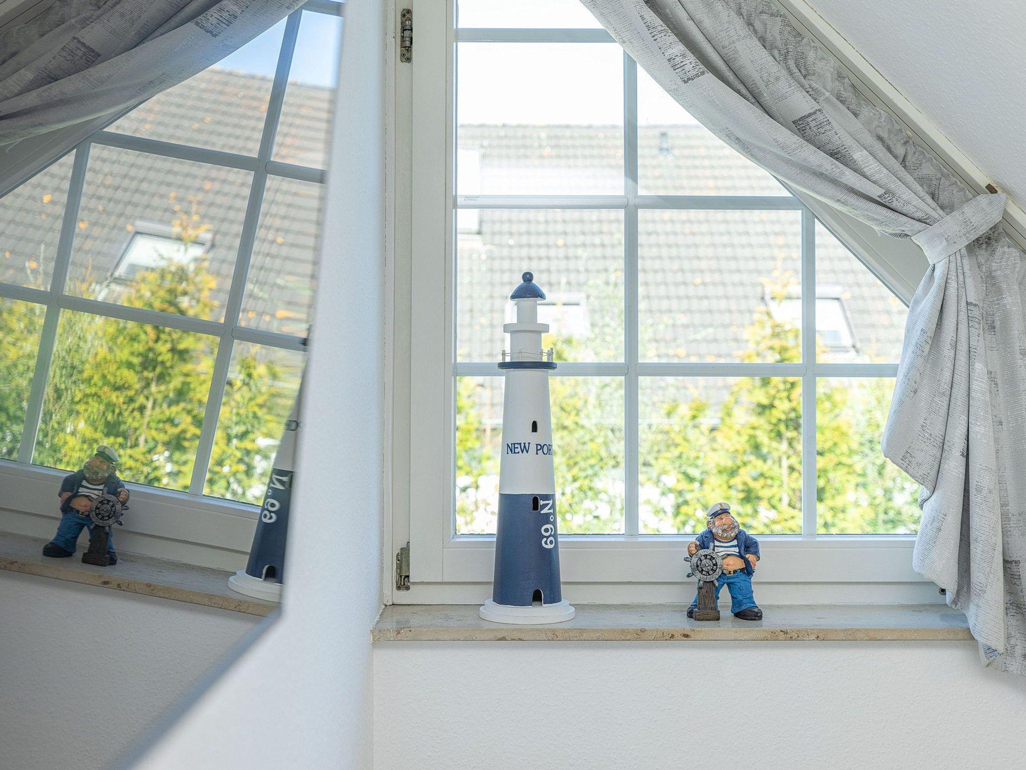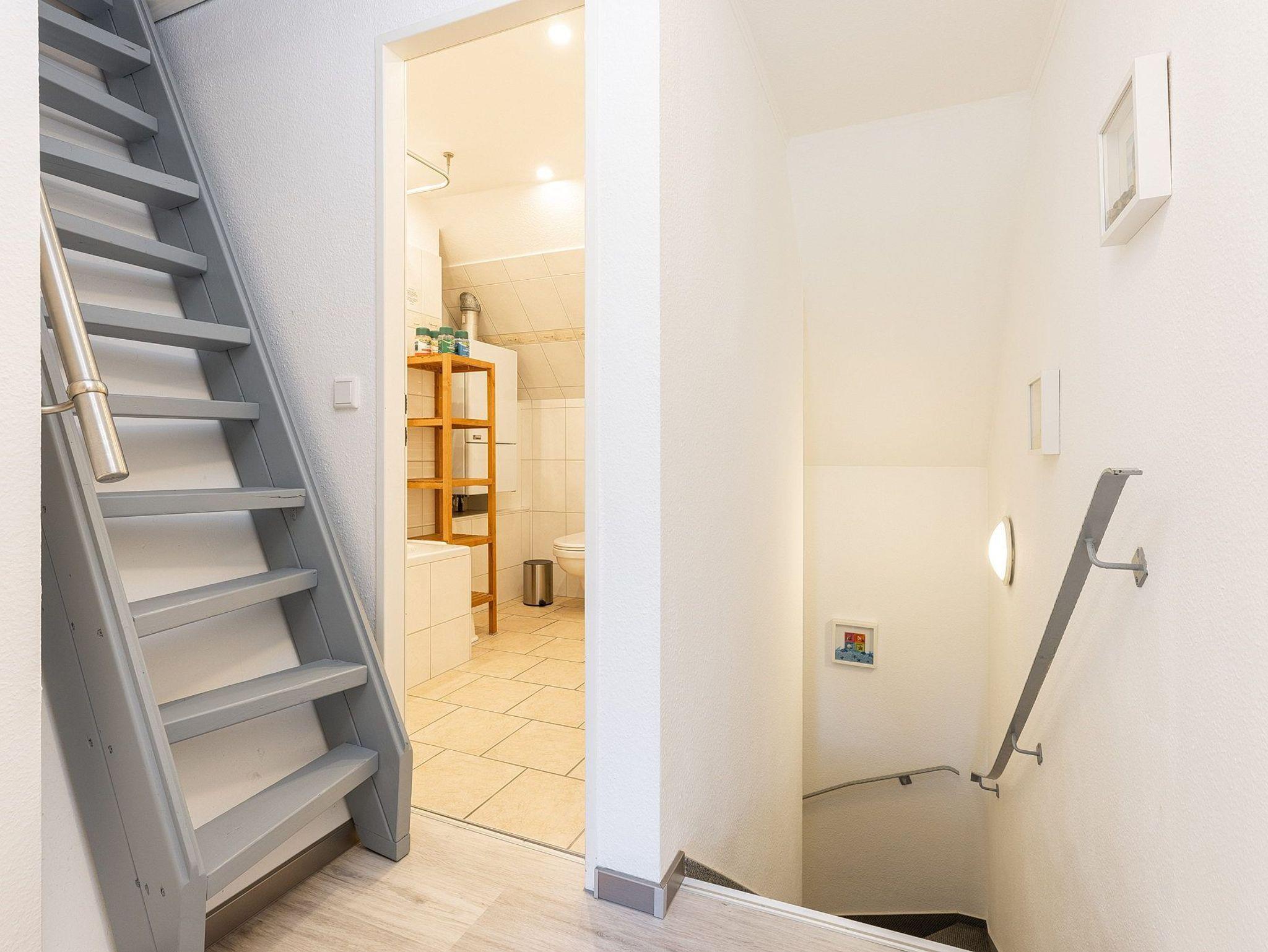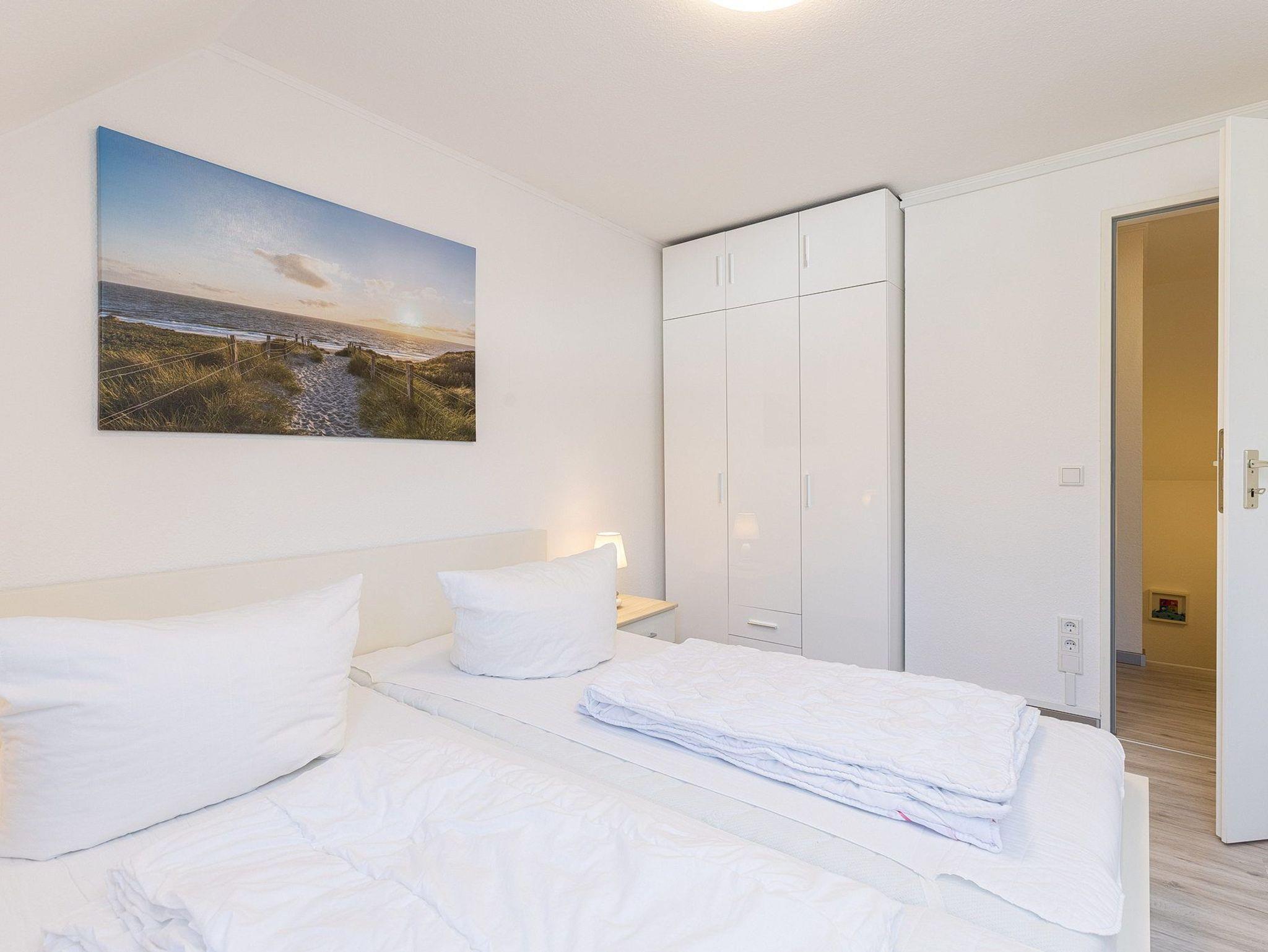 Das Schlafzimmer im 2. OG ist über eine steile und sehr geräuscharme Raumspartreppe erreichbar. Das Schlafzimmer ist mit 2 getrennten Betten (90x200cm), zwei Nachttischen, einem Kleiderschrank und einer Kommode ausgestattet. Das Zimmer ist mit Teppichboden ausgelegt. Das Fenster lässt sich durch einen blickdichten Vorhang verdunkeln.