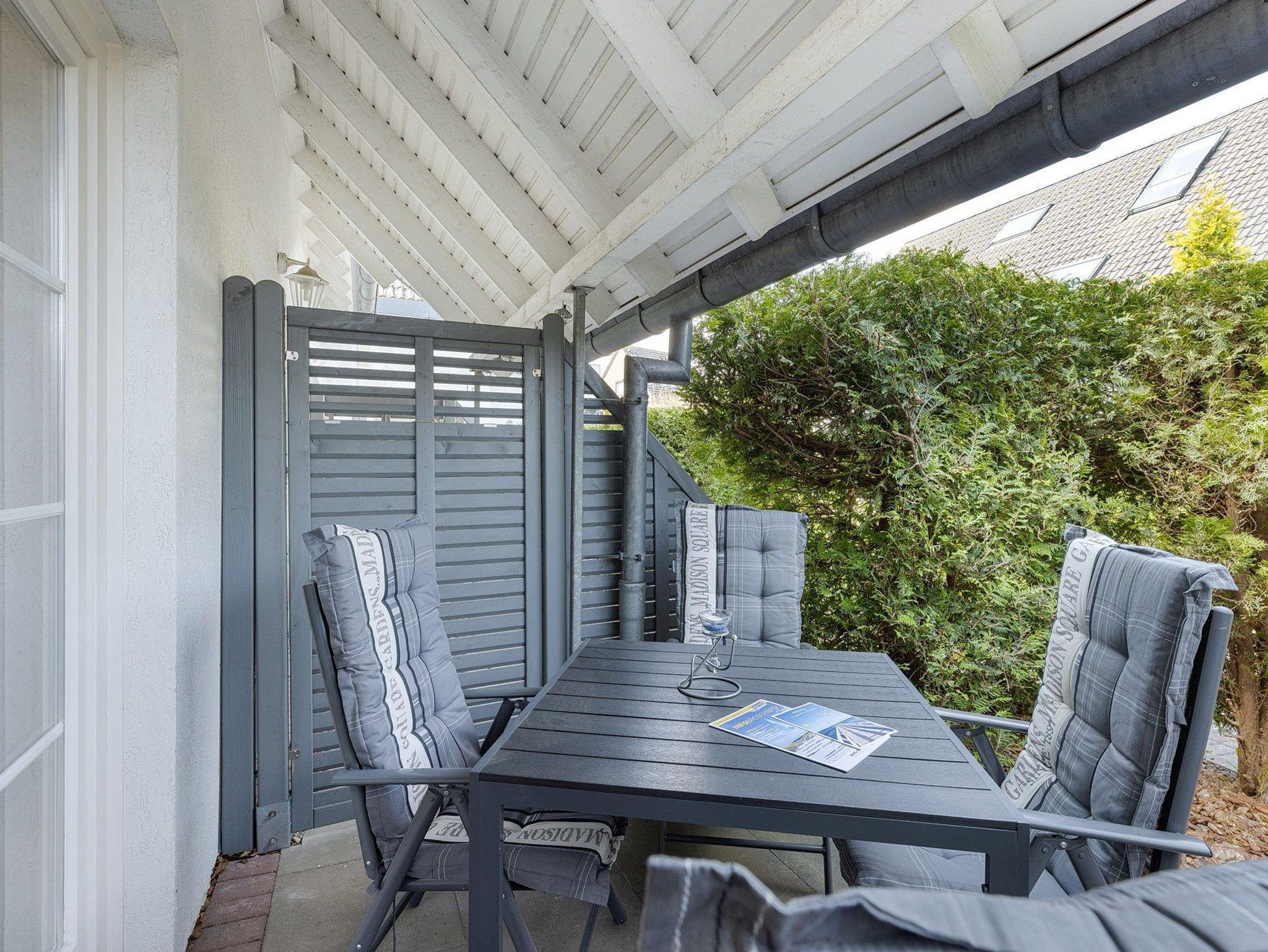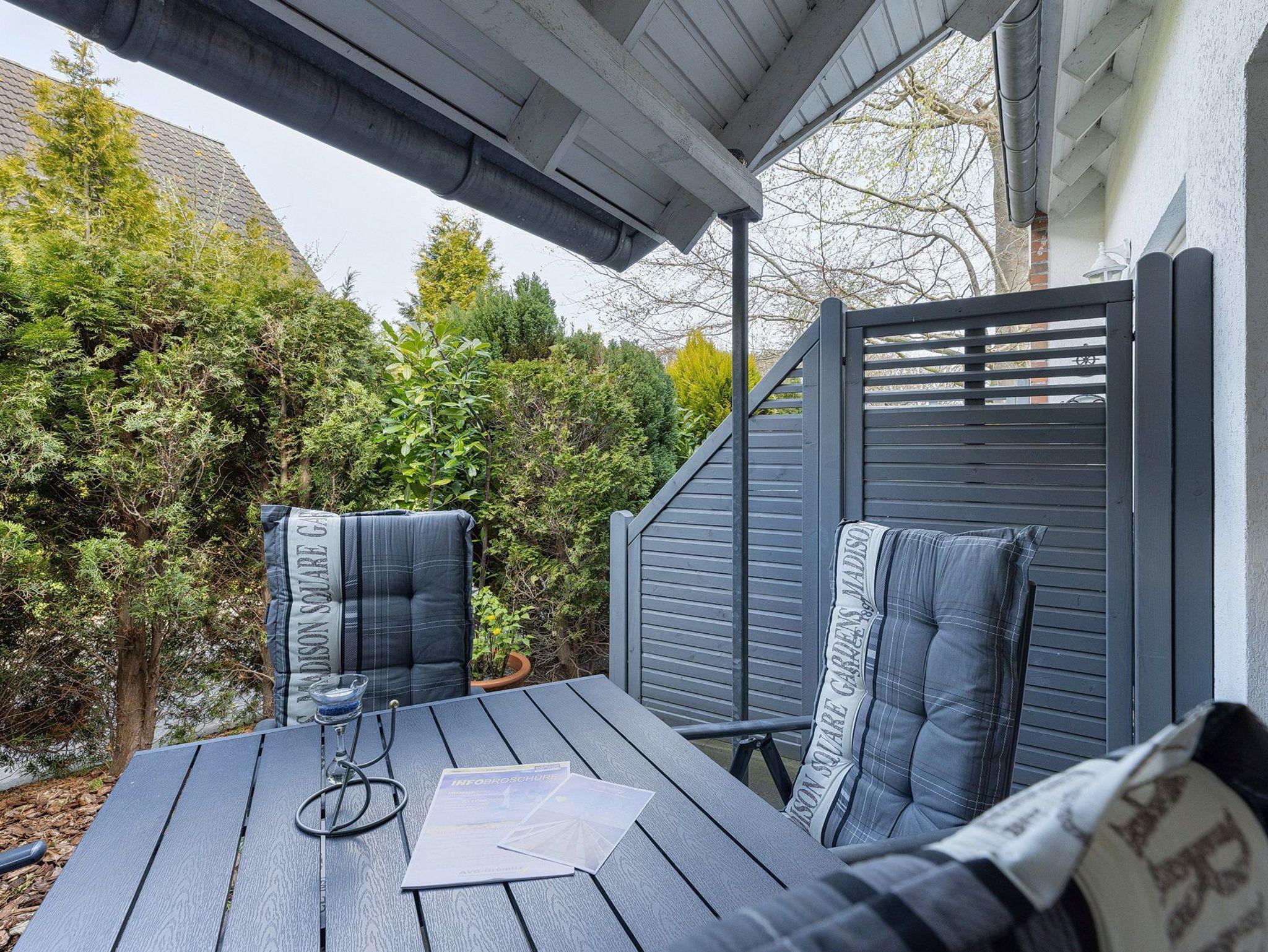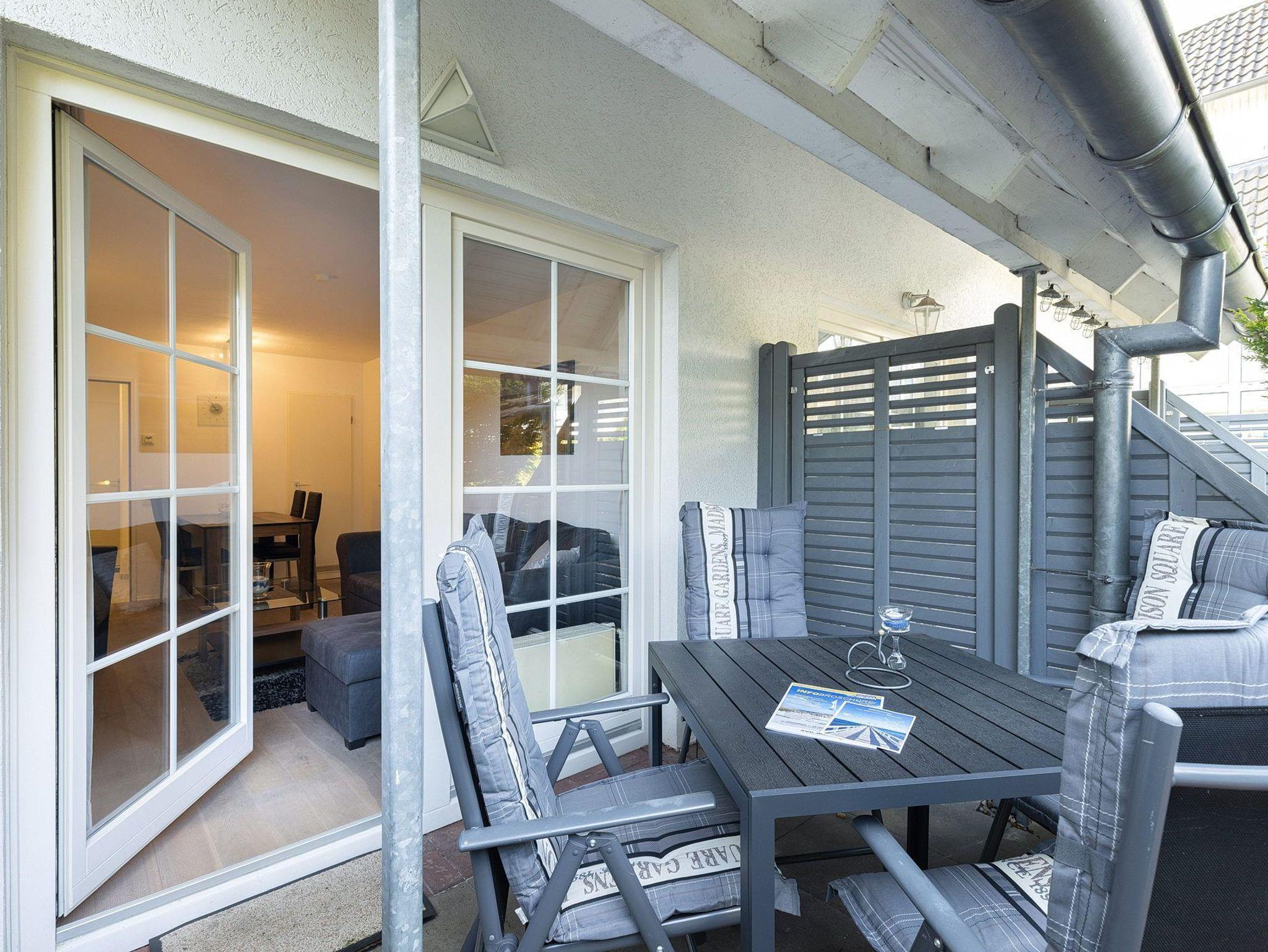 Terrasse in nord-westliche Richtung, Fahrrad-Abstellfläche im Freien hinter dem Gebäude. Kostenloser Strandkorb am Strand Nähe Seebrücke Richtung Grömitzer Welle im Zeitraum vom 15. April bis 20. September, unbegrenzte W-Lan Nutzung inklusive.