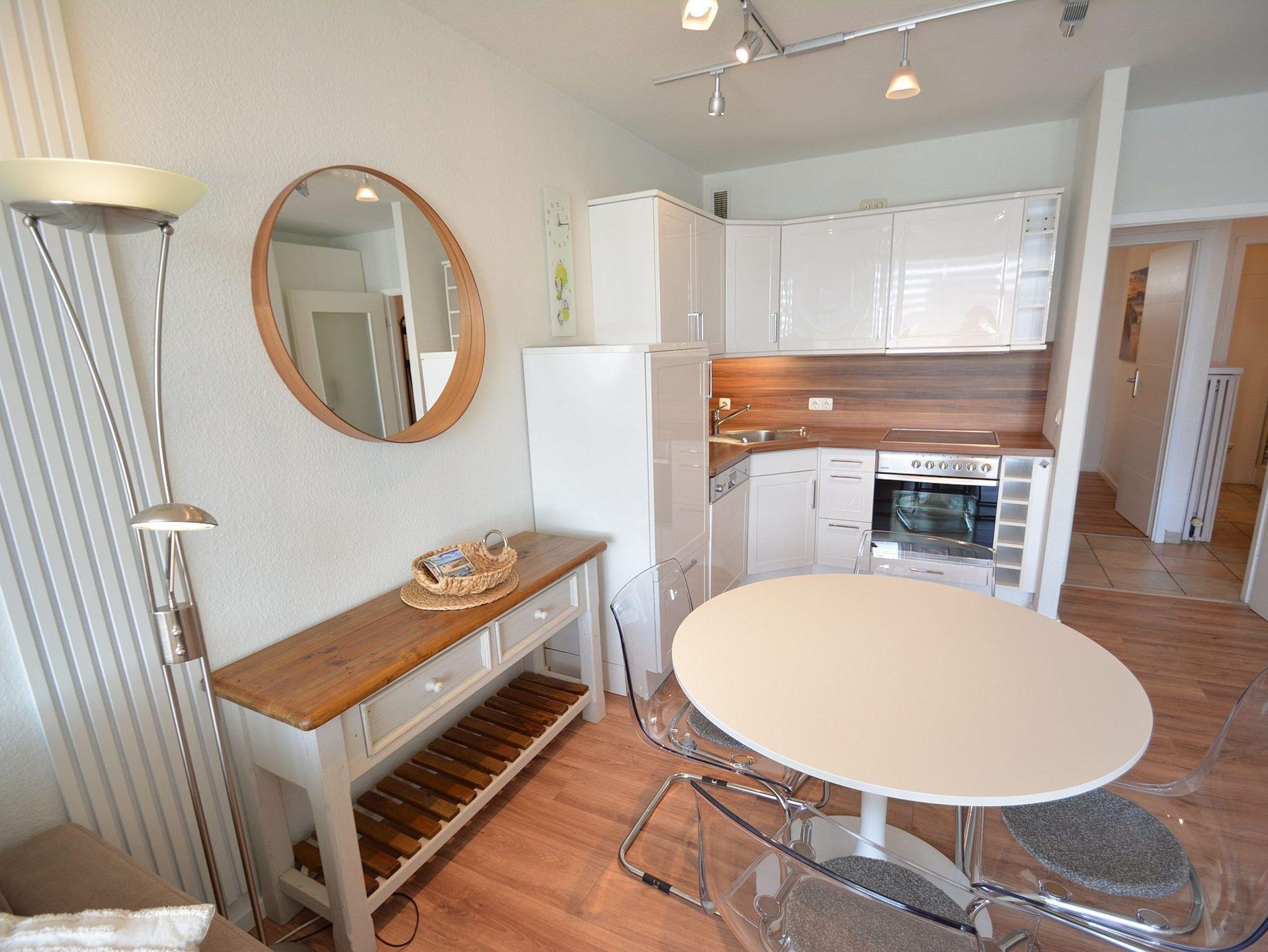 Kleine im Wohnbereich integrierte Küchenzeile mit 4-Platten-Cerankochfeld, Backofen Spülmaschine und Kühlschrank mit kleinem 3-Sterne Gefrierfach. Außerdem stehen ein Toaster, eine Kaffeemaschine und ein Wasserkocher zur Verfügung.