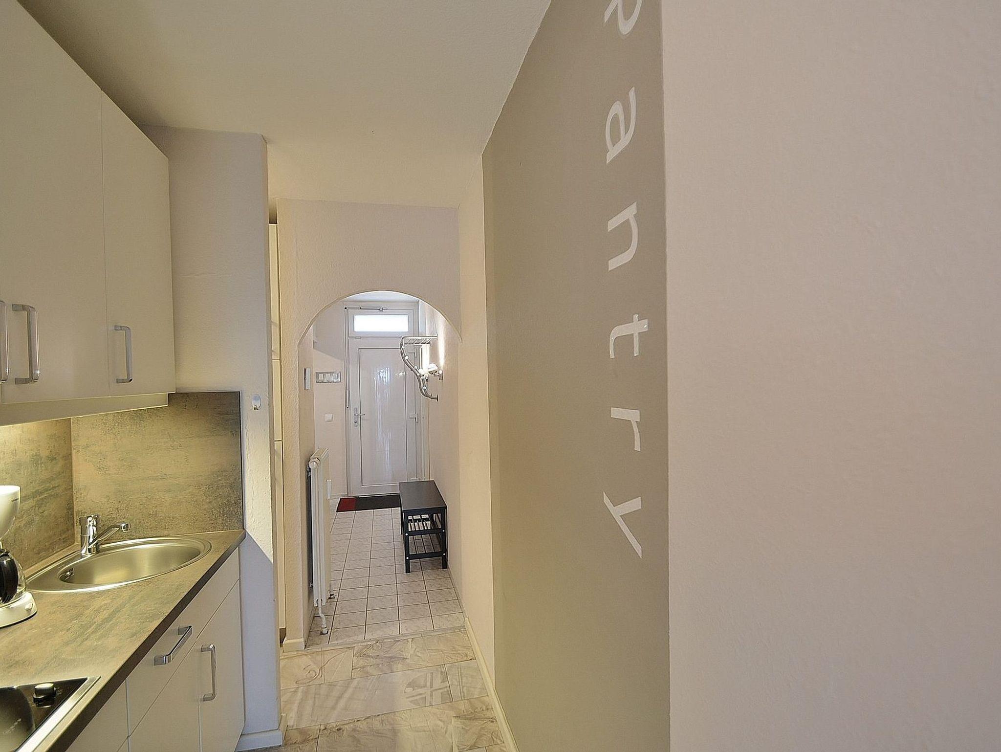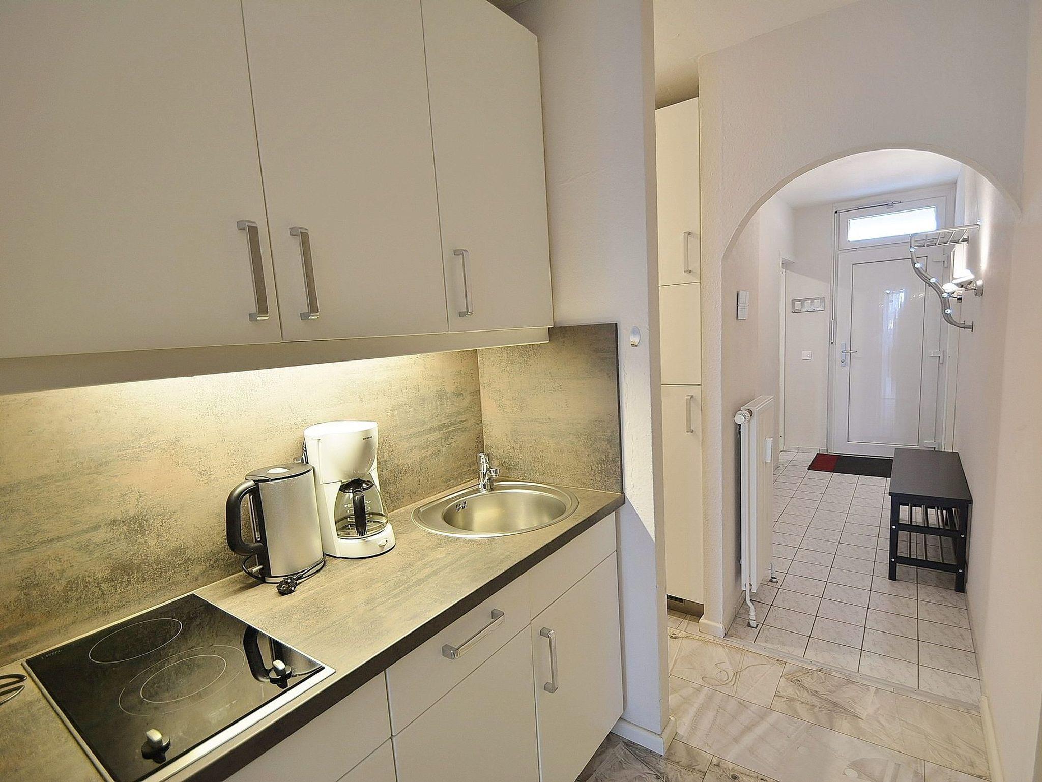 Moderne, hochwertige Pantry-Küche im Flur. Die Küche ist mit einem 2-Platten Cerankochfeld, einer Spülmaschine, einem Kühlschrank mit kleinem 3-Sterne Gefrierfach, Mikrowelle, einer Kaffeemaschine, einem Toaster und einem Wasserkocher ausgestattet.