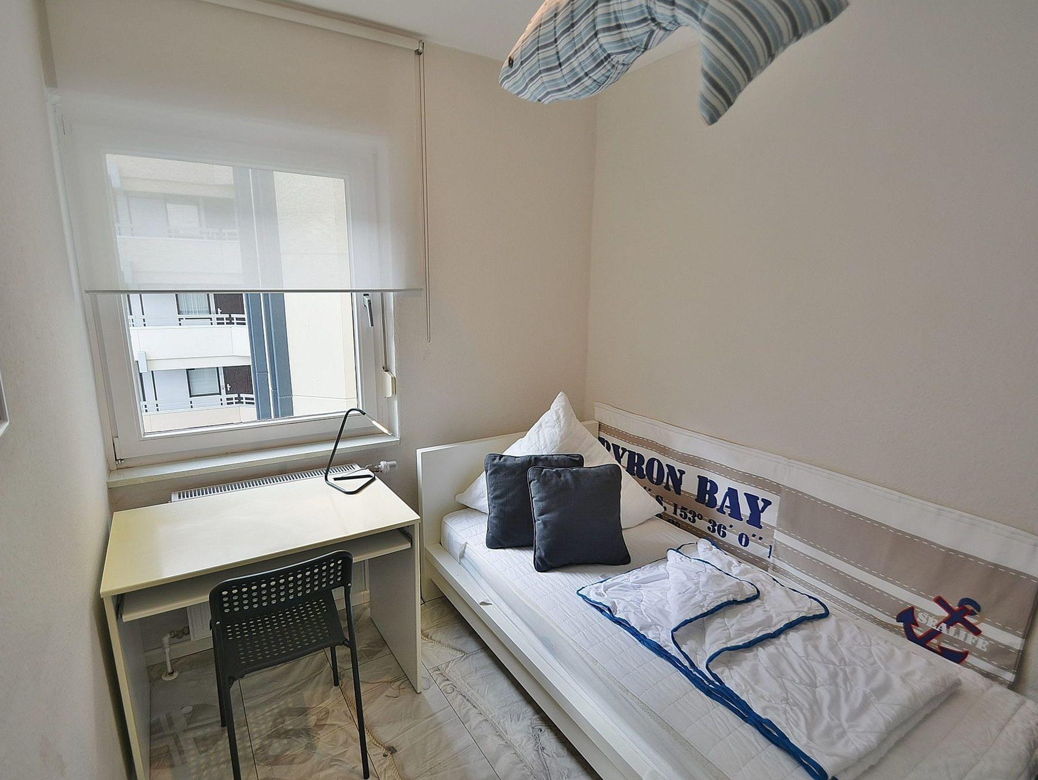 Das modern eingerichtete Kinderzimmer ist mit einem Einzelbett (90x200cm), einem Schreibtisch mit Stuhl und einem kleinen Schrank ausgestattet. Das Kinderzimmer ist mit Laminatboden ausgelegt.