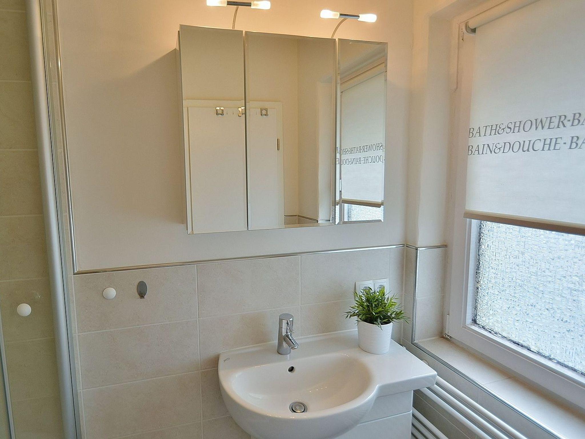 Modernes, hochwertiges, gefliestes Tageslichtbad mit Dusche, Waschbecken und WC.