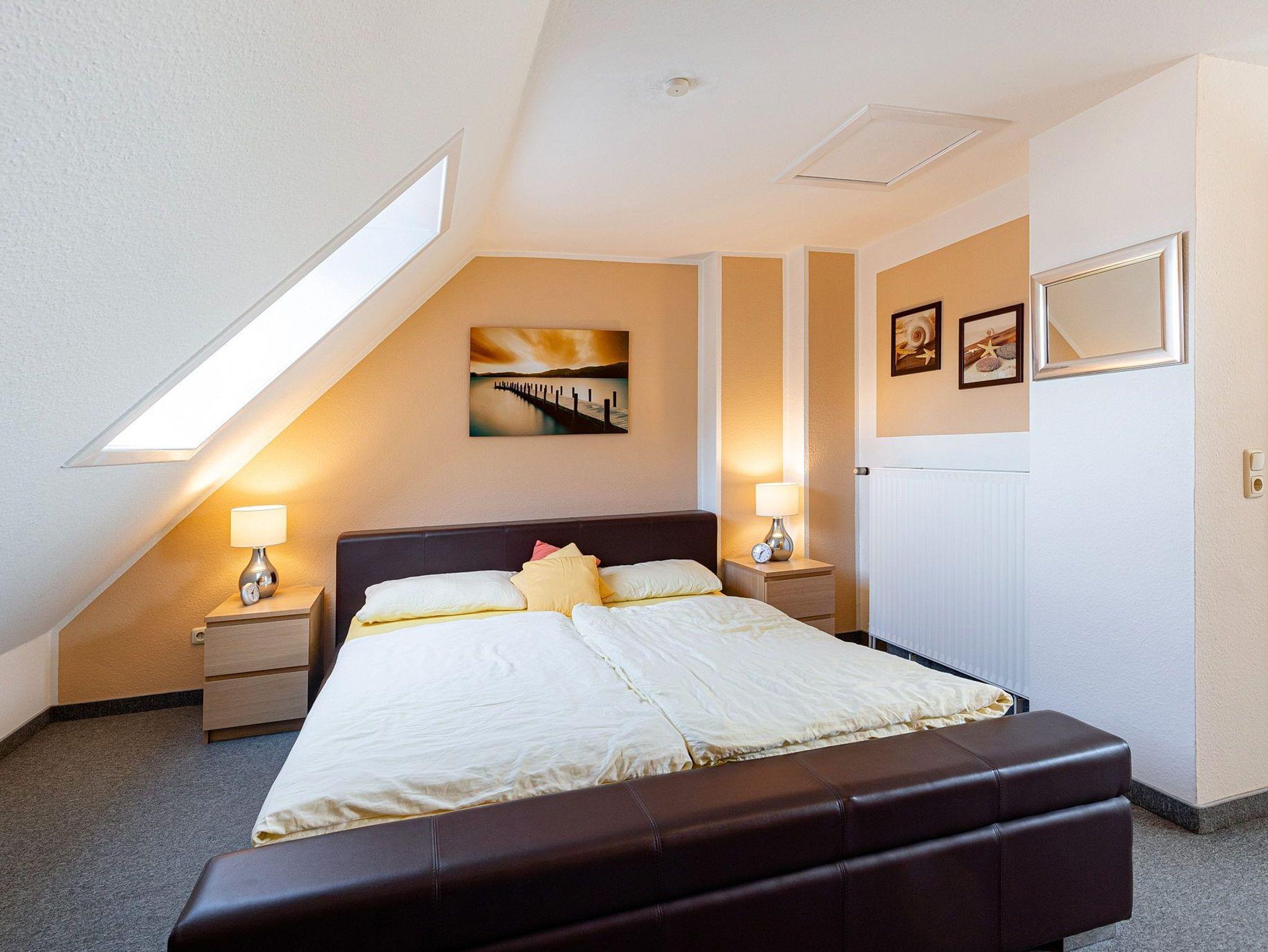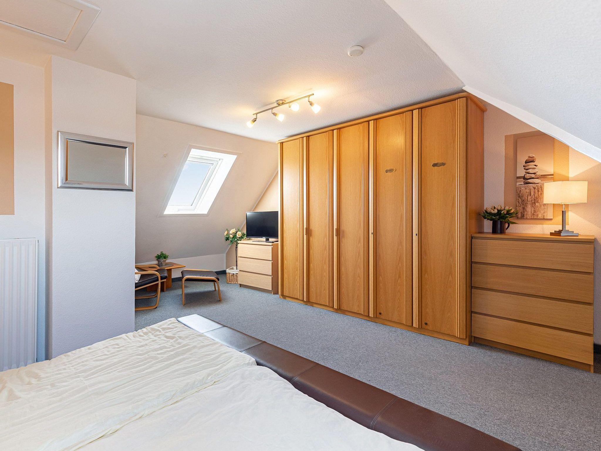 Geräumiges Schlafzimmer in der oberen Etage mit einem Doppelbett (2x 90x200cm), einem 3-türigen Kleiderschrank (ca. 1,50m x 2,20m), 2 Kommoden und gemütlichen Fernsehecke mit Sessel + Hocker. Zur Unterhaltung steht ein 40-Zoll-Smart TV zur Verfügung. Das Schlafzimmer ist mit Teppichboden ausgelegt. Die Dachfenster lassen sich durch elektrische Außenjalousien vollständig verdunkeln. Teilseeblick.