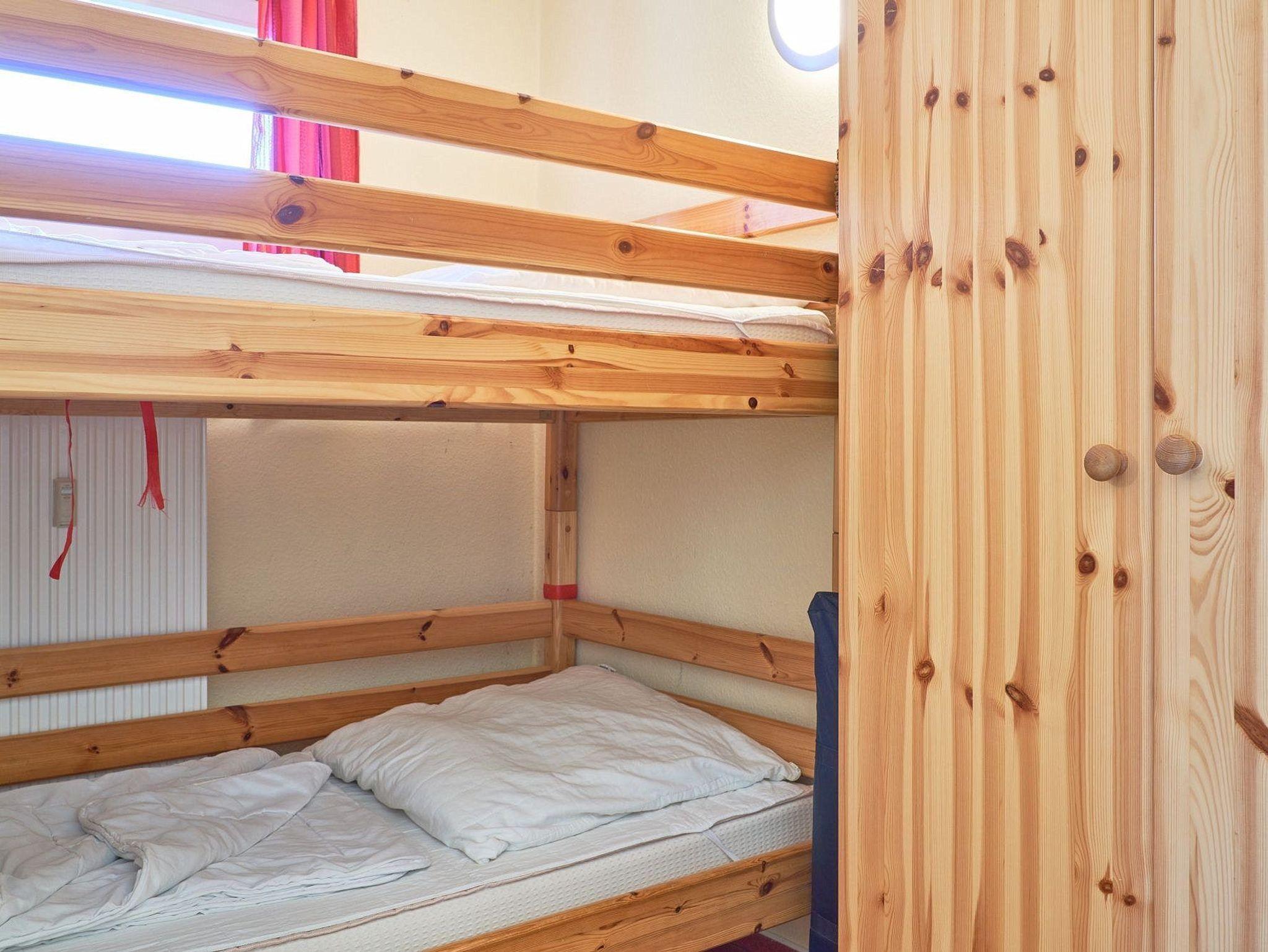 Kleines, separates Kinderzimmer mit Fenster. Das Kinderzimmer ist mit einem Hochbett (80 x 200cm) und einem kleinen Kleiderschrank ausgestattet. Das Kinderzimmer ist mit Teppichboden ausgelegt; das Fenster lässt sich durch einen Vorhang etwas verdunkeln.