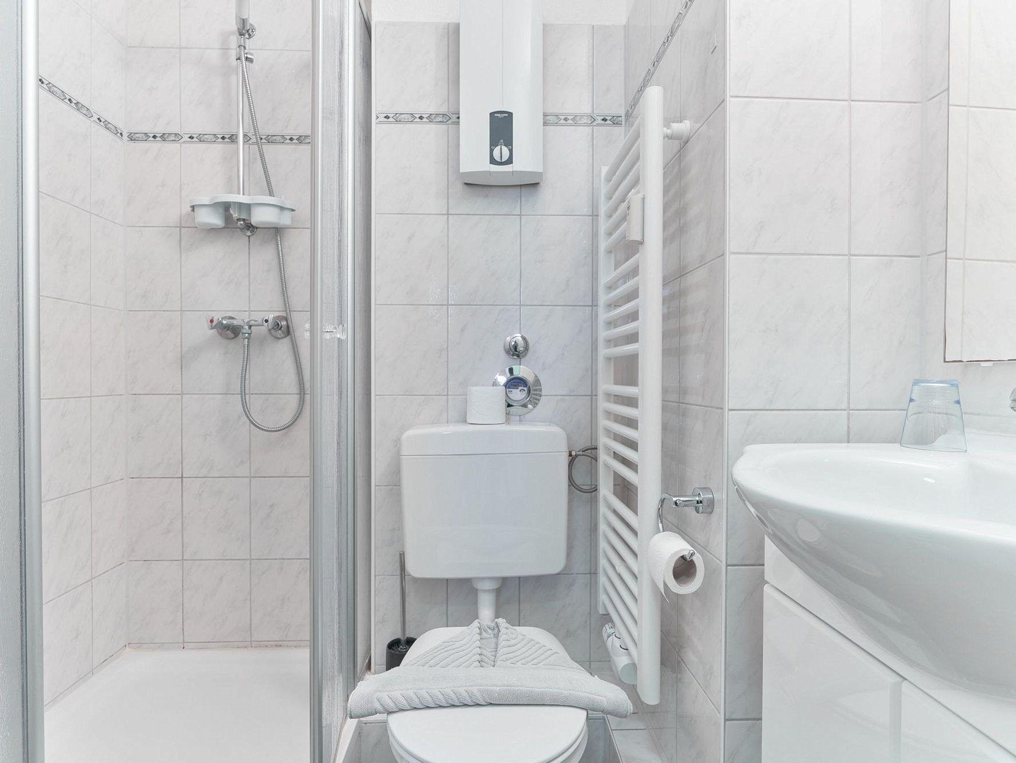 Modernes, hell gefliestes, kleines Bad mit Dusche, Toilette und Waschbecken.