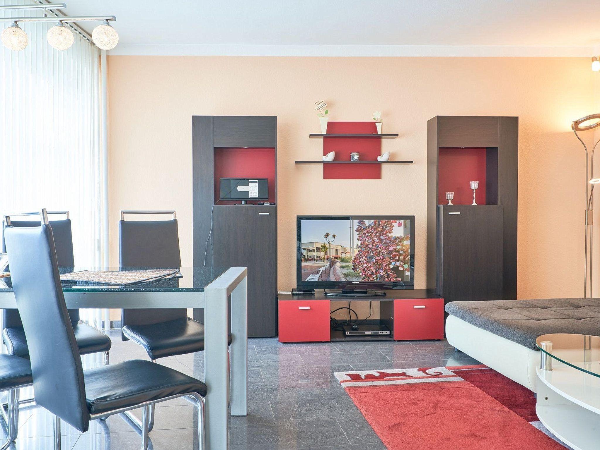 Modernes, helles, gefliestes Wohn- und Esszimmer mit offener Küche. Das Wohn- und Esszimmer ist einem Esstisch mit 4 Stühlen, einer Schlafcouch und einem Wohnzimmerschrank ausgestattet. Zur Unterhaltung stehen ein Flachbildschirm, ein DVD-Player und ein Radio mit CD-Player zur Verfügung. Vom Wohn- und Esszimmer direkter Zugang zum Balkon. Das Fenster lässt sich durch einen Lamellenvorhang etwas verdunkeln.
