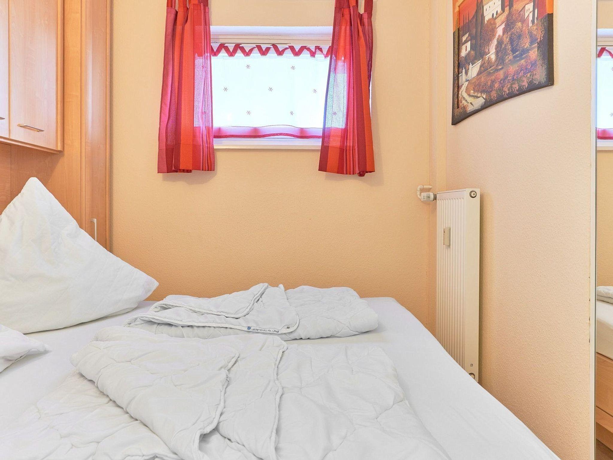 Separates Schlafzimmer mit Fenster. Das Schlafzimmer ist mit einem Doppelbett (2x 80 x 200cm) ausgestattet. Das Fenster lässt sich durch einen Vorhang etwas verdunkeln. Das Schlafzimmer ist mit Teppichboden ausgelegt. Im Flur befindet sich ein kleiner Schrank in dem Kleidungsstücke aufgehängt werden können.