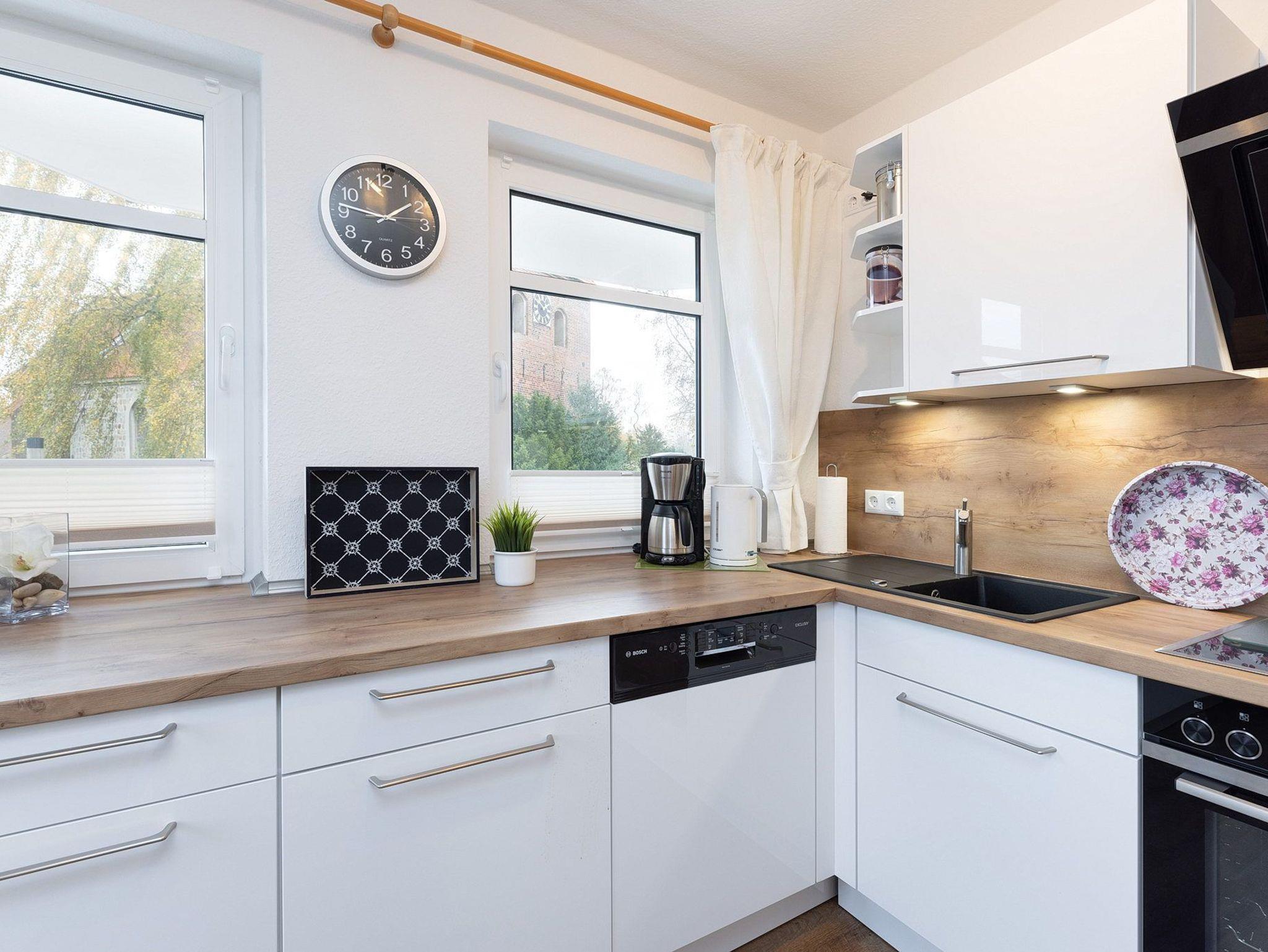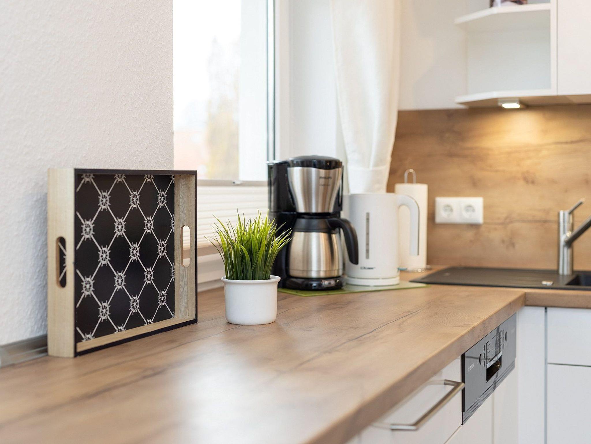 Komplett ausgestattete offene Küche mit 4-Platten-Cerankochfeld, Backofen, Spülmaschine, Kühlschrank und einem großen Gefrierfach. Eine Kaffeemaschine, ein Wasserkocher, eine Mikrowelle und ein Toaster stehen ebenfalls zur Verfügung.