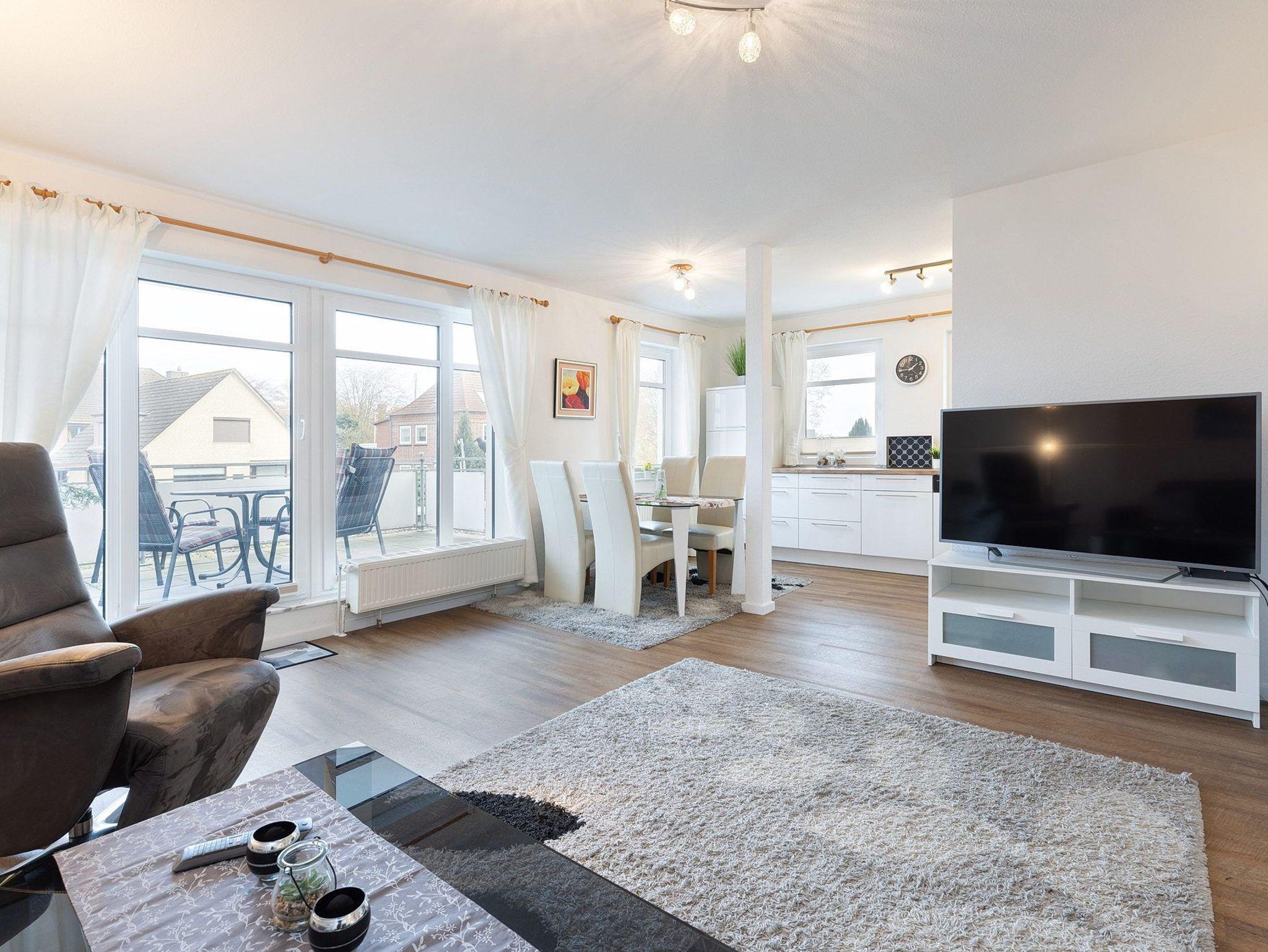 Heller, freundlicher, großzügiger Wohn- und Essbereich mit direktem Zugang zum Balkon. Der Raum verfügt über ein hochwertiges Lederschlafsofa (140x200cm), 2 Relax-Sessel sowie einen Essplatz für 4 Personen. Zur Unterhaltung stehen ein 55-Zoll Smart-TV und ein Internet-Radio zur Verfügung. Der Wohnbereich ist mit Vinyl Planken ausgelegt und lässt sich durch Plissees blickdicht verdunkeln.