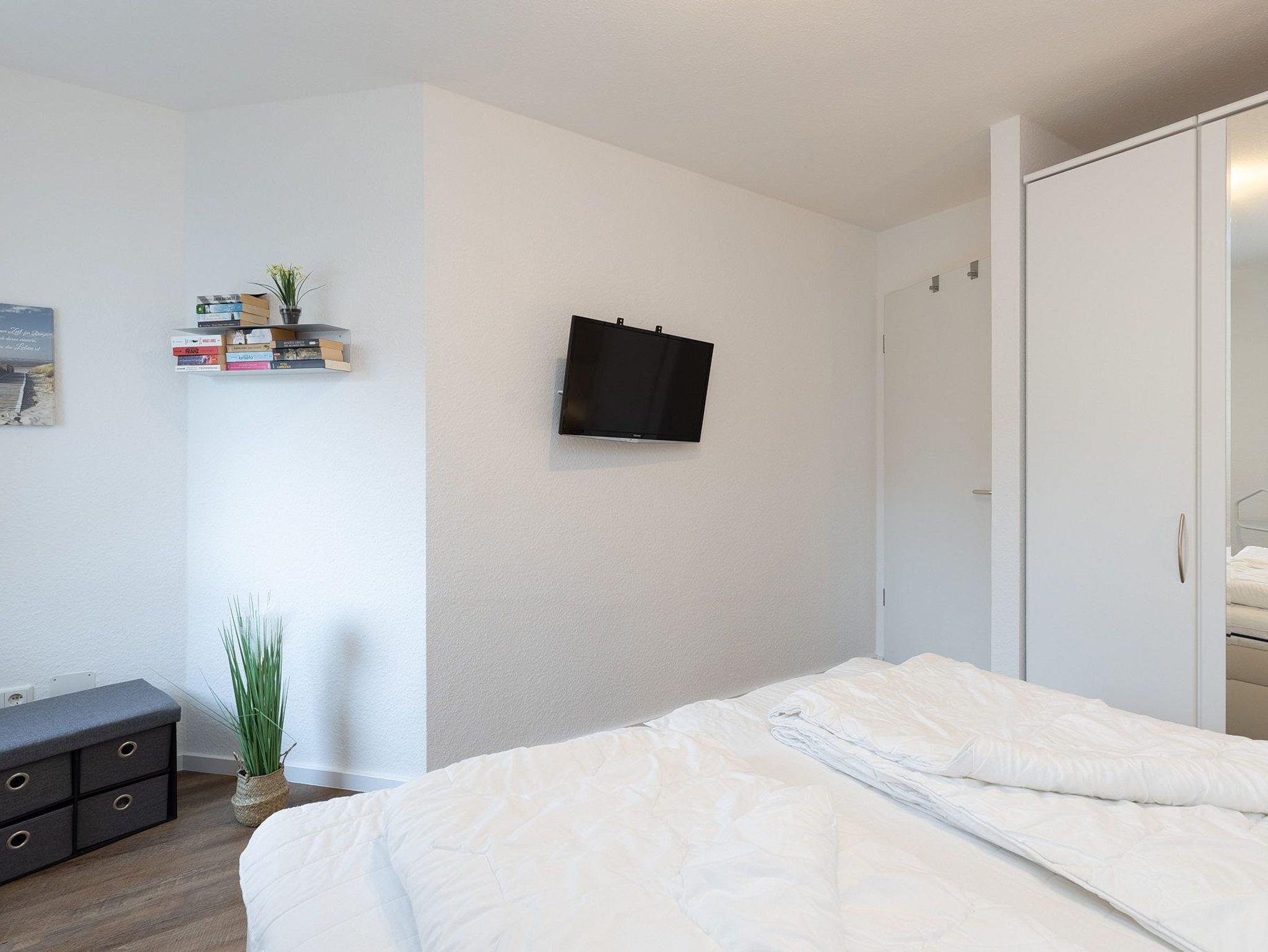 Das Schlafzimmer ist mit einem Doppelbett (2x80x200cm) und einem großen 4-türigen Kleiderschrank ausgestattet. Auch hier steht ein wandmontierter verstellbarer TV zur Unterhaltung bereit. Der Schlafbereich ist mit Vinyl Planken ausgelegt und lässt sich durch ein Plissee verdunkeln.